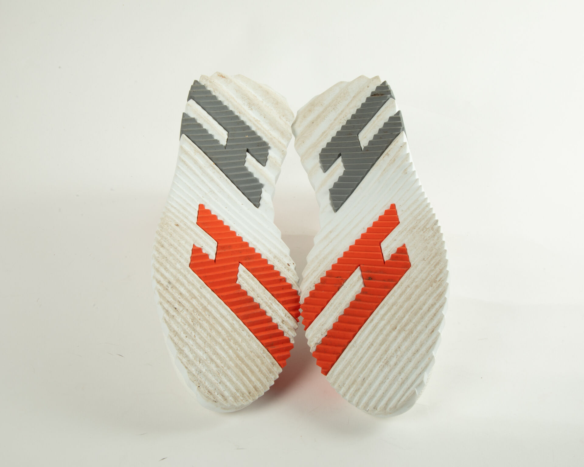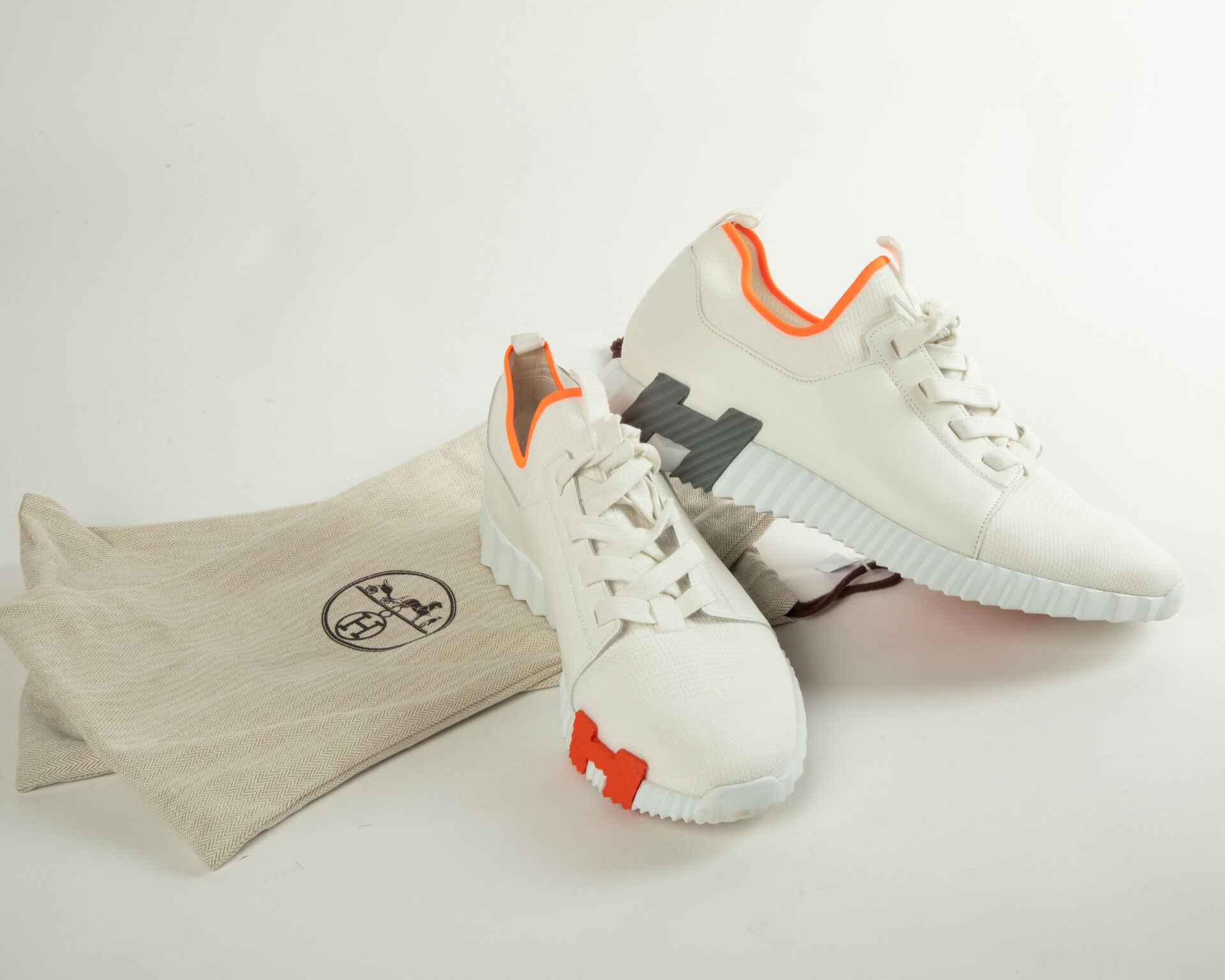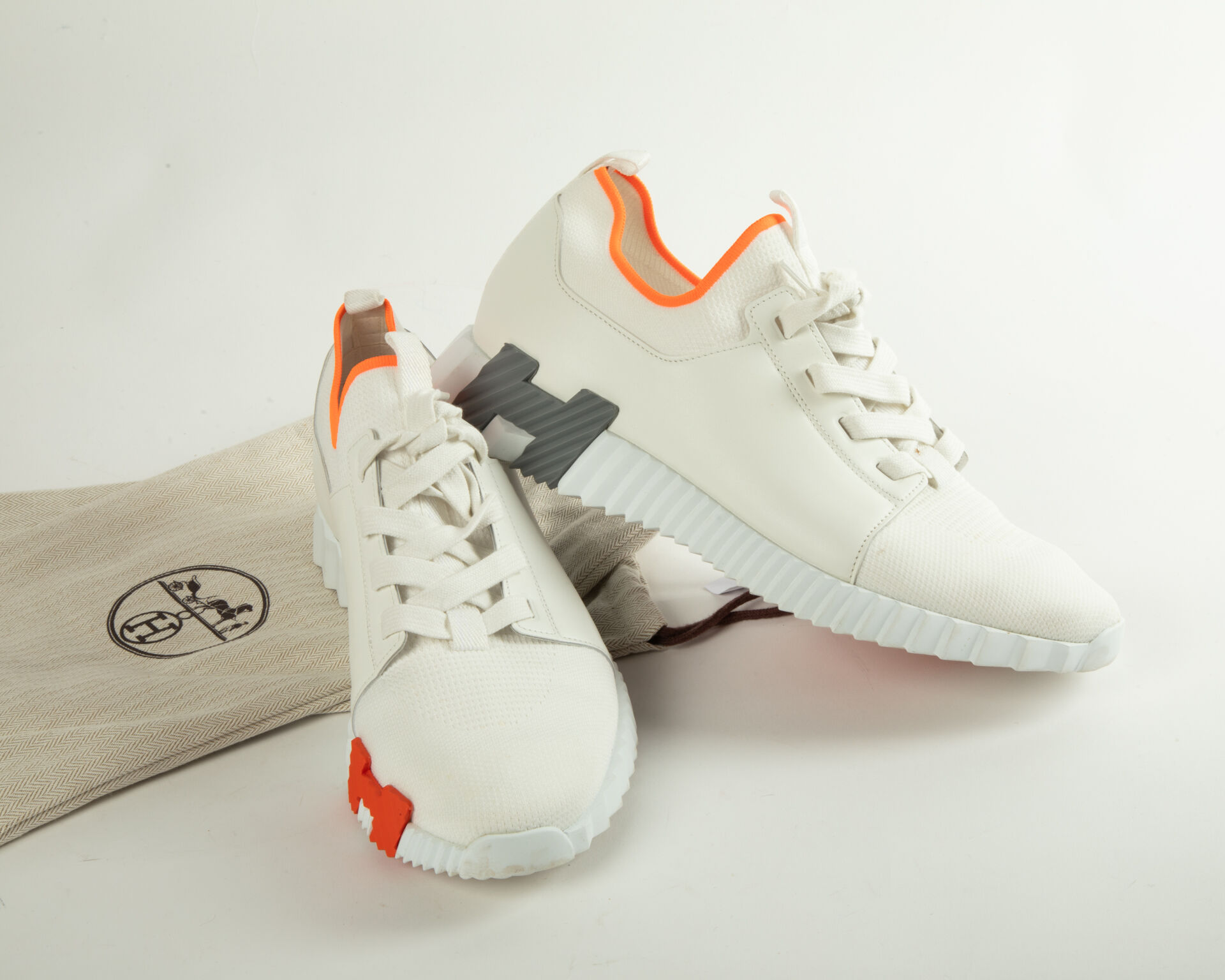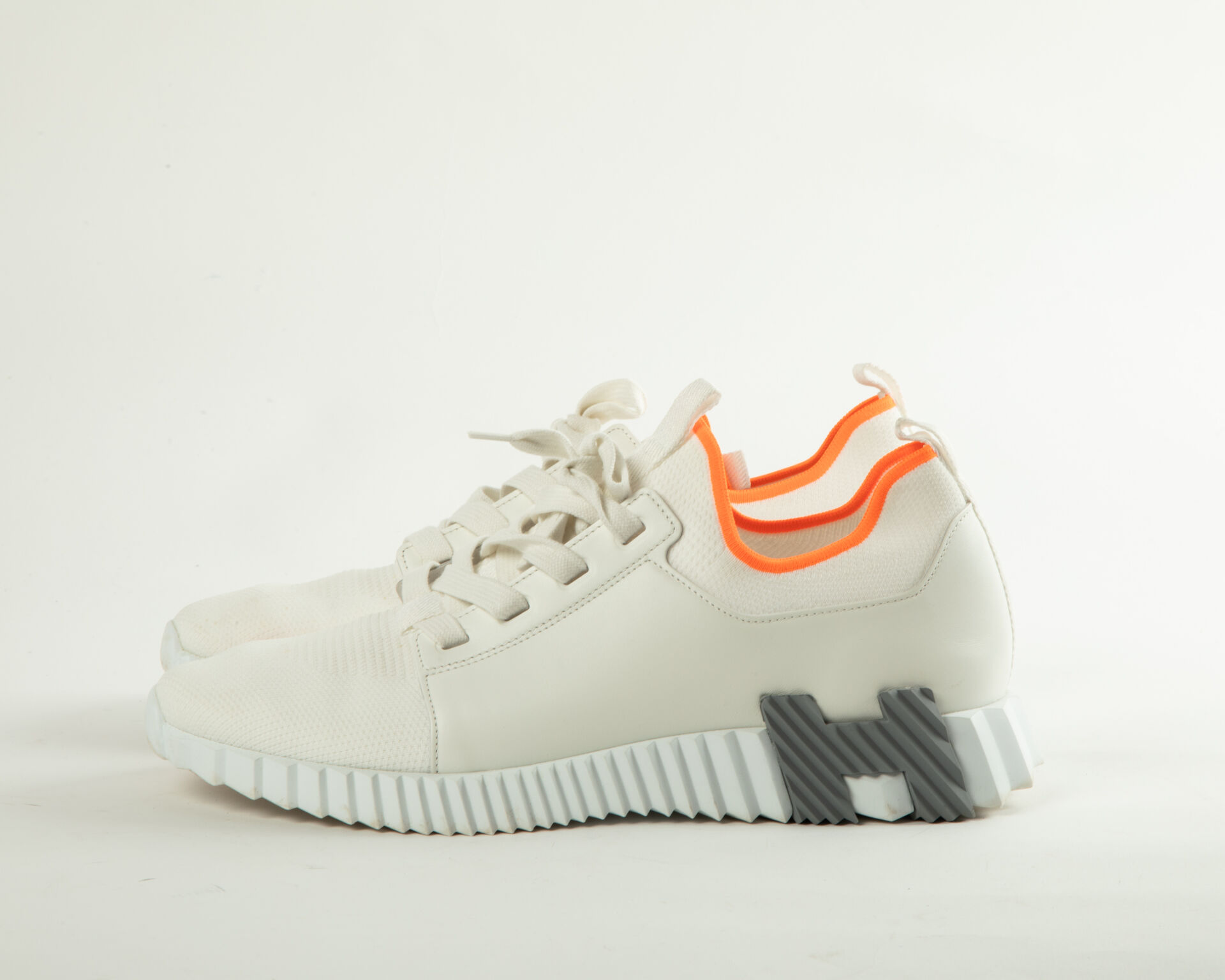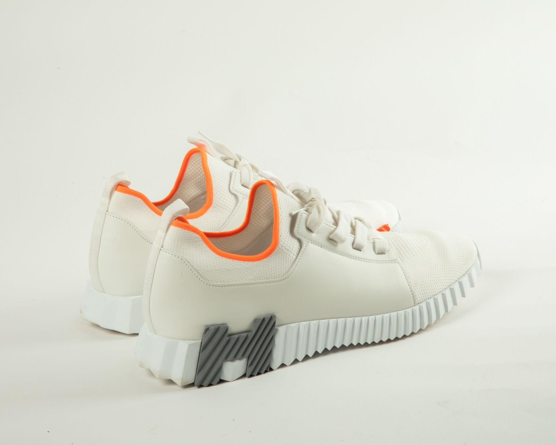 Modèle Bouncing – Paire de baskets en cuir et tissus blanc, la cheville surlignée d’un liseré orange, semelle crantée à H orange et gris