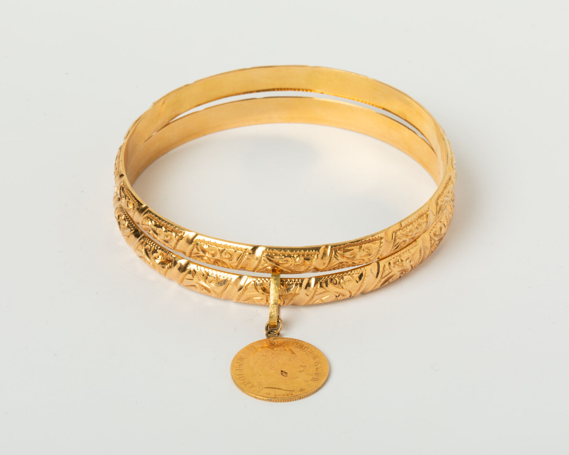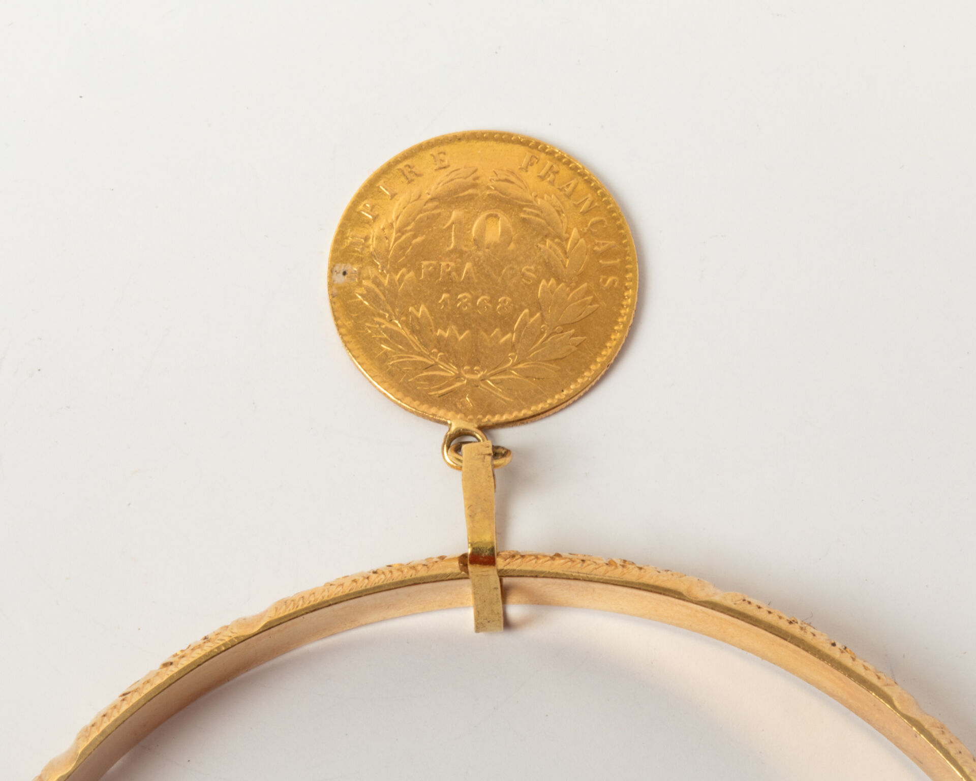 12 ESTIMATION: 1500 / 1600 € Ensemble de deux joncs en or jaune (750 millièmes) gravés d’entrelacs, l’un avec une pendeloque formé d’une pièce de 10 francs or Napoléon tête laurée de 1868 D. intérieur : 6.5 cm Poids : 30 g