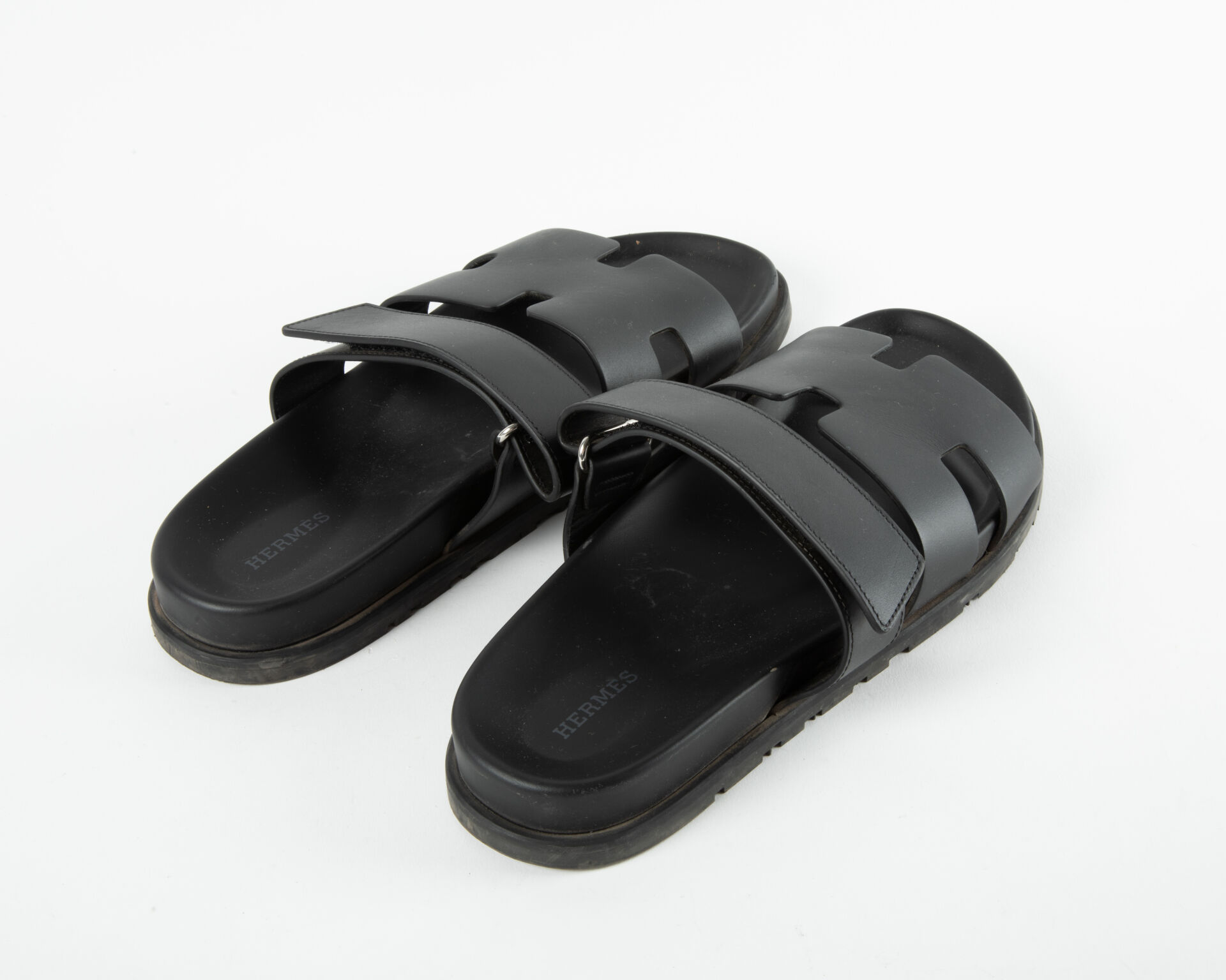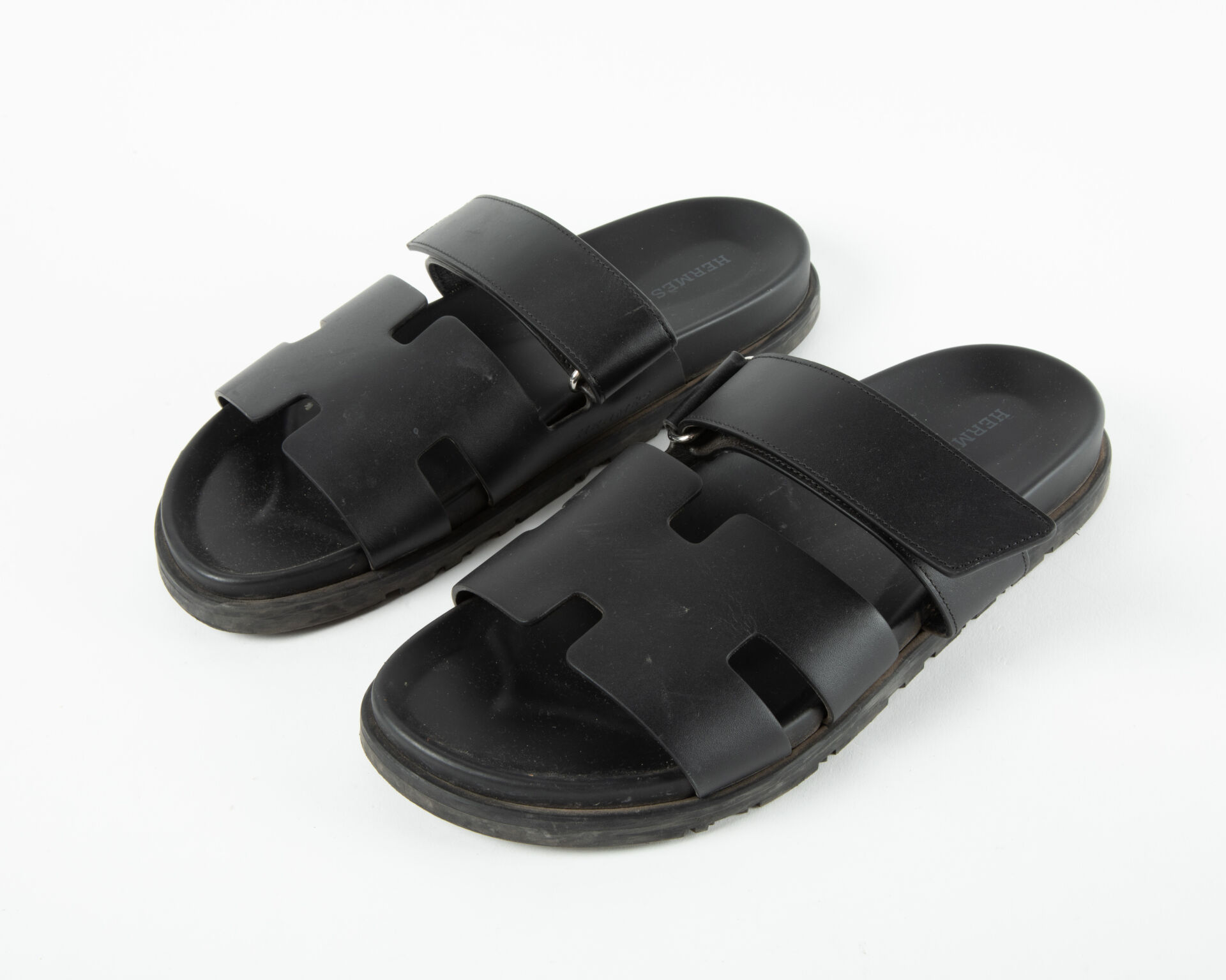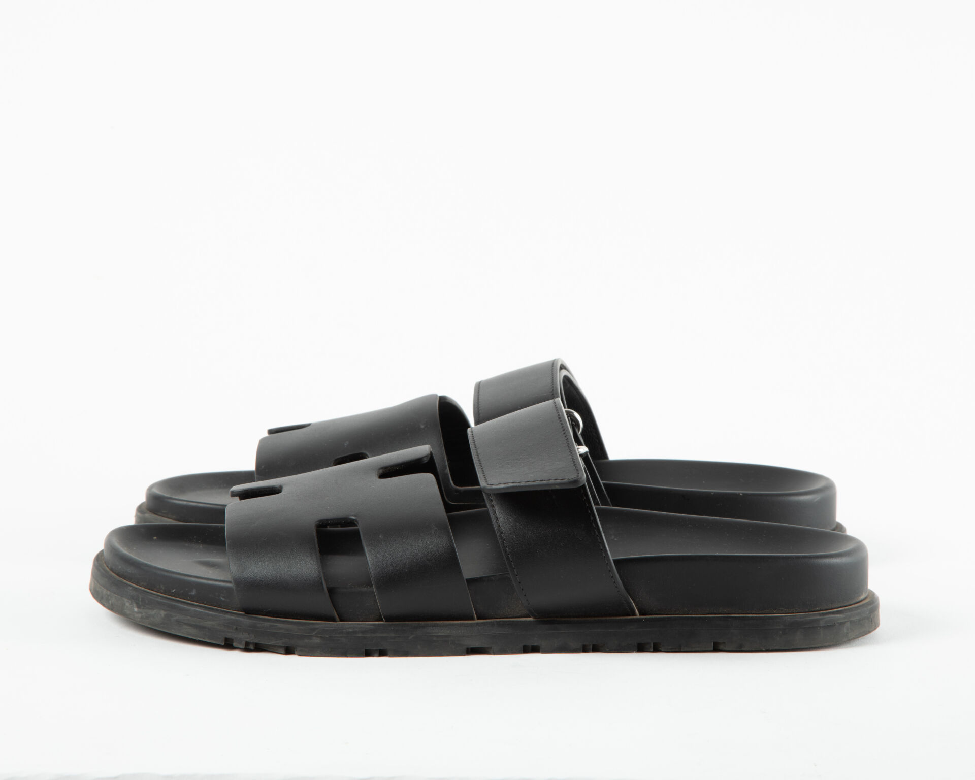 Modèle Chypre – Paire de sandales en cuir de veau noir lisse, semelle anatomique en gomme et lanière ajustable à scratch
