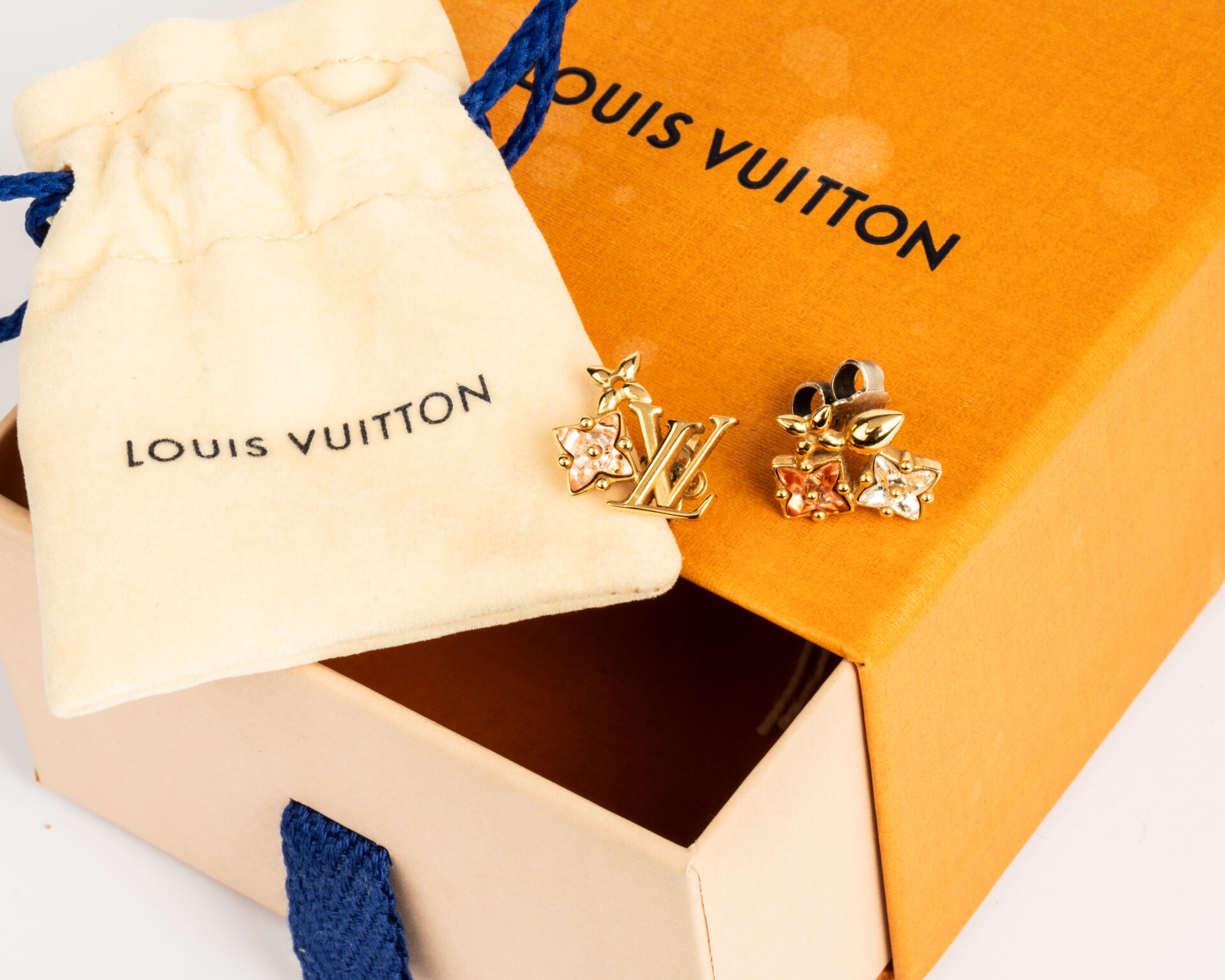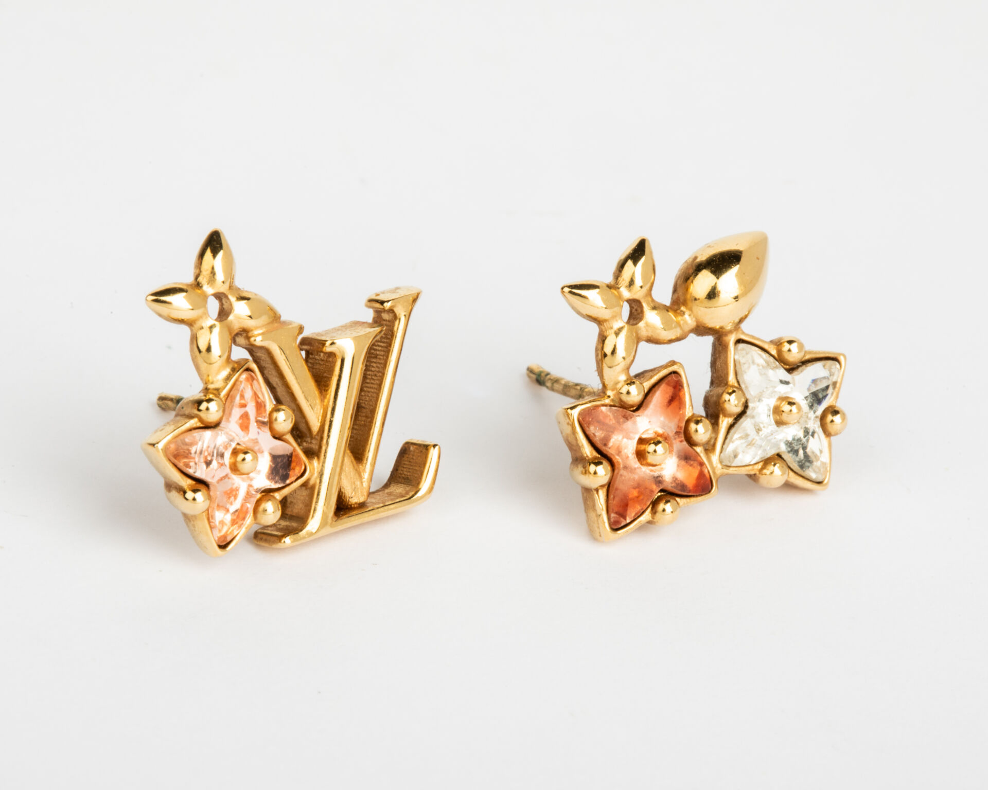 128 ESTIMATION: 60 / 100 € LOUIS VUITTON Modèle Stard Blossom – Paire de boucles d’oreilles en métal doré serties de pierres incolores et roses. Numérotées Un poussette remplacée Dans une boite et un dustbag