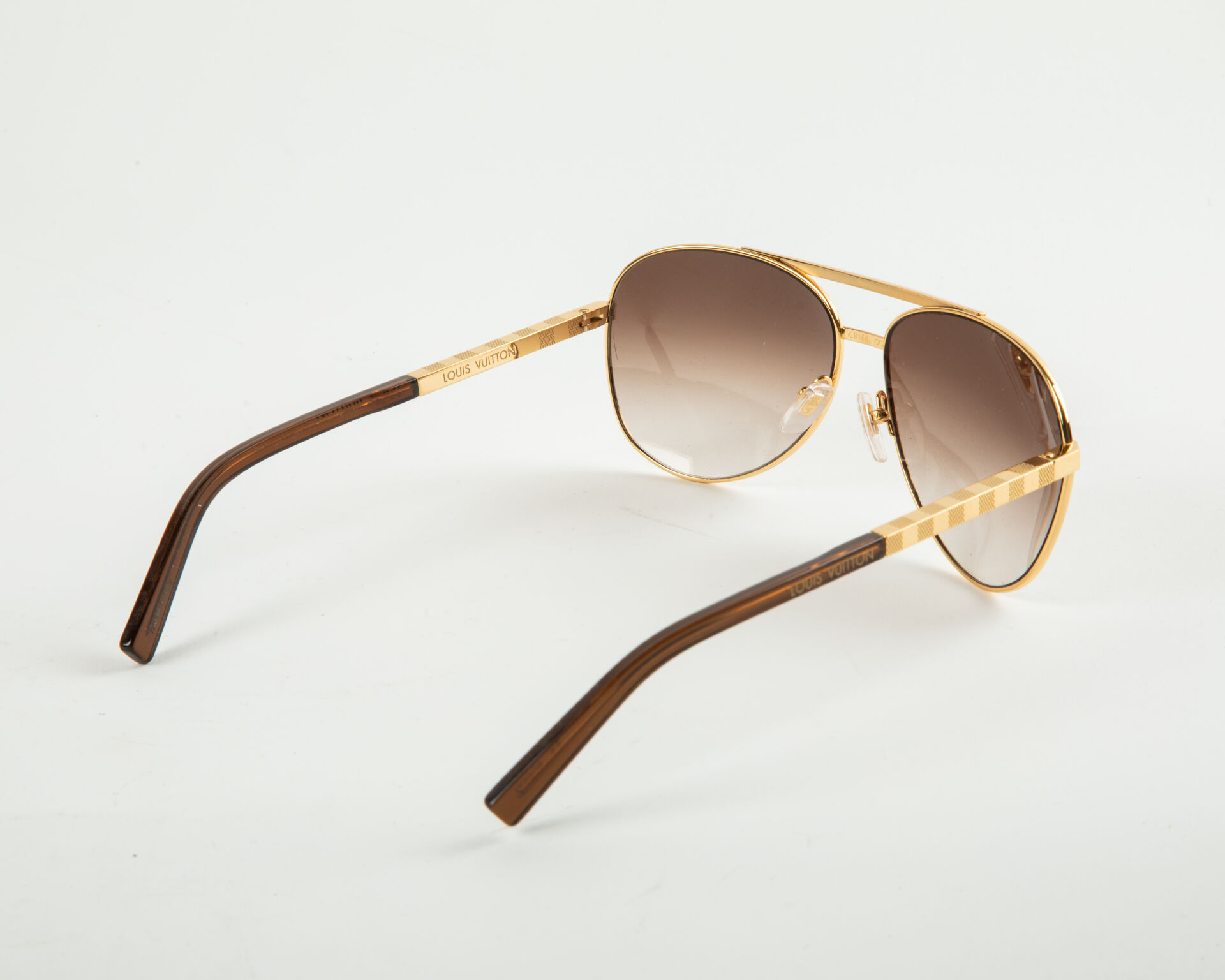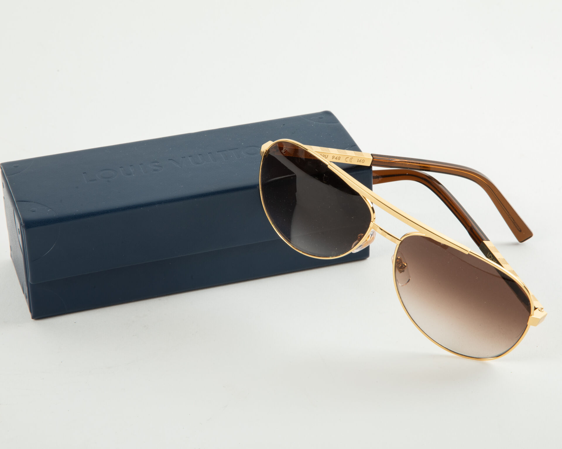 131 ESTIMATION: 60 / 80 € LOUIS VUITTON Modèle Altitude Pilot – Paire de lunettes de soleil modèle aviateur, structure en métal doré, branches partiellement en métal à décor de damier et acétate. Dans leur dustbag et boite