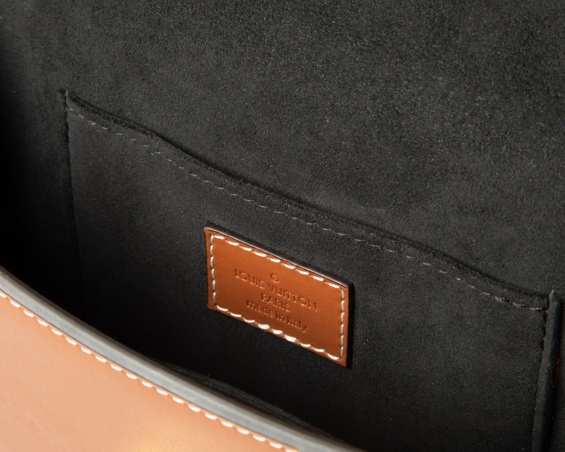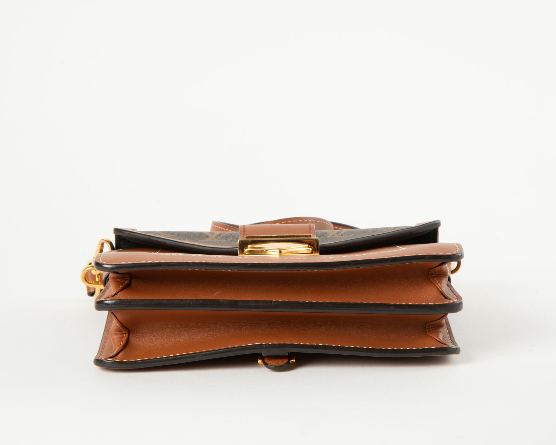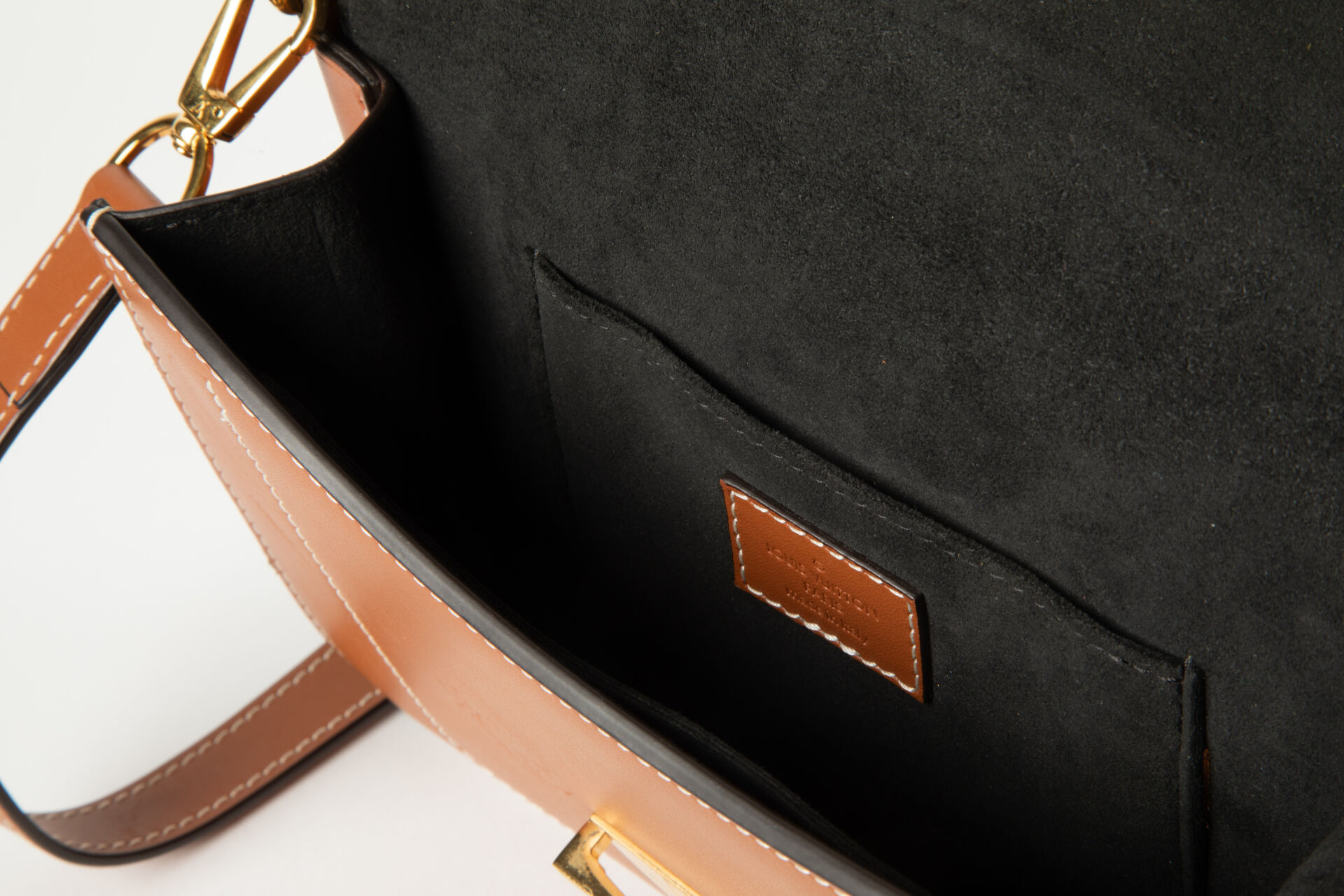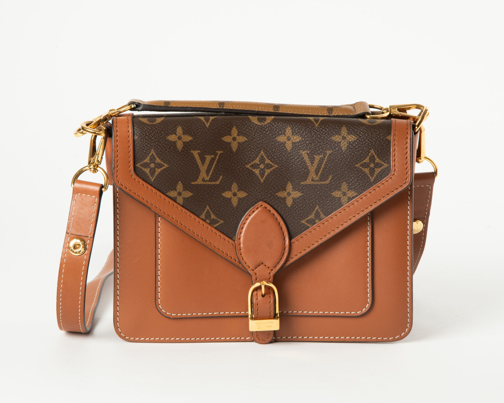 Modèle Two in One – Sac à main en cuir naturel et toile enduite monogram marron et beige à trois soufflets, anse et bandoulière amovibles, accastillage en métal doré. Deux compartiments fermés, l’un par une bride, l’autre fermeture à glissière, doublure en suédine noire à trois poches appliquées.