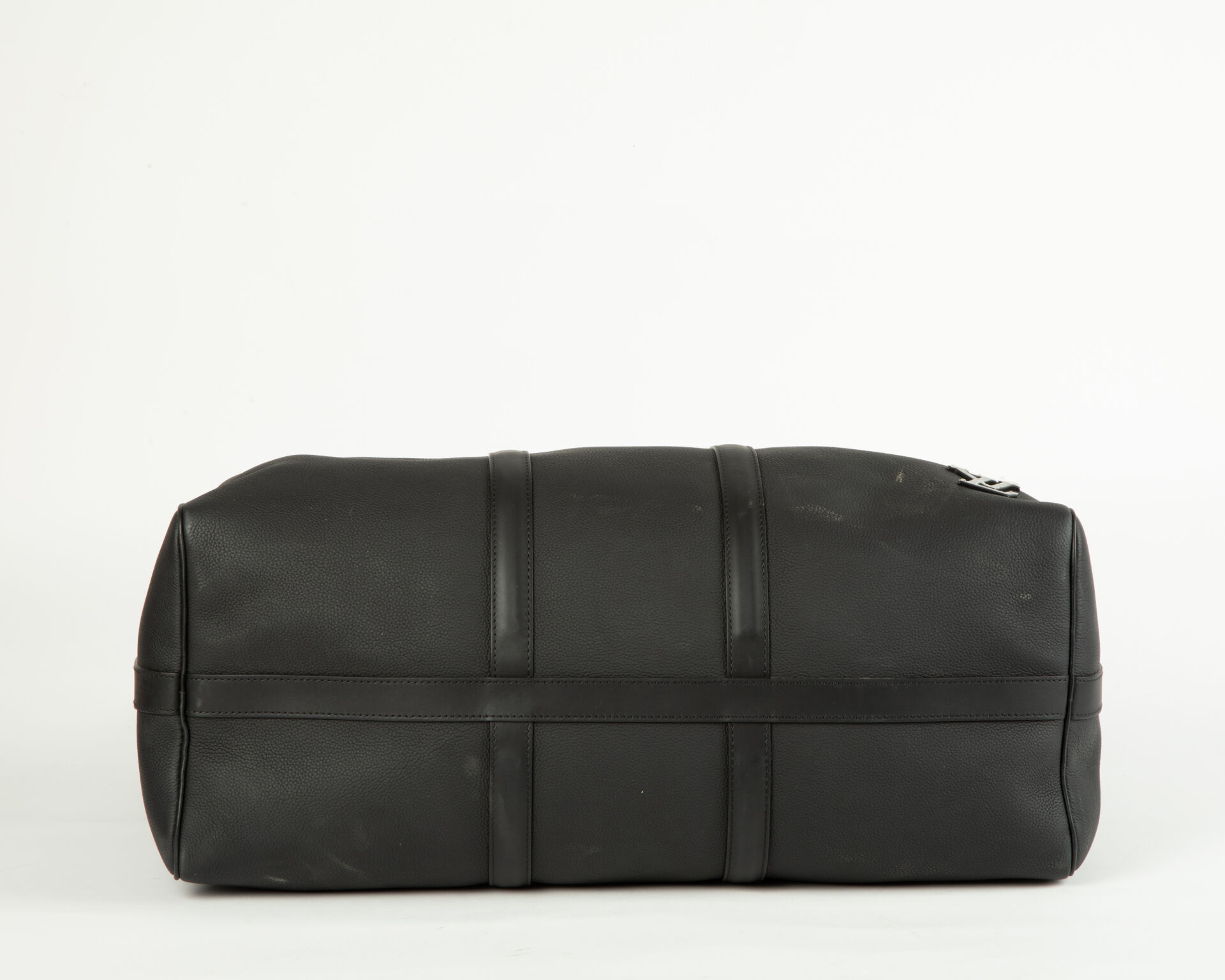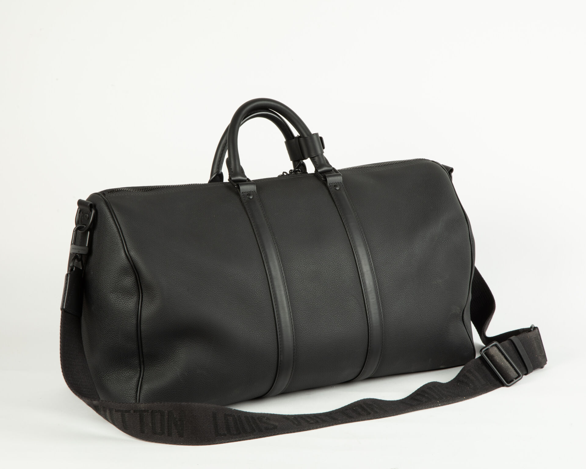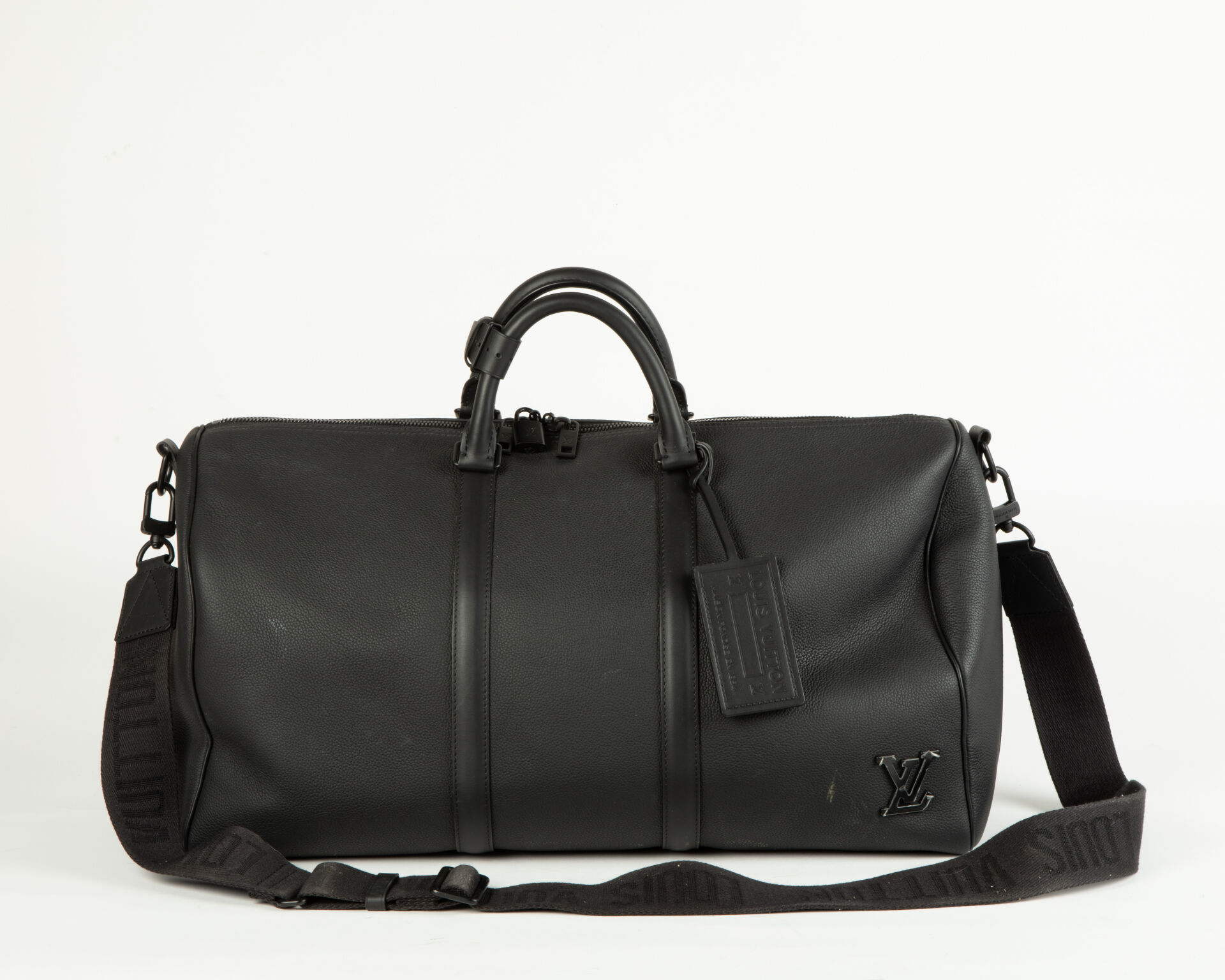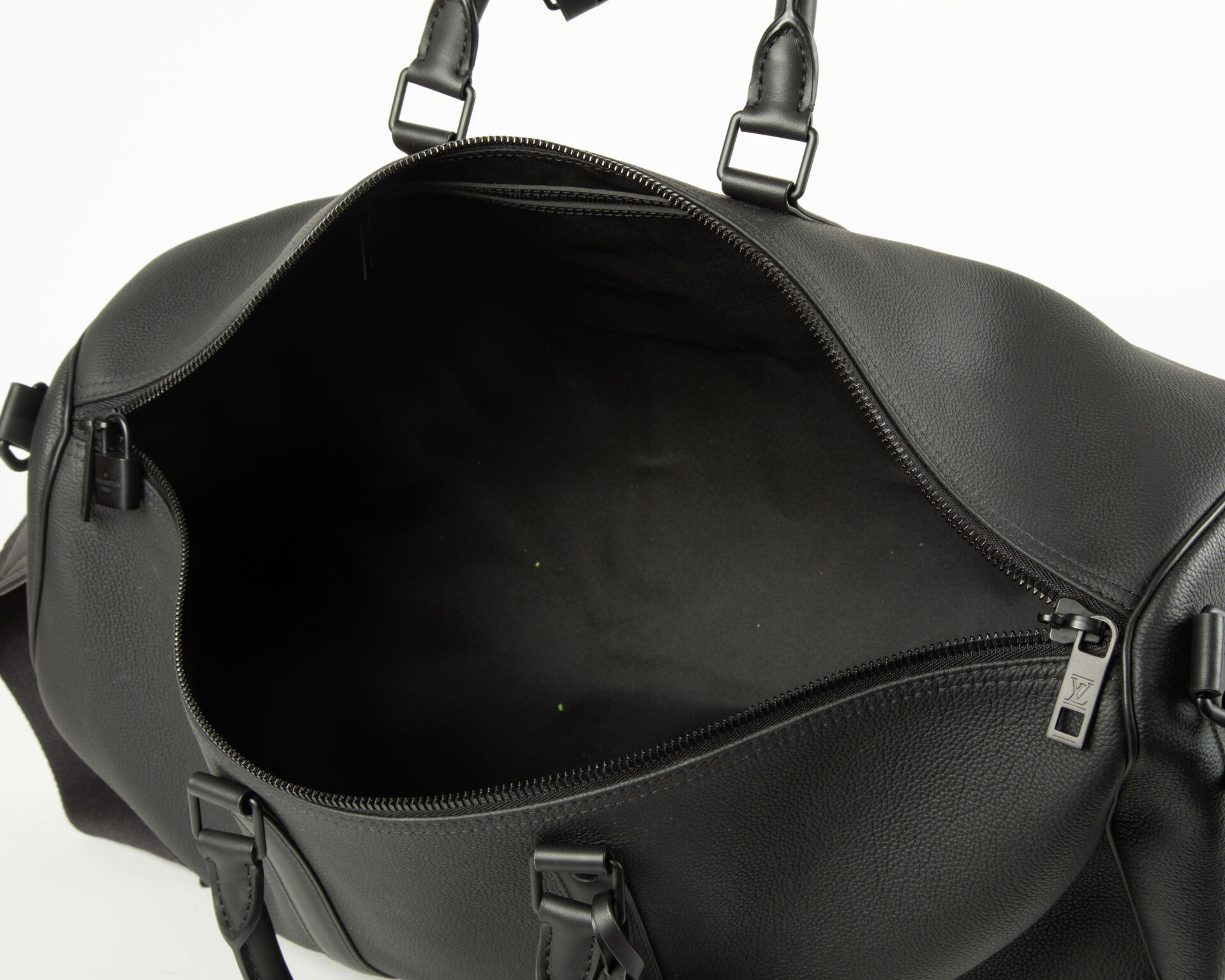 Modèle Keepall – Sac en cuir LV Aerogram et cuir de vache noir à deux anses et bandoulière amovible en jacquard signée, porte-adresse en cuir, accastillage en métal couleur palladium, cadenas, pas de clef, fermeture zippée, doublure en tissus noir, poche intérieure zippée
