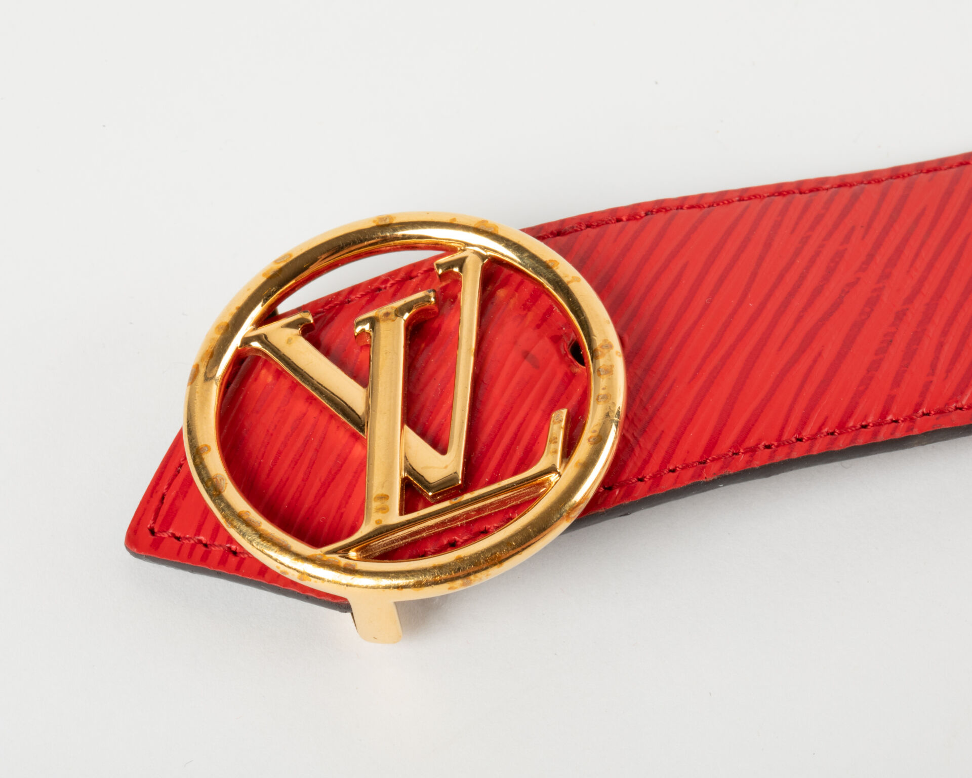 136 ESTIMATION: 50 / 80 € LOUIS VUITTON Ceinture en cuir épi réversible rouge et toile enduite monogram brun, boucle en métal doré au logo LV cerclé Rayures, traces d’oxydation Longueur : 80/32