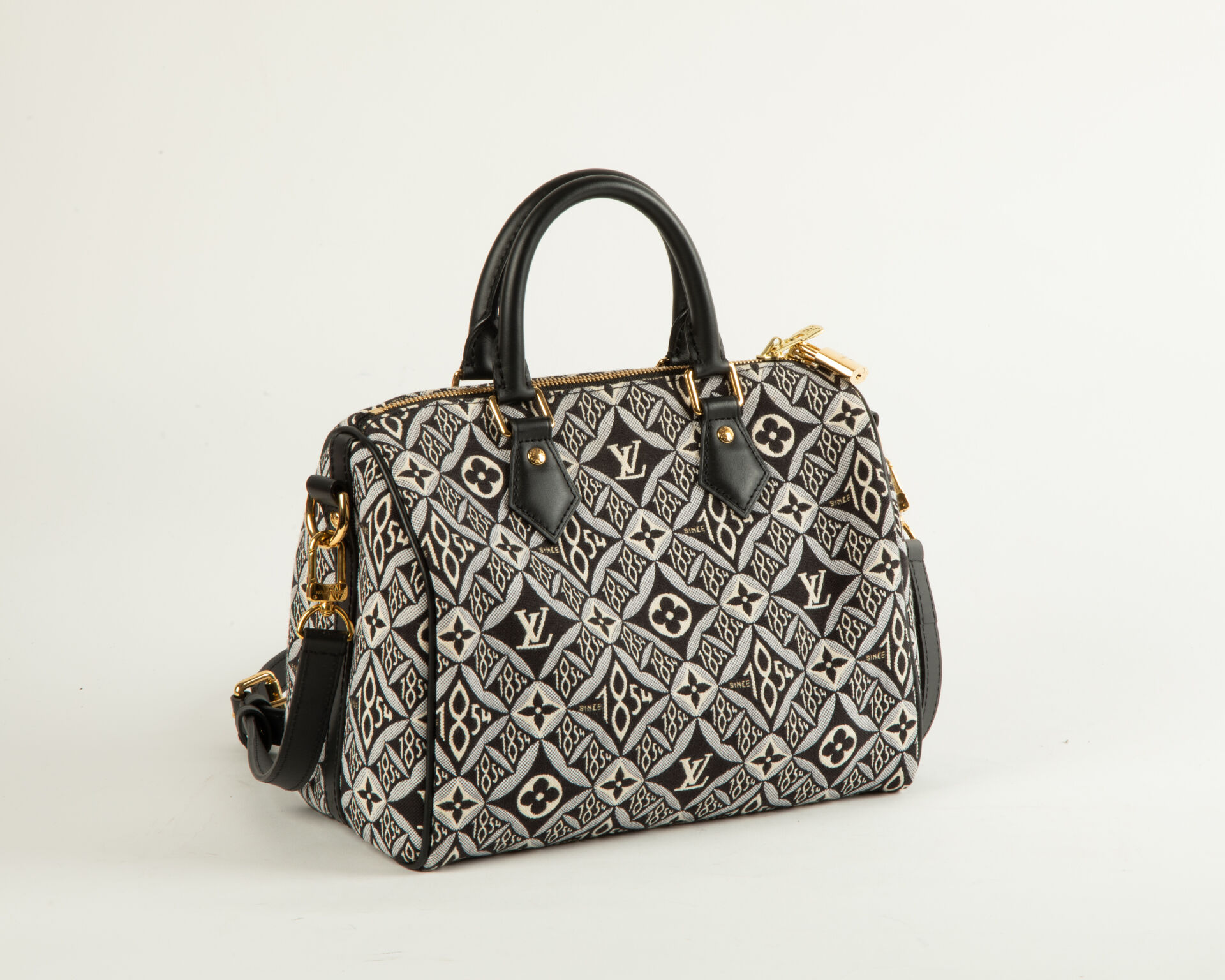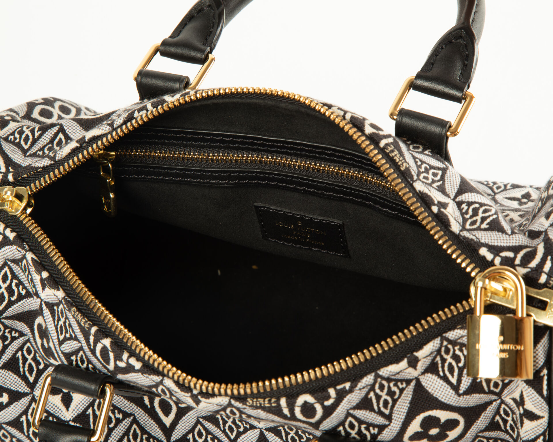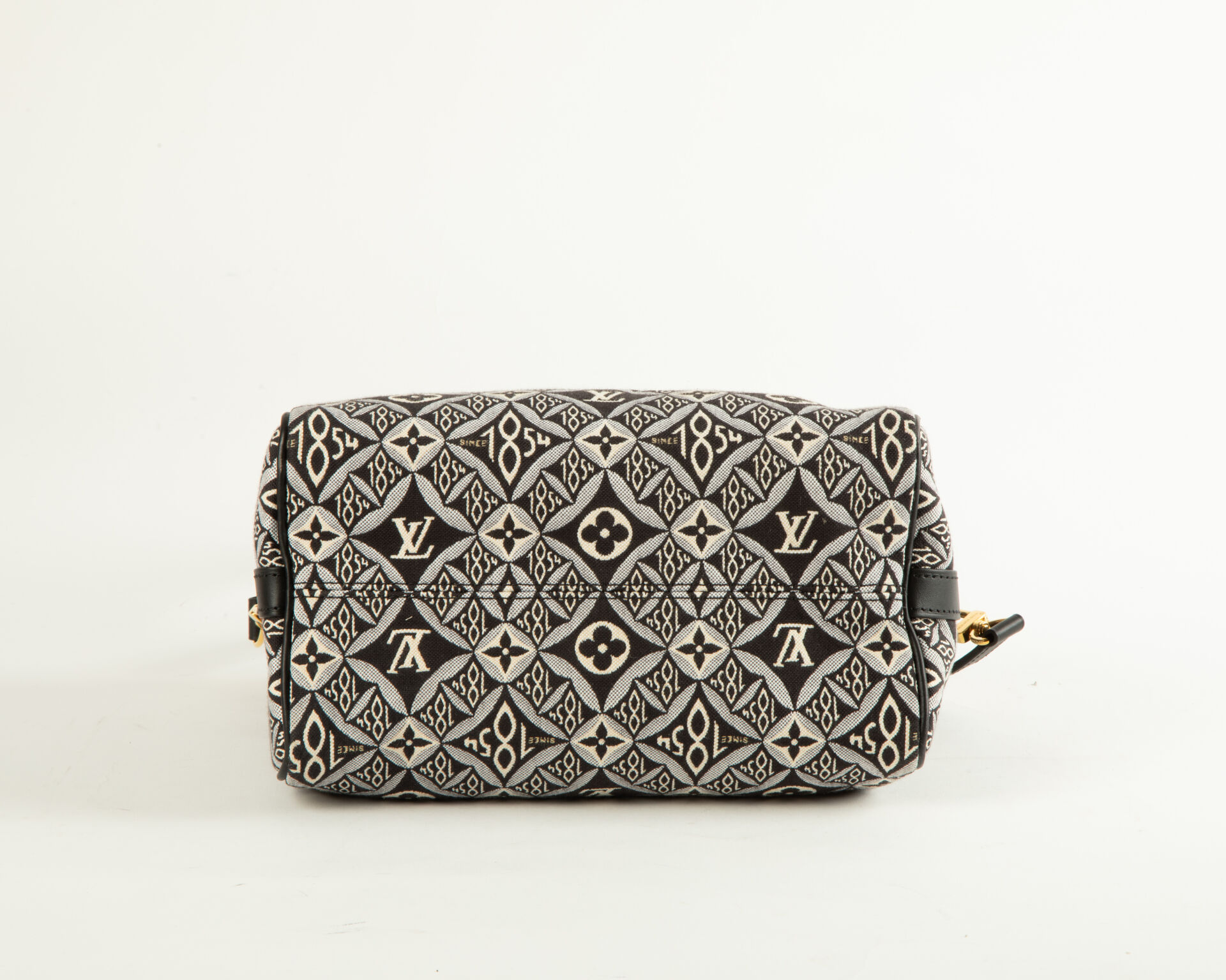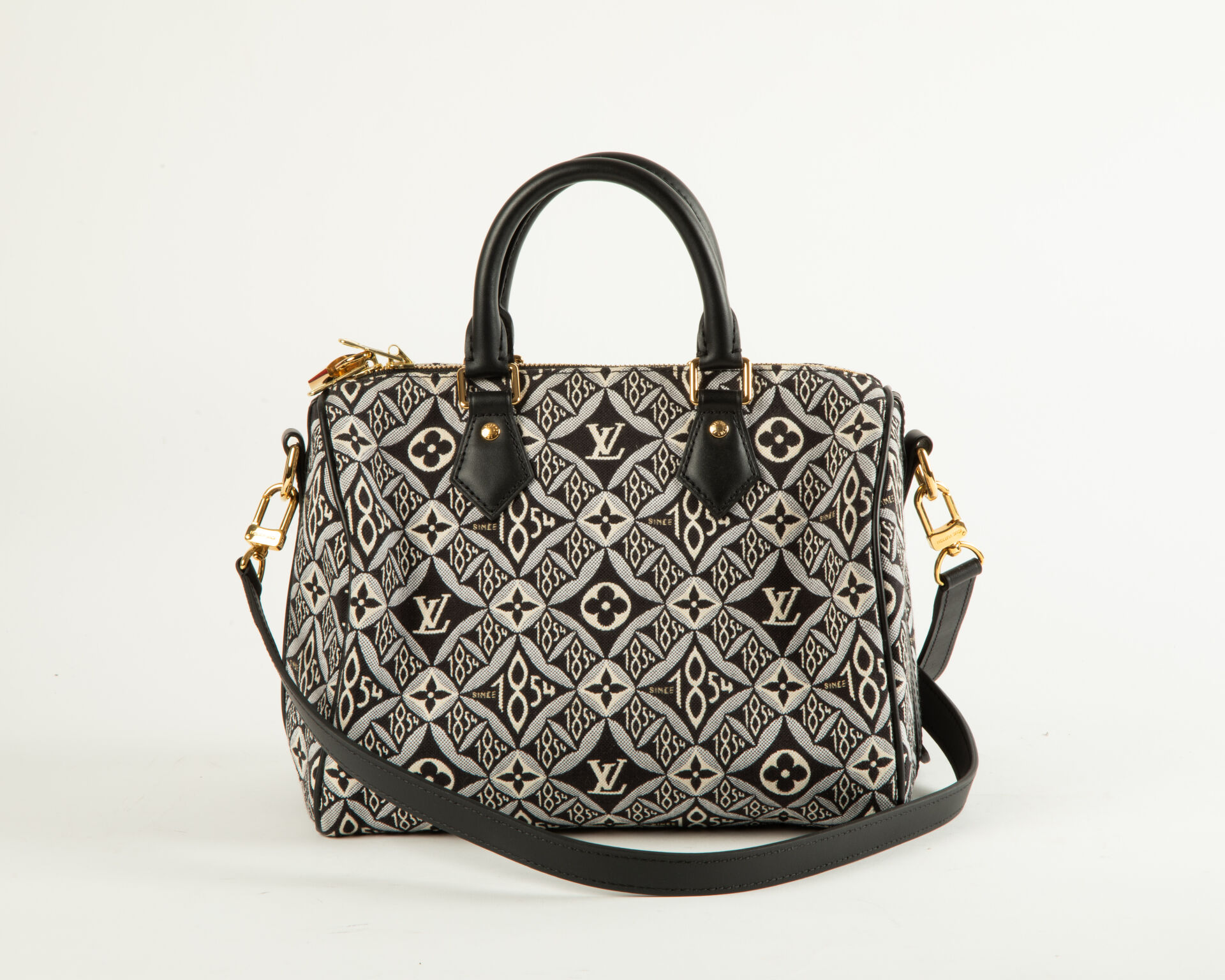Modèle Since 1954 – Sac speedy en toile monogram bleu nuit et blanc et cuir bleu nuit à deux anses et une bandoulière, accastillage en métal doré, cadenas sans clefs, intérieur en suédine noire à une poche appliquée