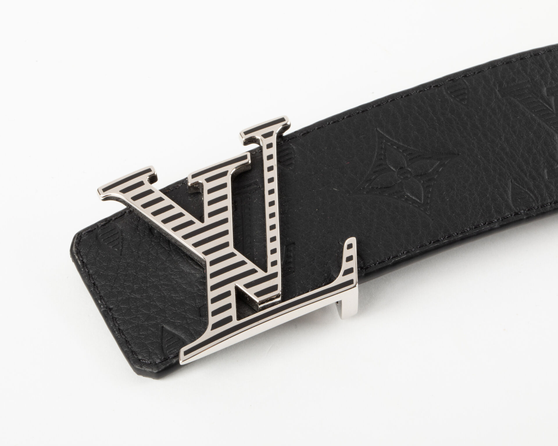 143 ESTIMATION: 100 / 150 € LOUIS VUITTON Ceinture réversible en cuir noir et cuir noir embossé monogram, boucle en métal palladié et émail Taille 110/44 Dans un dustbag