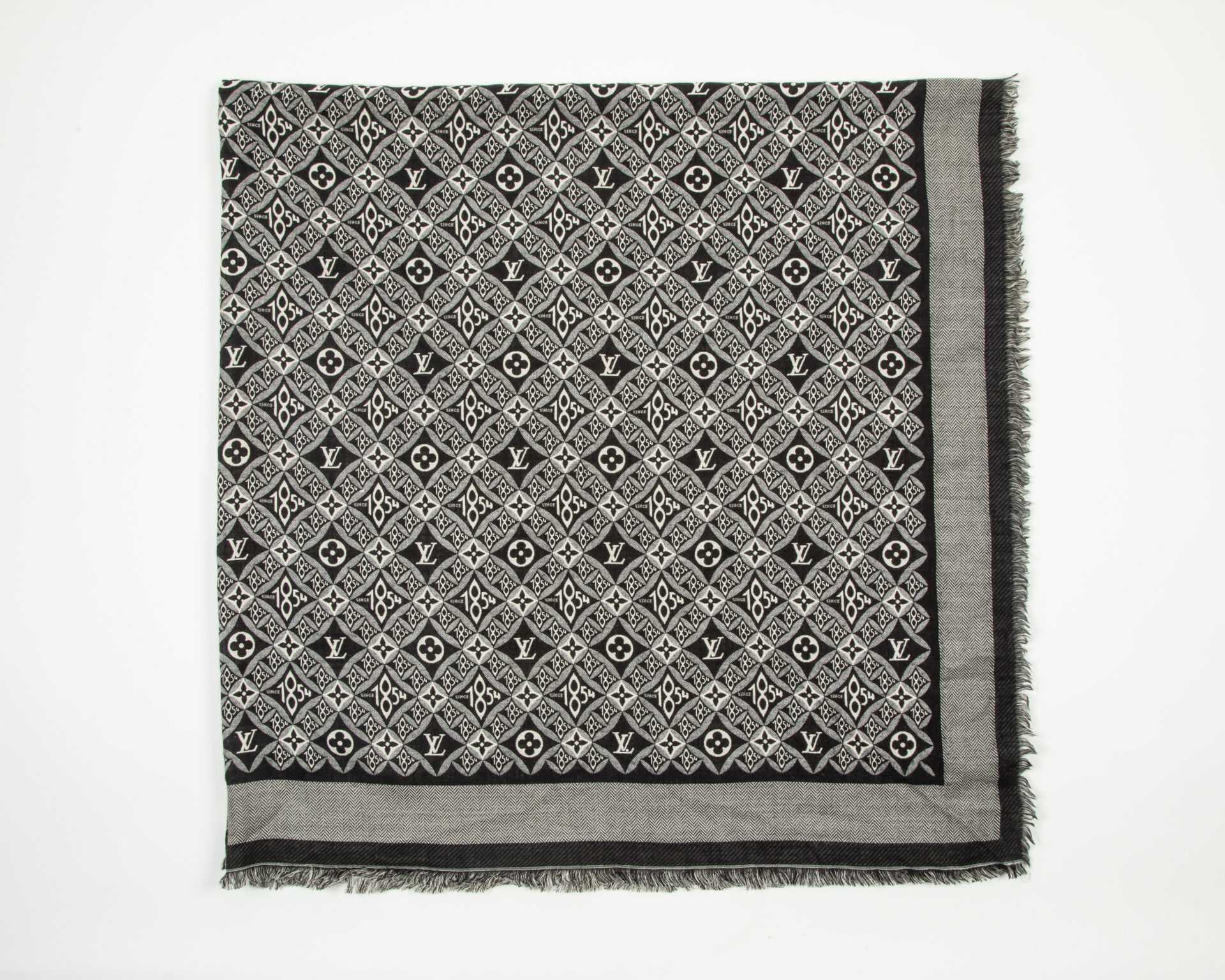 150 ESTIMATION: 120 / 150 € LOUIS VUITTON Modèle Since 1954 – Châle en jacquard monogram since 1854 noir et blanc 135 x 135 cm