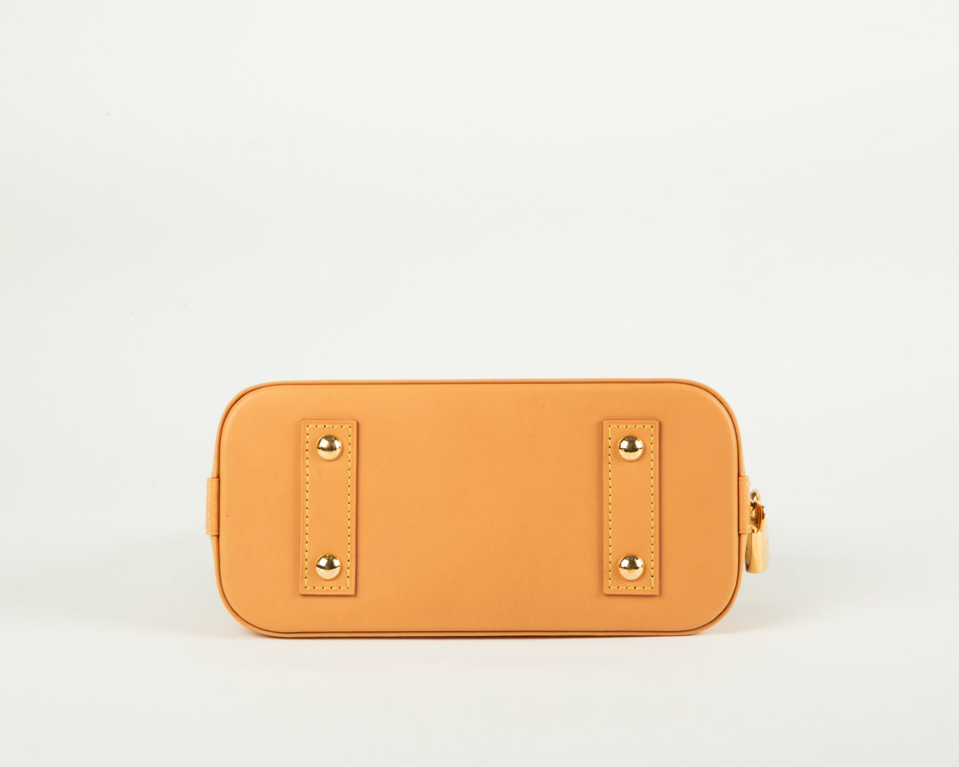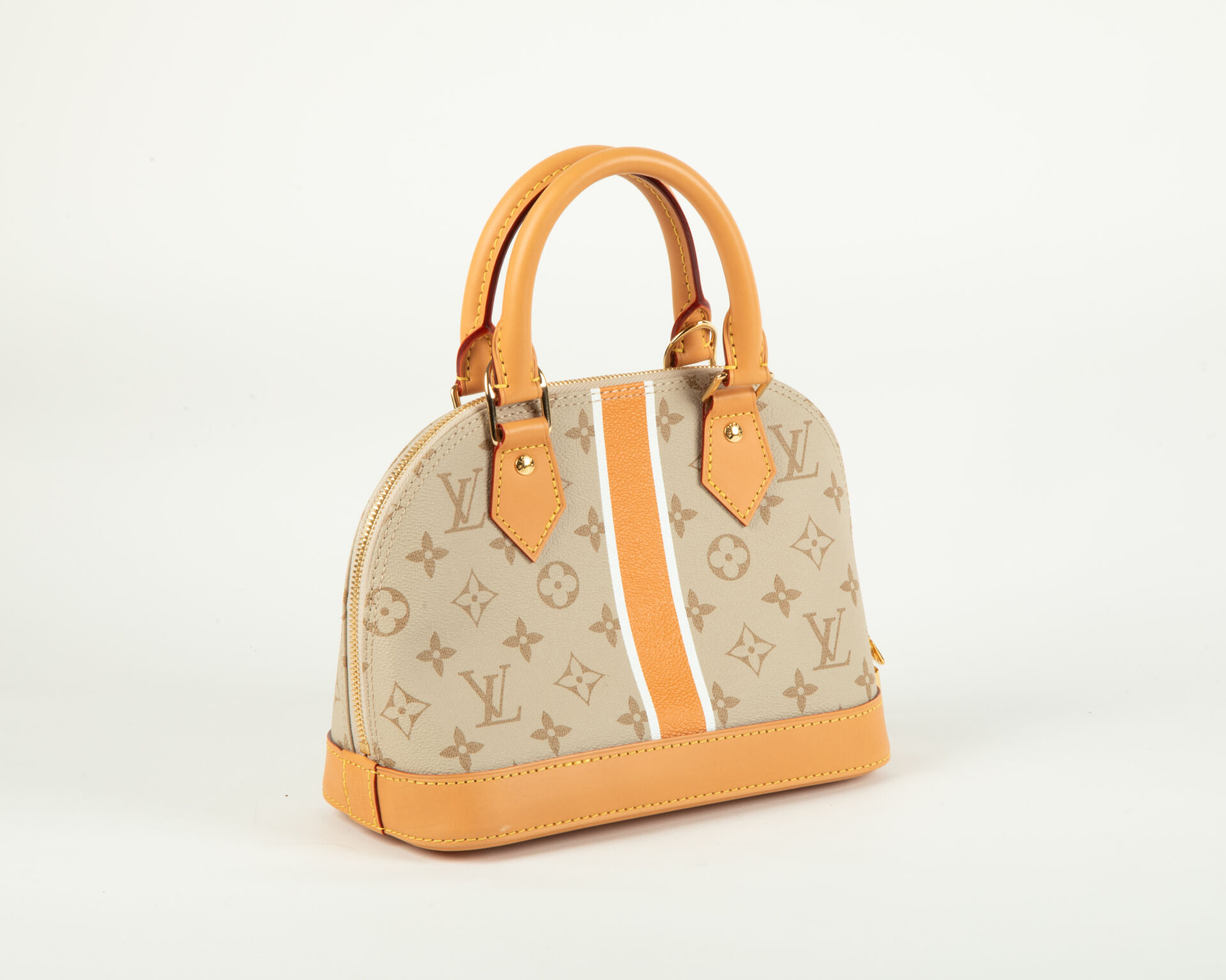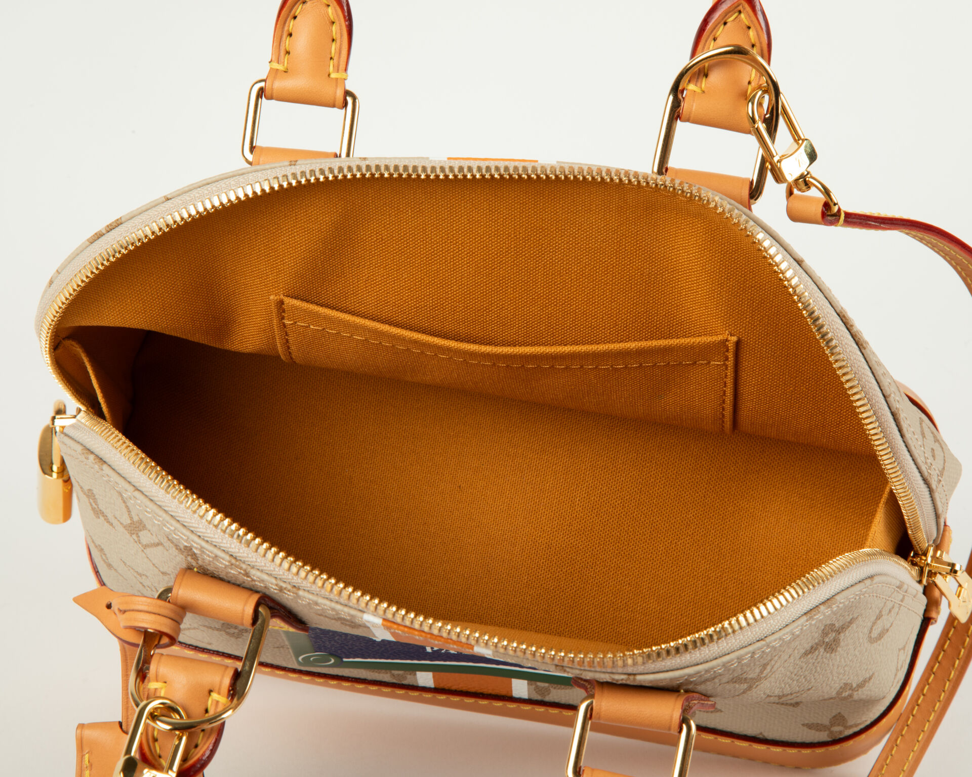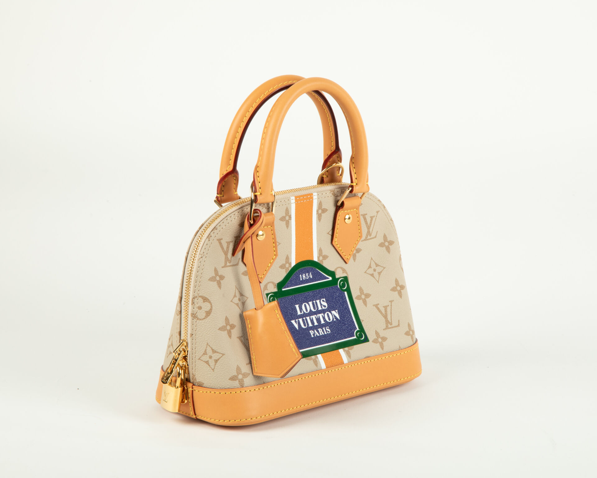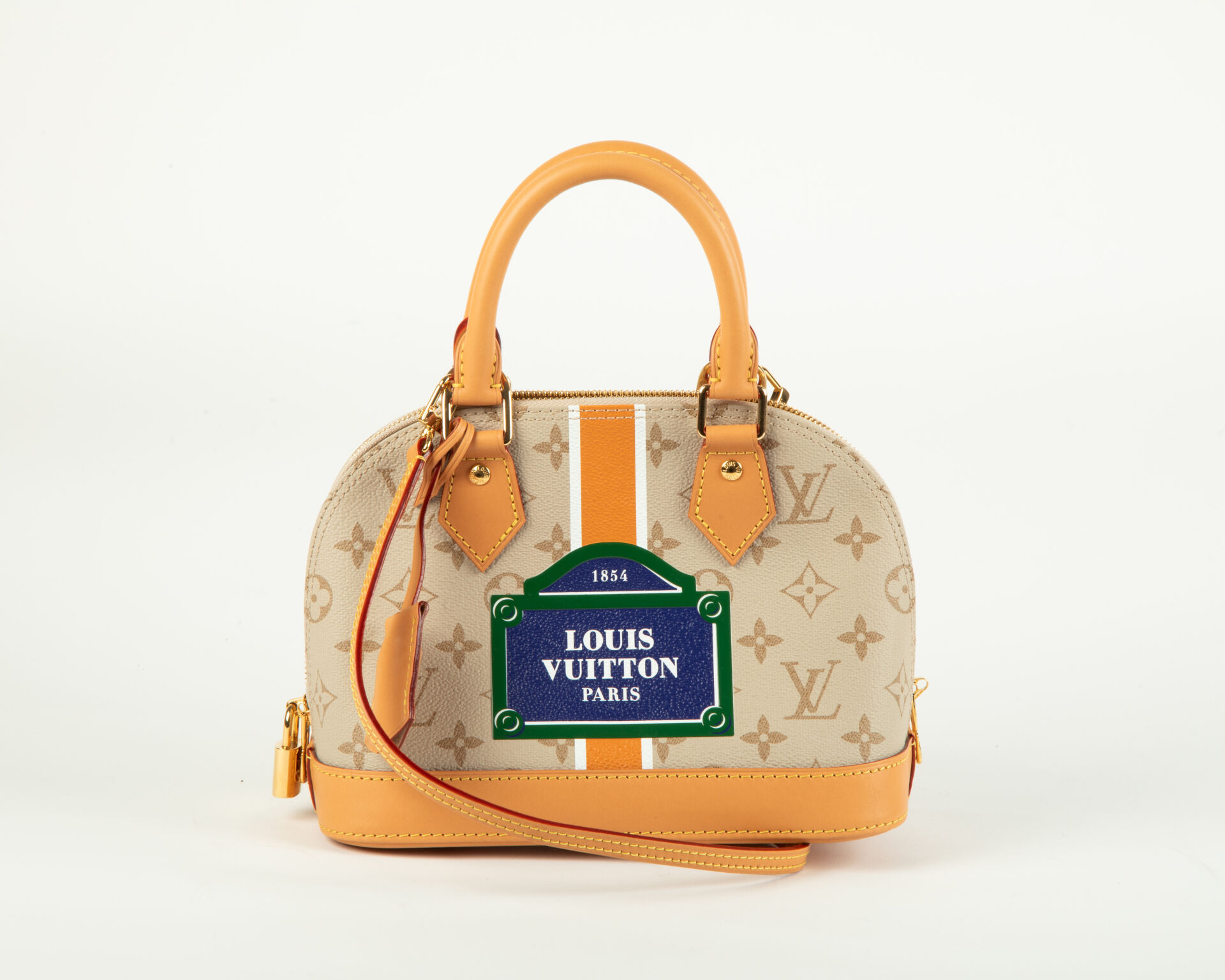 Collection Monopaname – Sac Alma BB en toile monogram beige et cuir naturel à décor en faux semblant d’une plaque de rue, sac porter épaule et bandoulière, accastillage en métal doré, cadenas, clef et clochette, intérieur en toile orange à une poche appliquée.