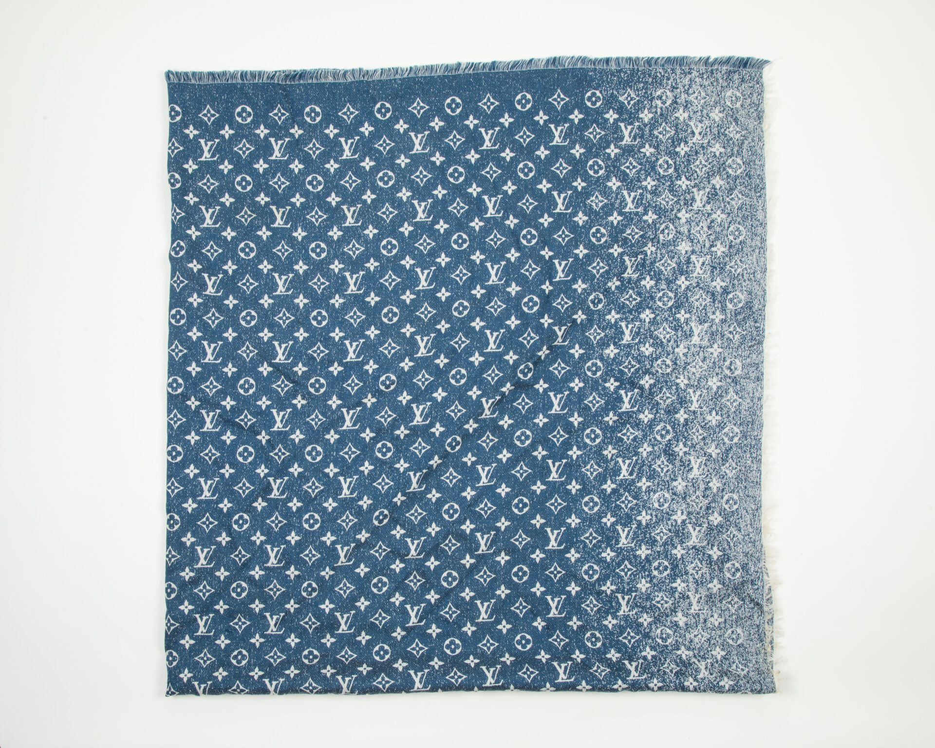 154 ESTIMATION: 120 / 150 € LOUIS VUITTON Châle en jacquard monogram bleu à décor dégradé blanc Taille : 142.5 x 142.5 cm