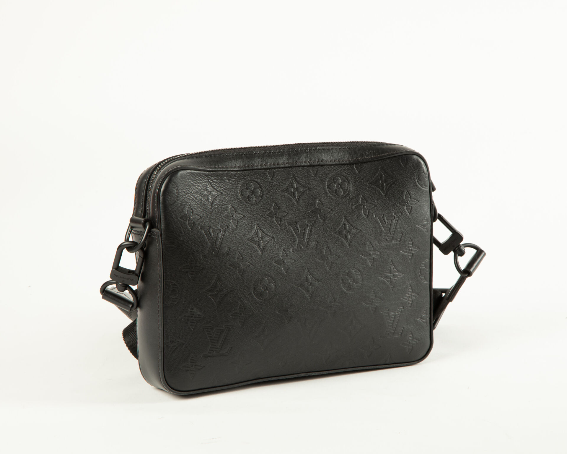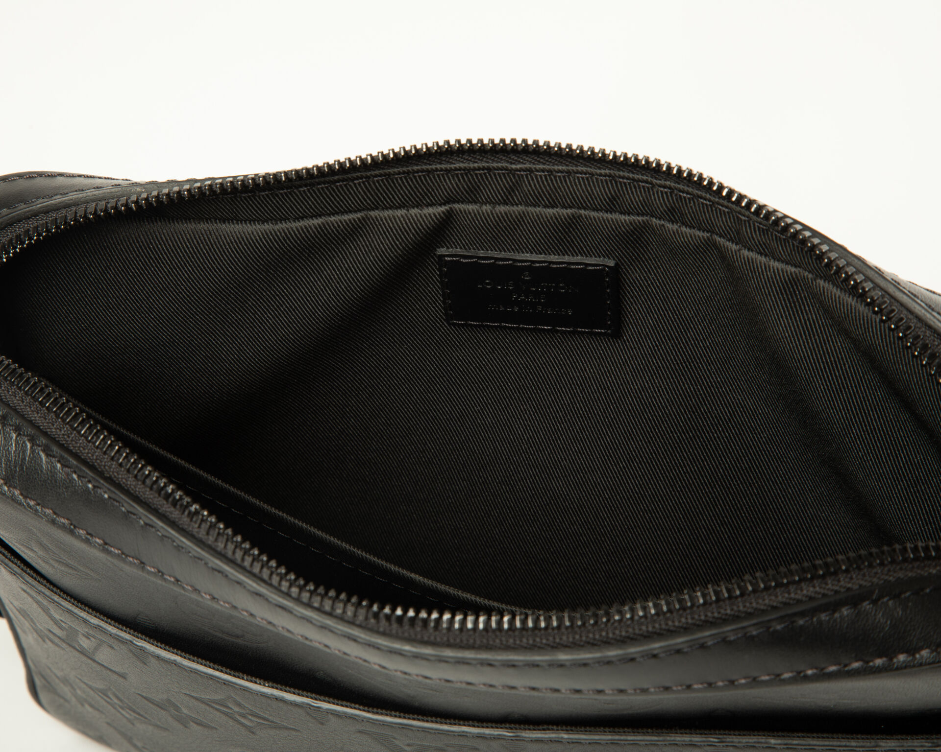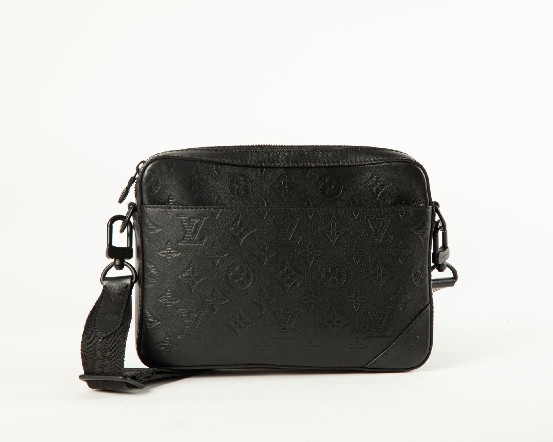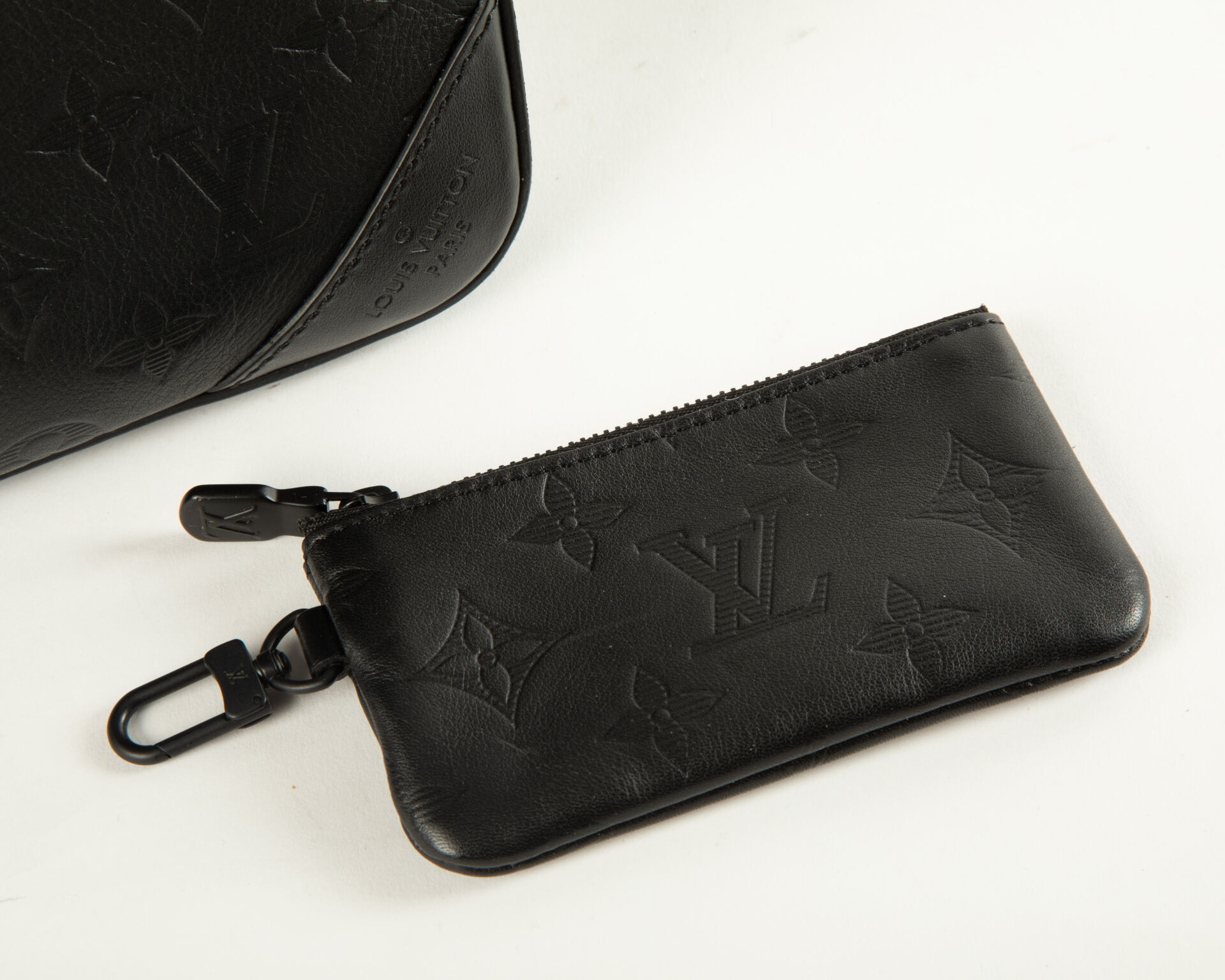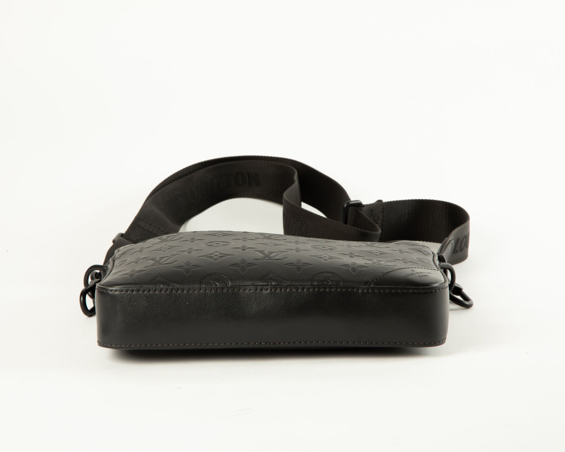 Modèle Duo Messenger – Sac à bandoulière en cuir de veau embossé monogram noir, accastillage en métal noir, fermeture à glissière, poche plaquée à l’avant, doublure en toile noire, anse sangle amovible réglable noire à un portemonnaie zippé.