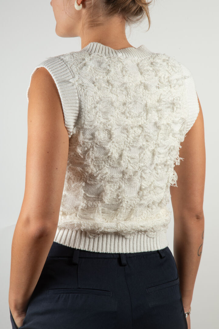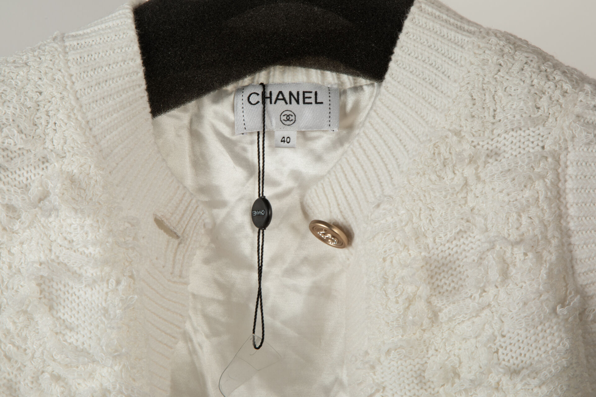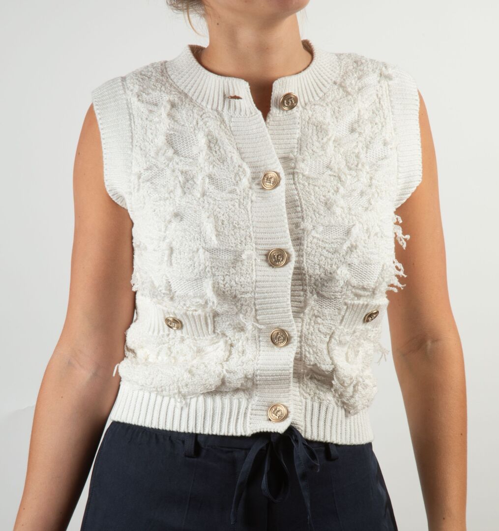 164 ESTIMATION: 80 / 120 € CHANEL, Paris Gilet sans manches à mailles en coton et soie blanc cassé à deux poches plaques, fermant par quatre boutons dorés marqués 5 en strass Taille 40