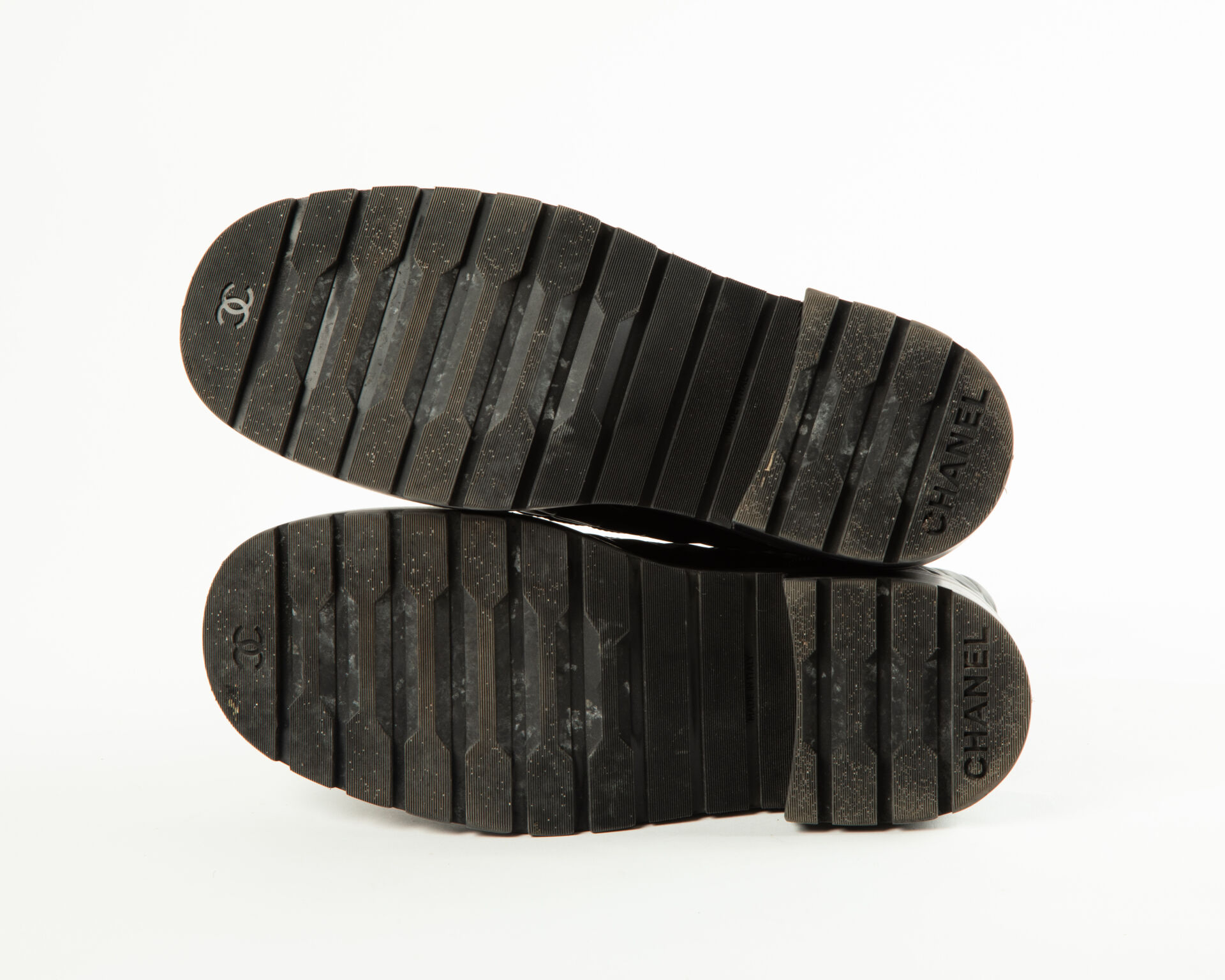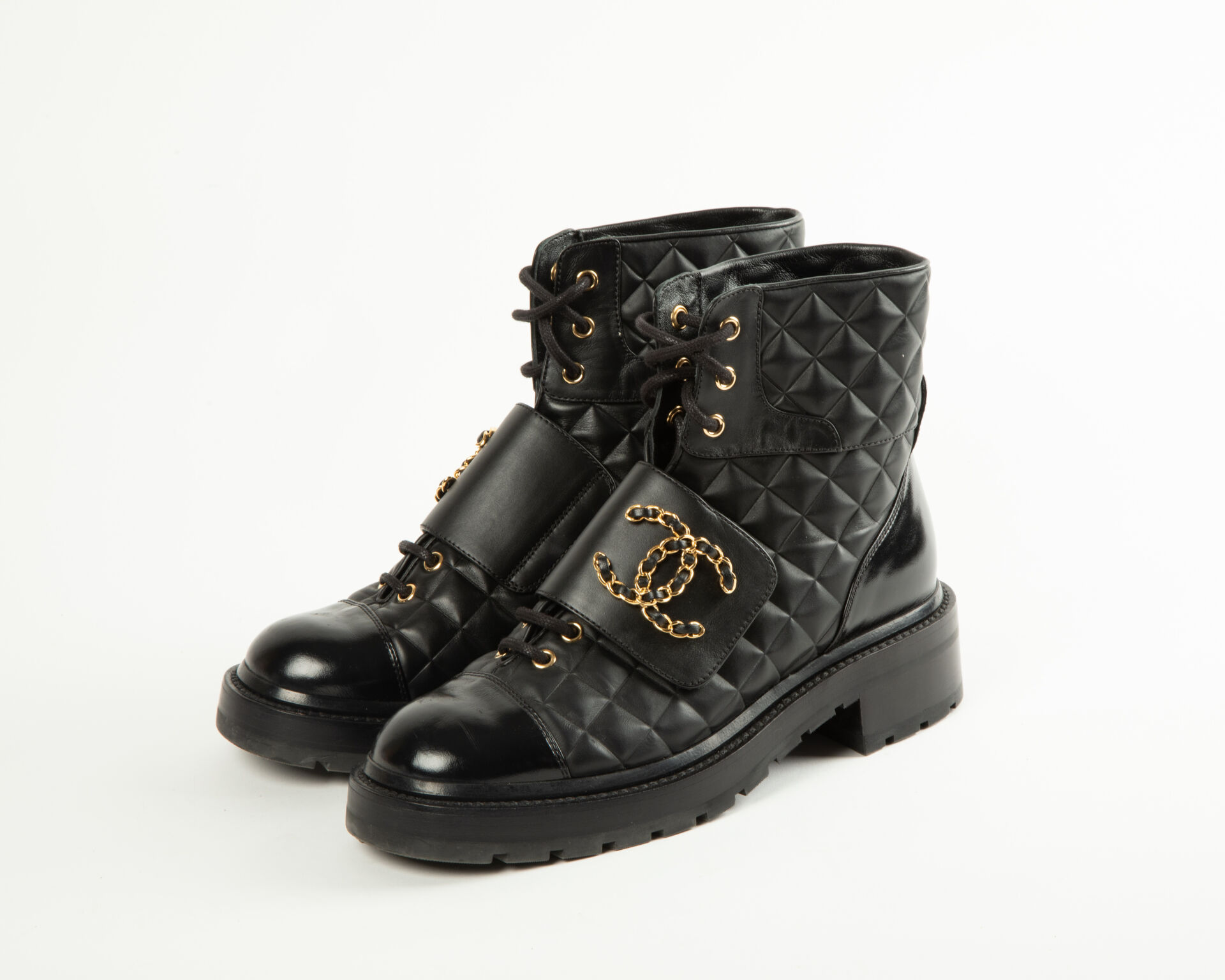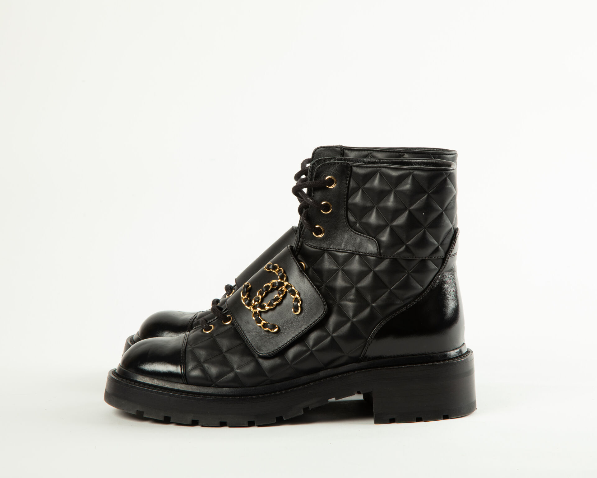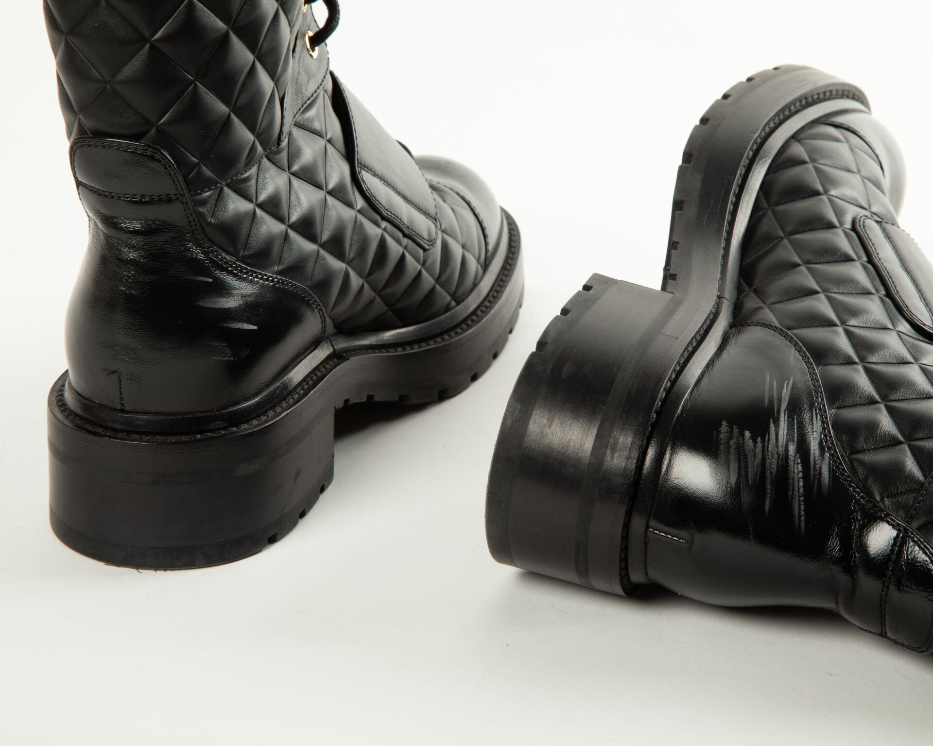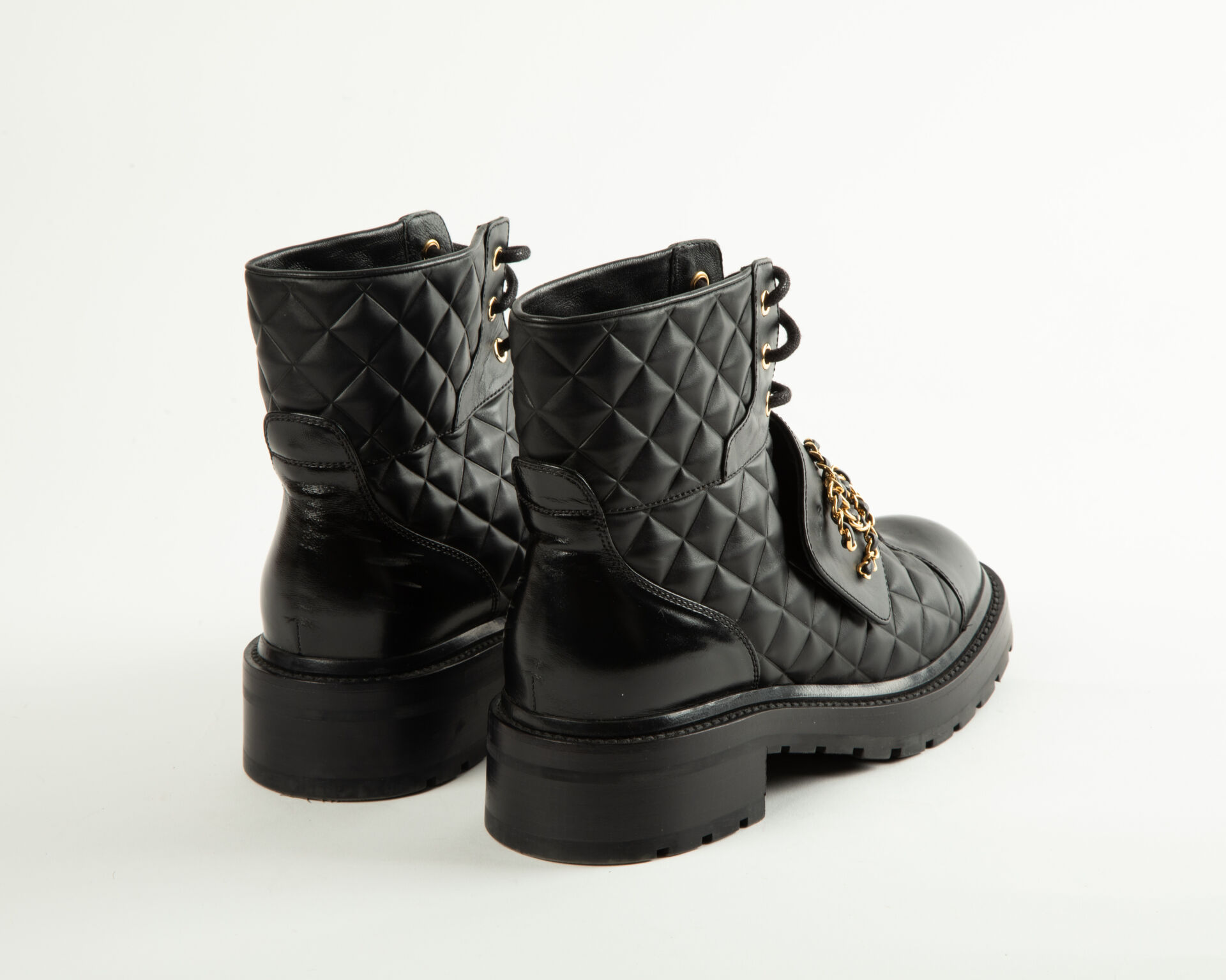 167 ESTIMATION: 20 / 30 € CHANEL, Paris Paire de bottines en cuir matelassé noir à lacets et empiècements en cuir lisse noir, accastillage en métal doré Taille 38 1/2 Rayures Dans leur boite