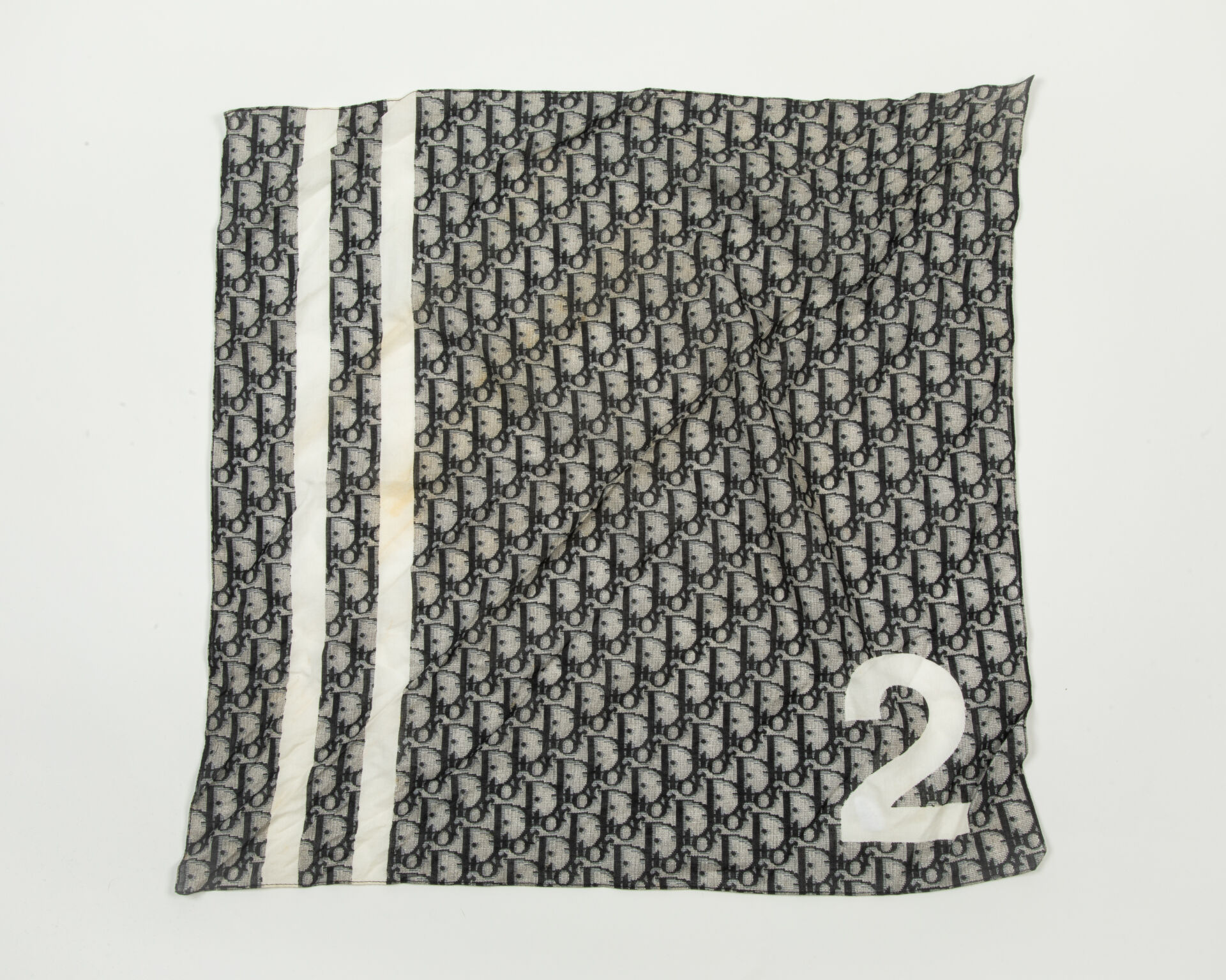 168 ESTIMATION: 50 / 80 € CHRISTIAN DIOR Foulard en coton à décor oblique du monogramme bleu marine de deux bandes blanches et d’un grand chiffre 2 Tâches 49 x 49 cm