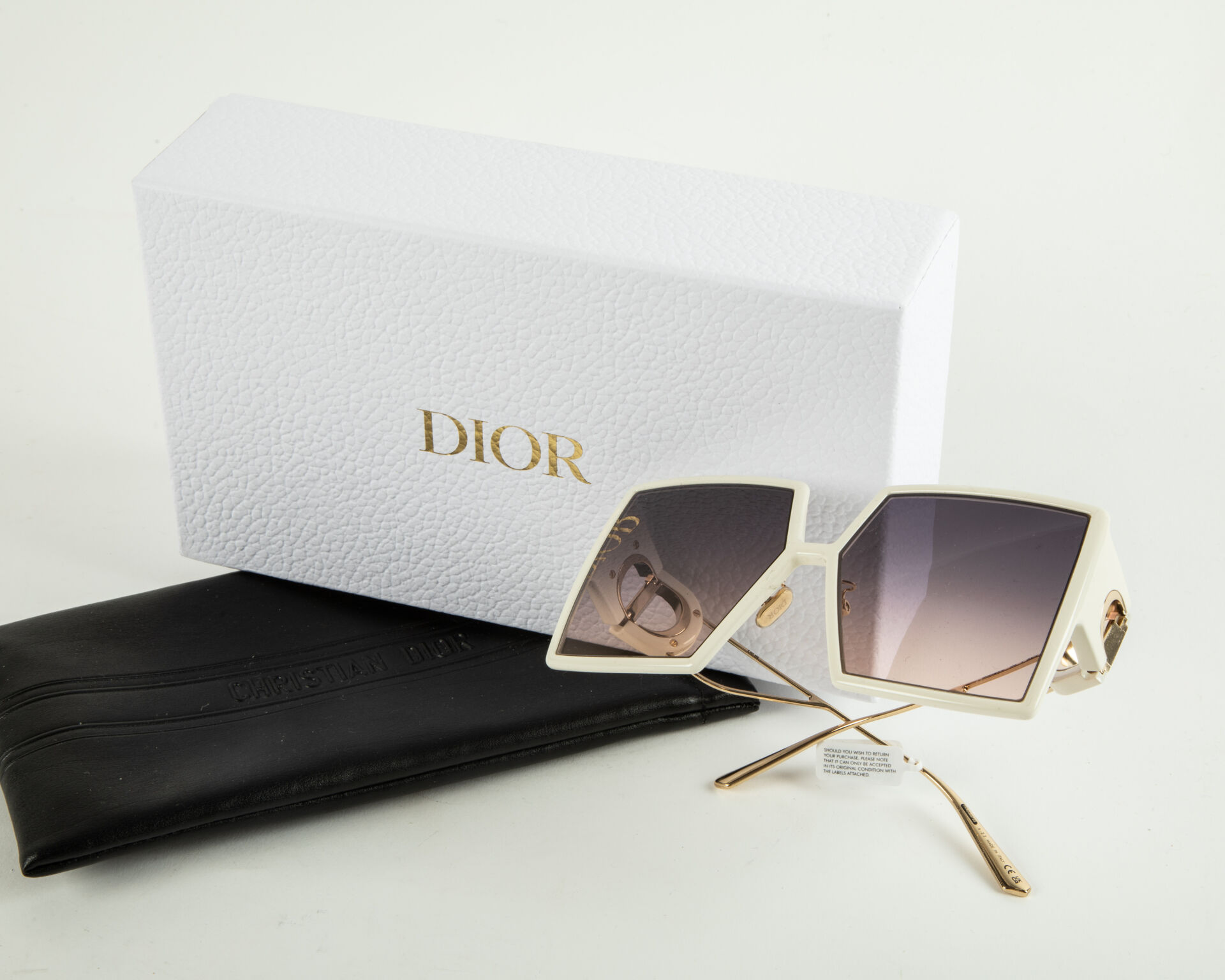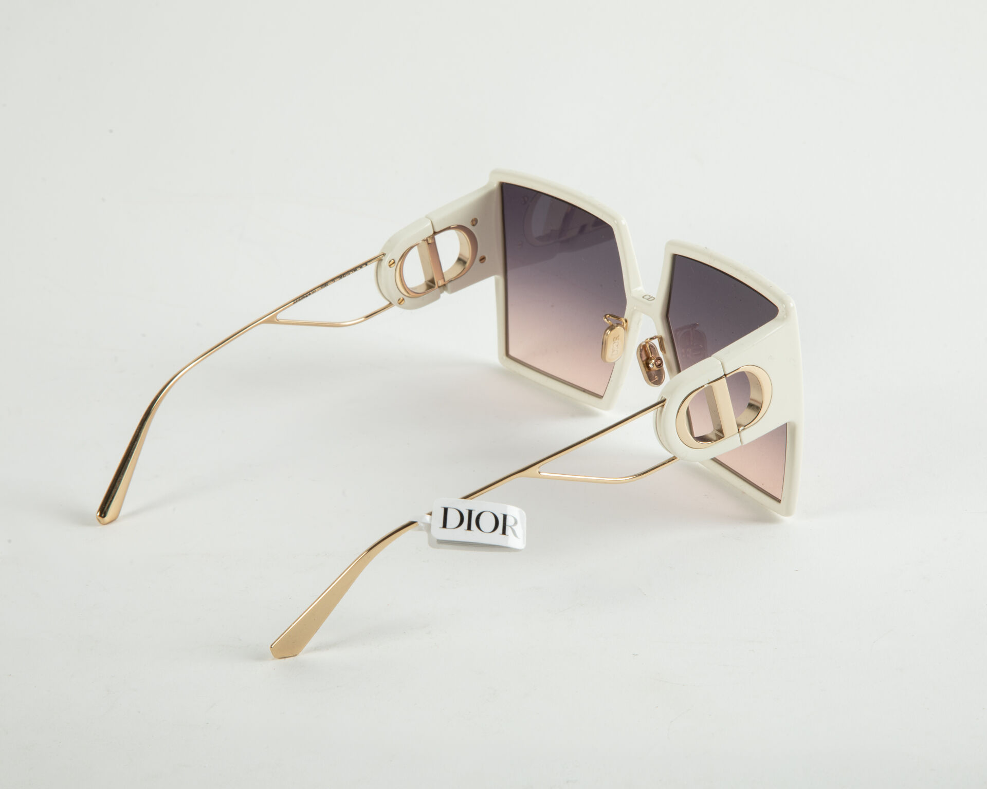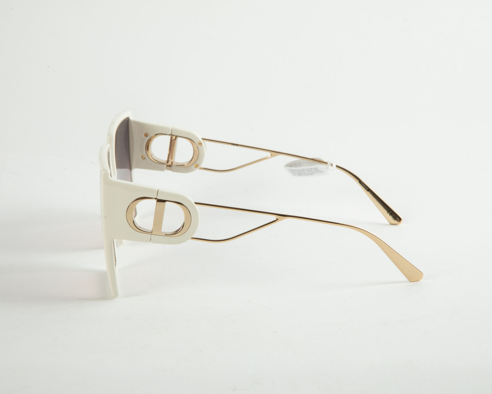 172 ESTIMATION: 60 / 80 € CHRISTIAN DIOR Modèle Montaigne – Paire de lunettes de soleil en acétate blanc et métal doré, verres fumés Avec étui et boite