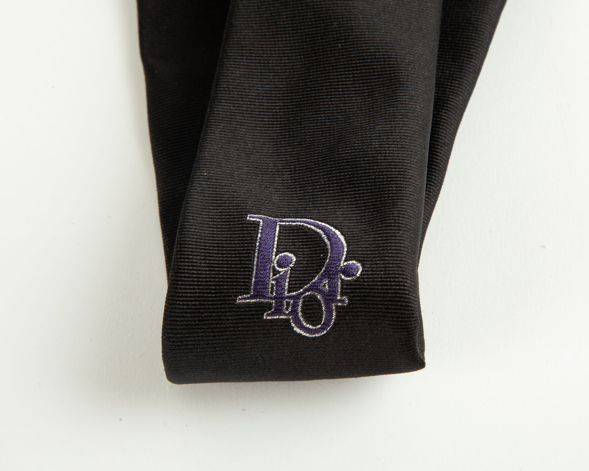 177 ESTIMATION: 50 / 80 € CHRISTIAN DIOR Cravate en soie et viscose noire, logo de la marque brodé bleu et argenté Longueur : 145 – Largeur : 7 cm Dans sa boite