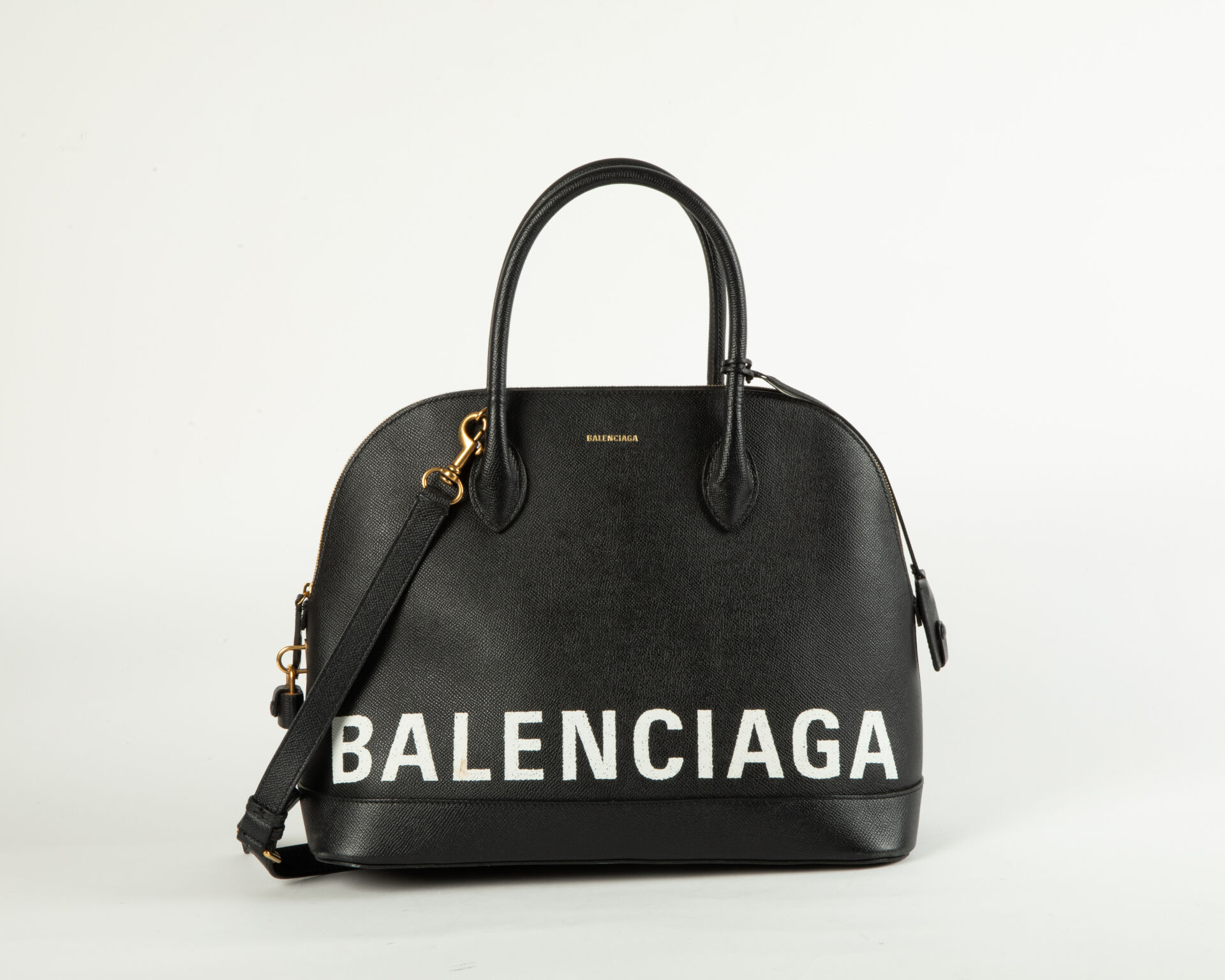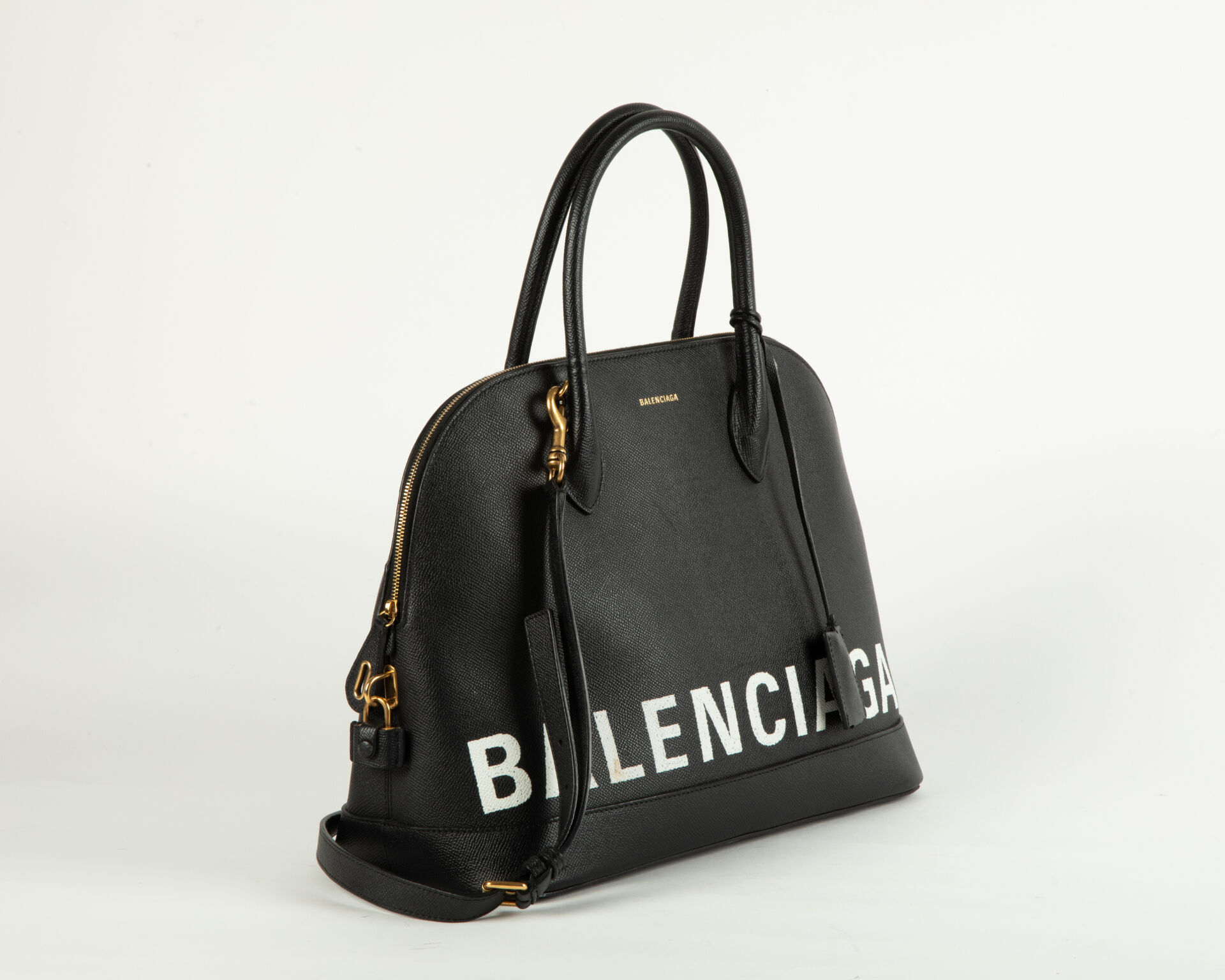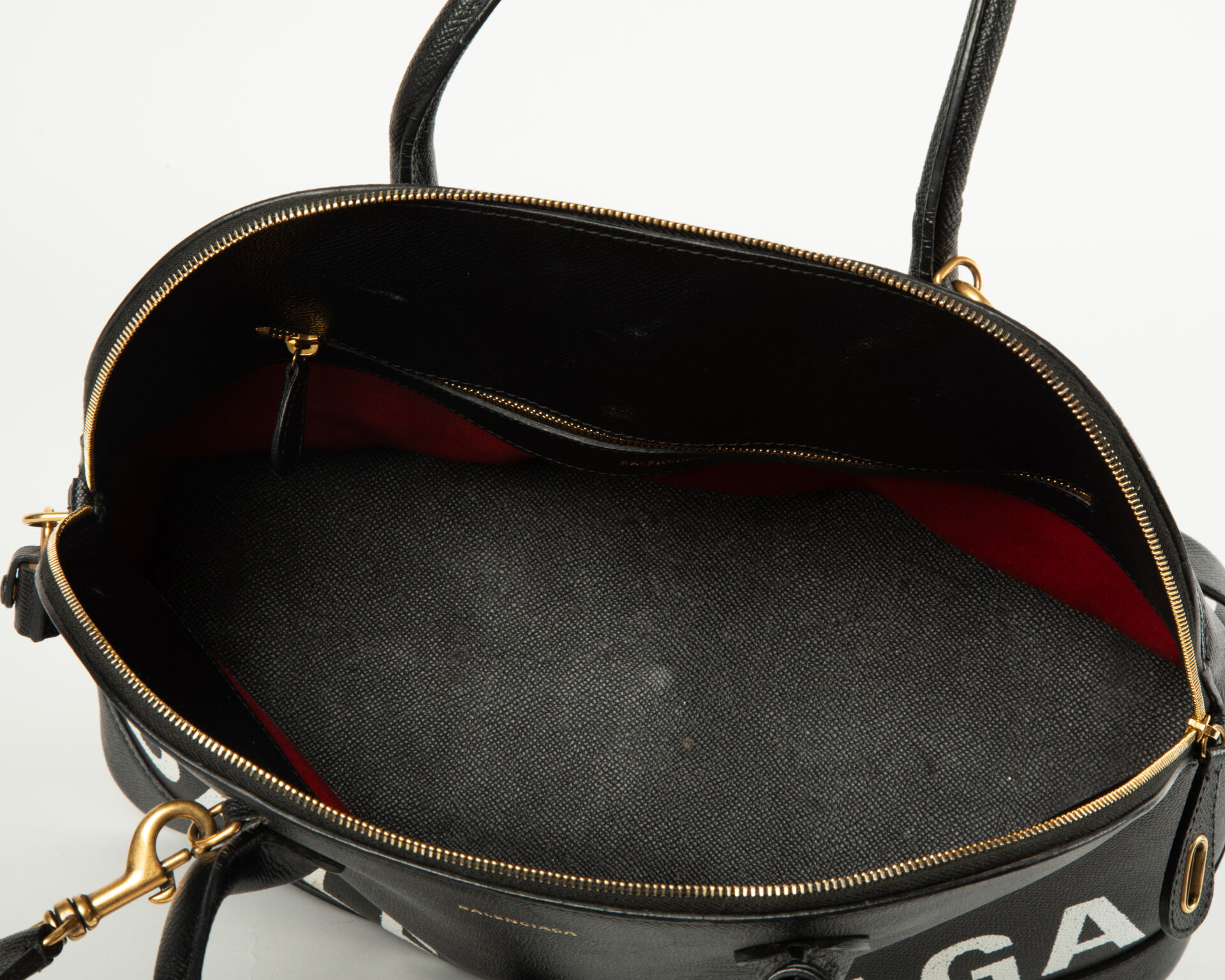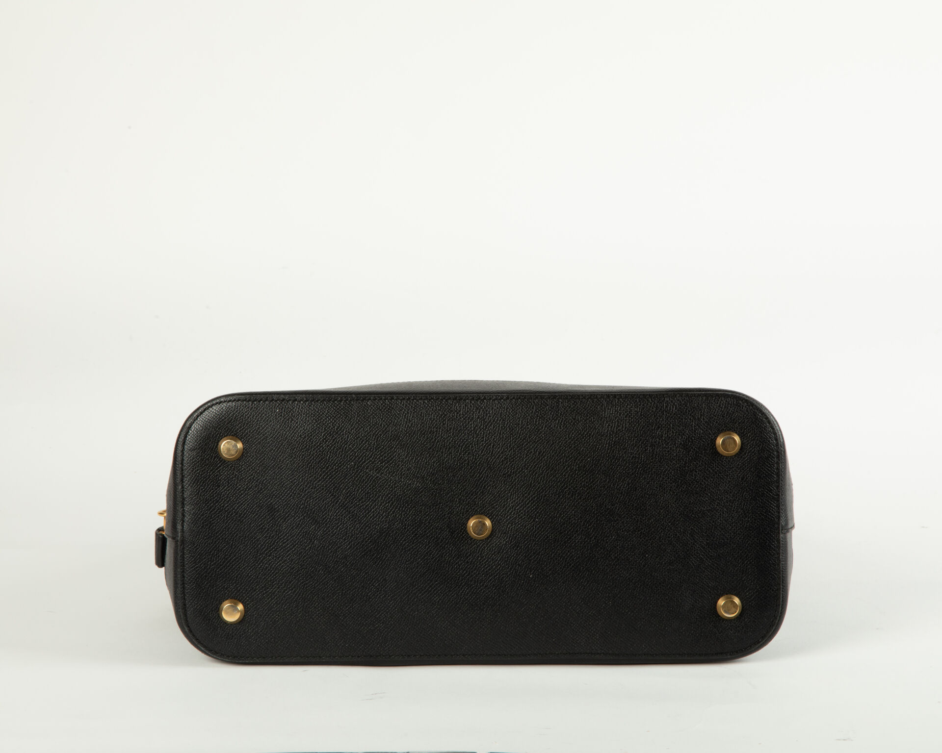 Modèle Ville – Sac à main en cuir de veau grainé noir porter main et bandoulière, accastillage en métal palladié, cadenas, clochette et clefs, intérieur en cuir et tissus rouge à une poche et une poche zippée en applique.