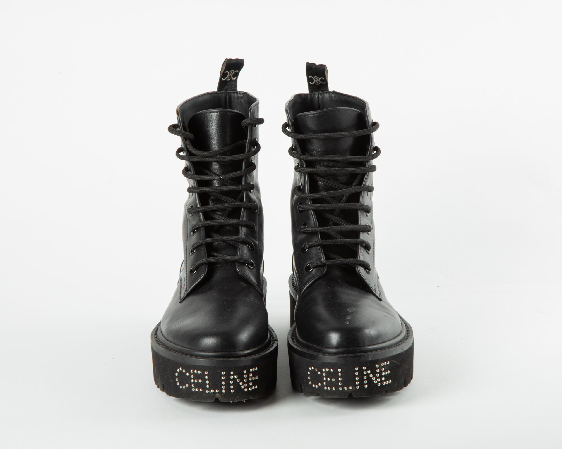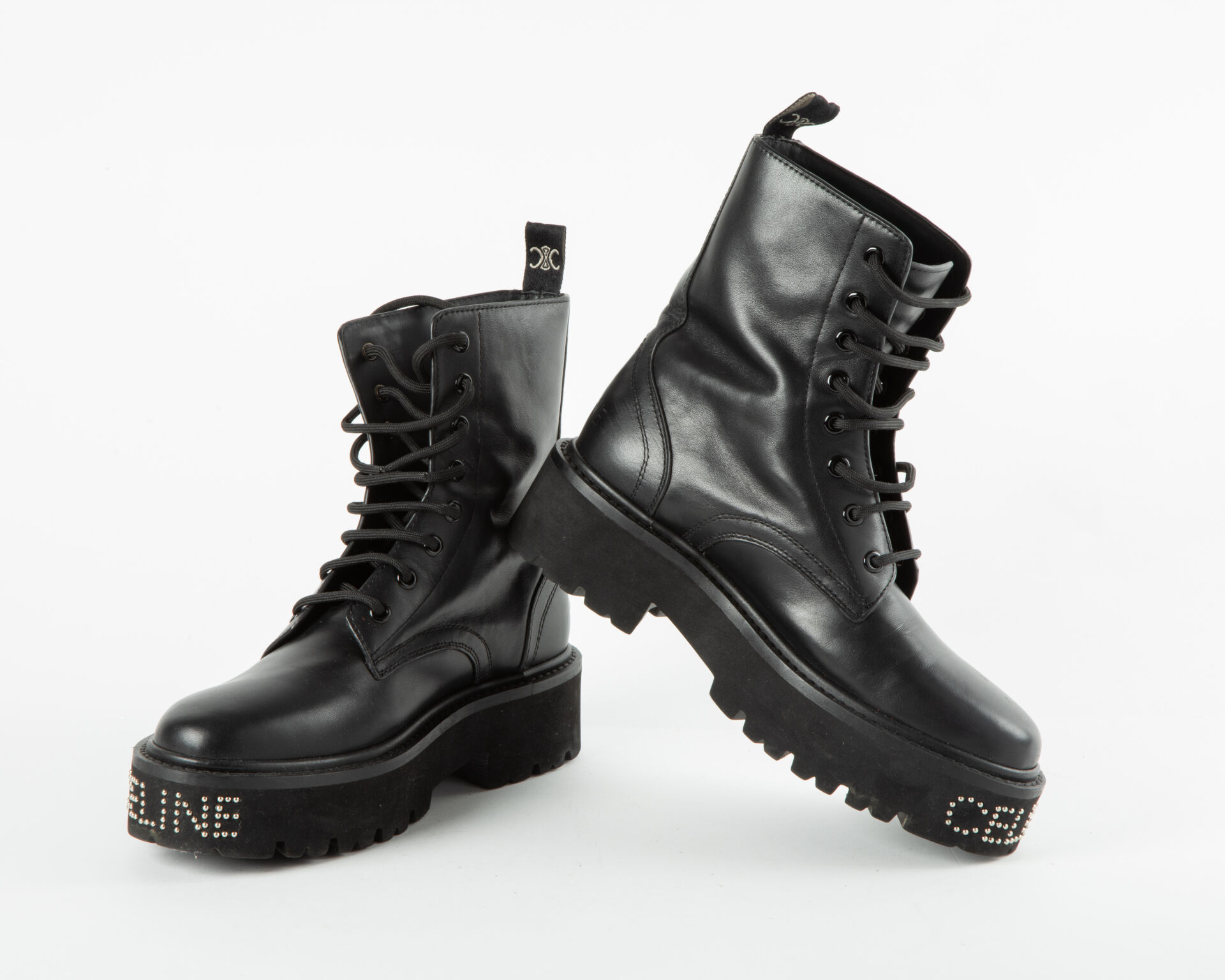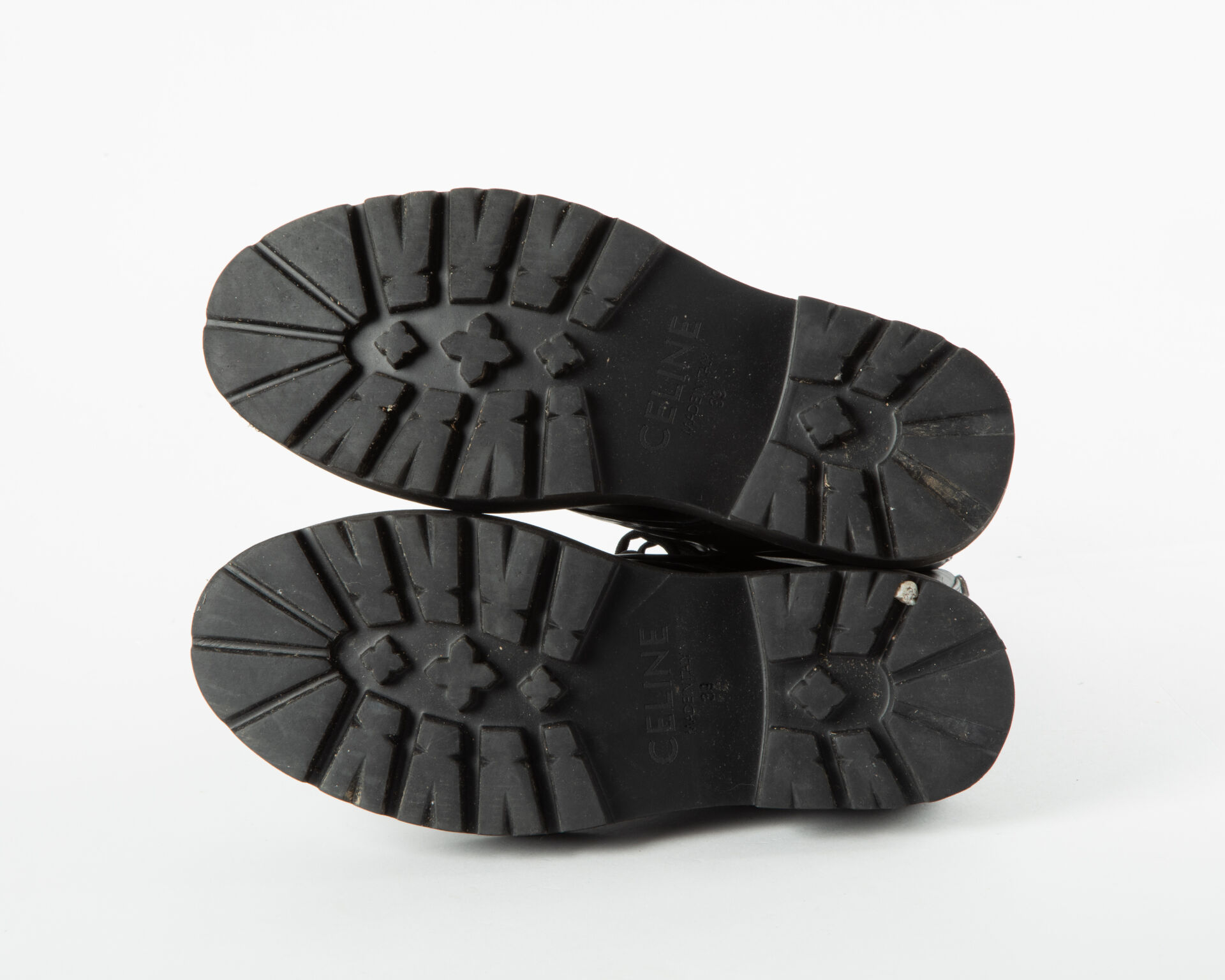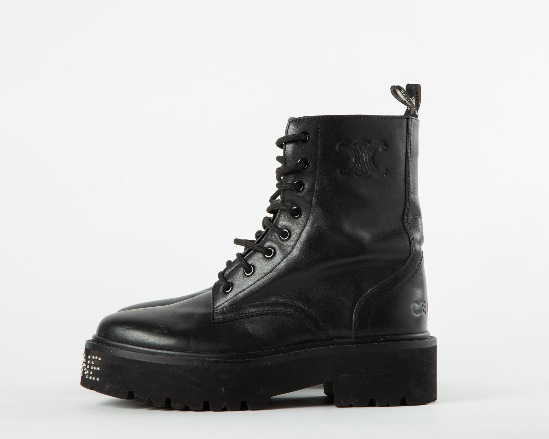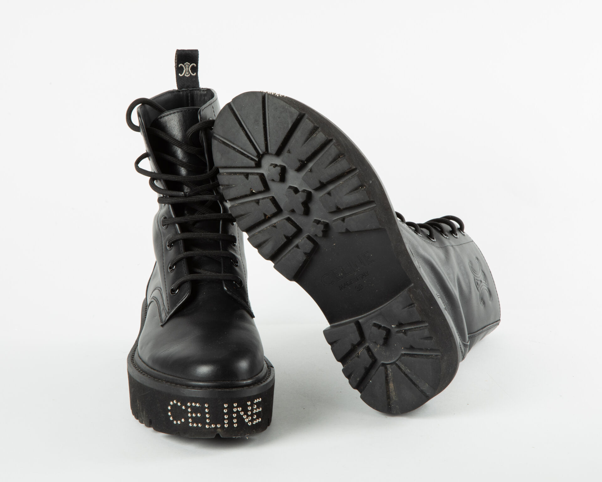 Modèle Bulky – Bottines type rangers en cuir lisse noir à bout rond, lacets et œillets noirs, logo triomphe en relief sur les côtés extérieurs des tiges, semelles intercalaires en caoutchouc noir avec inscription cloutée « CELINE »