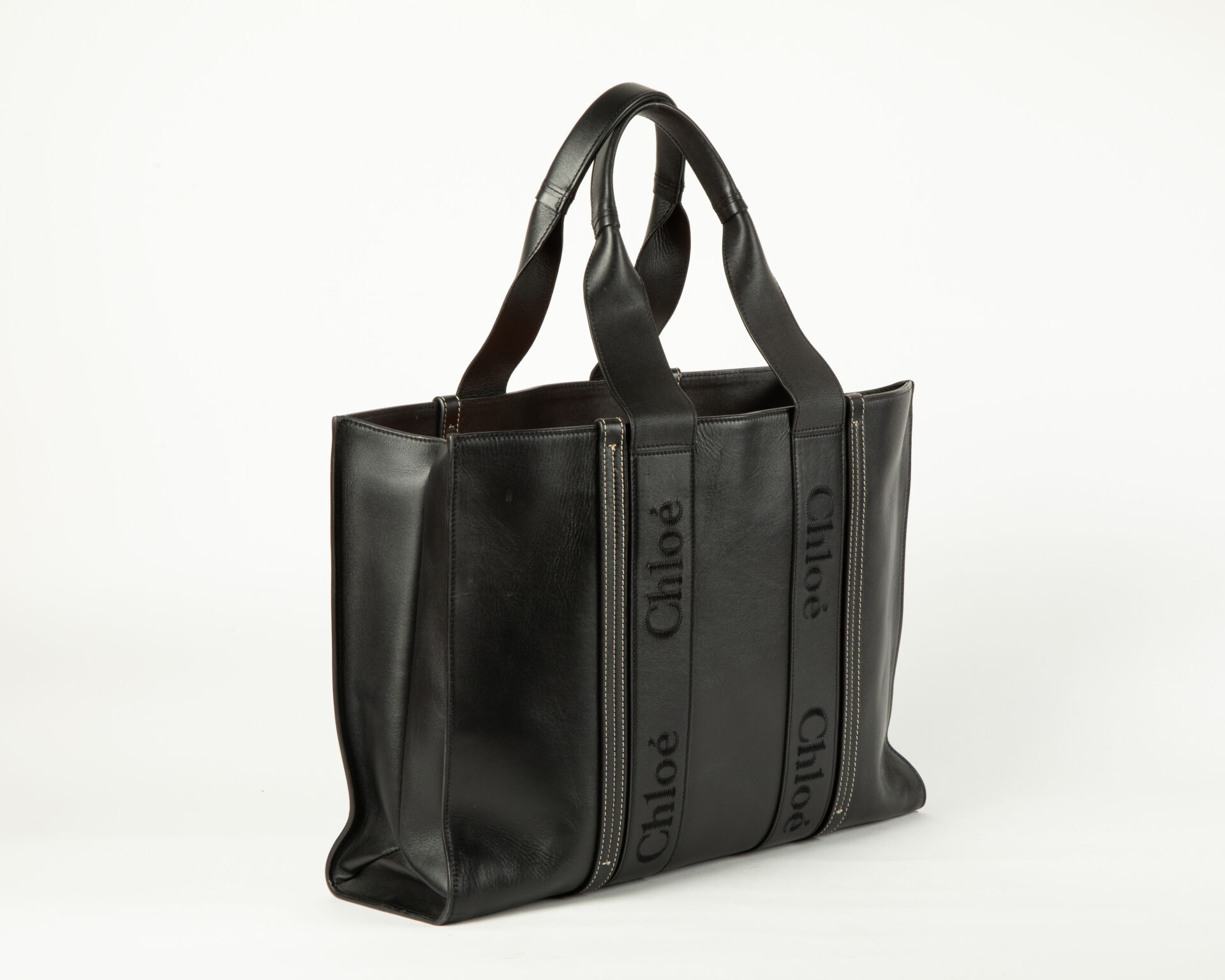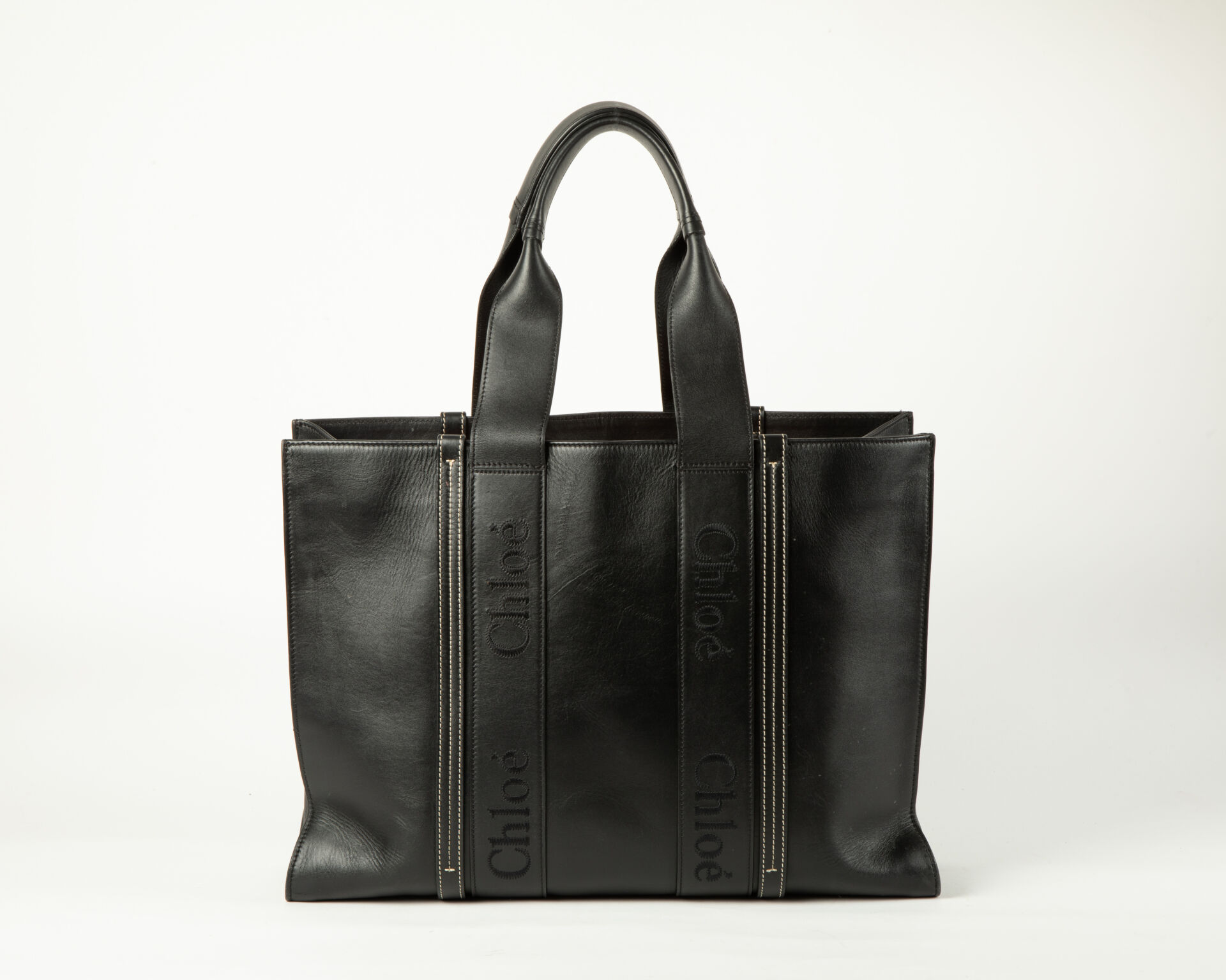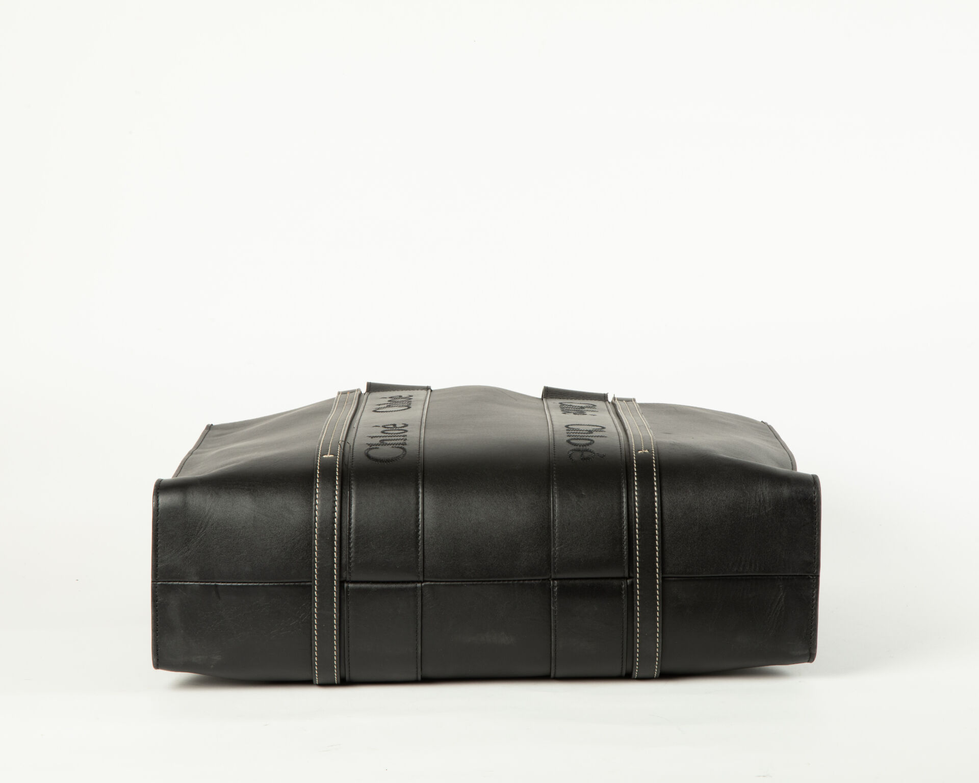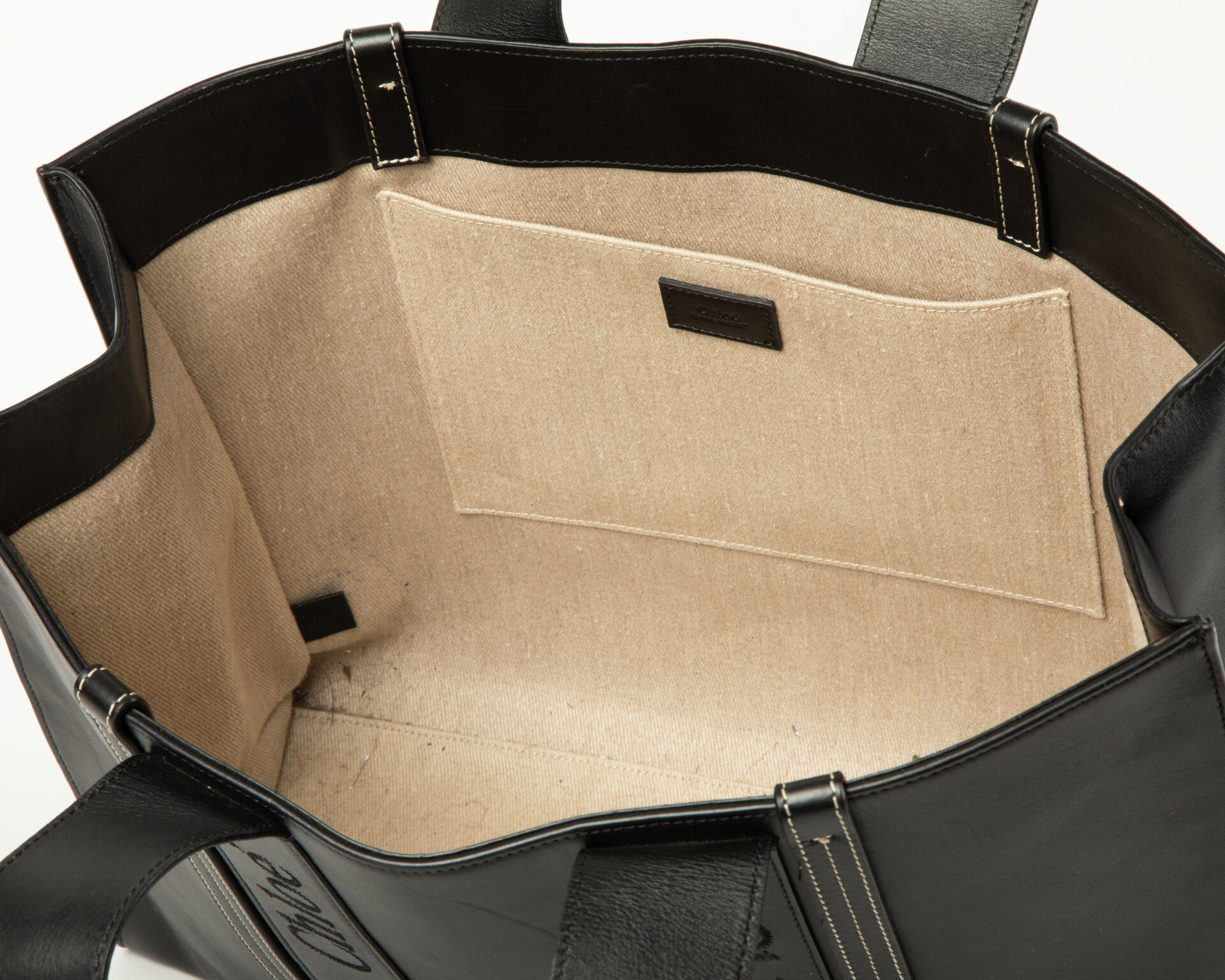 Modèle Woody – Cabas en cuir noir lisse à surpiqures blanches à deux anses, doublure en toile beige, poche intérieure plaquée