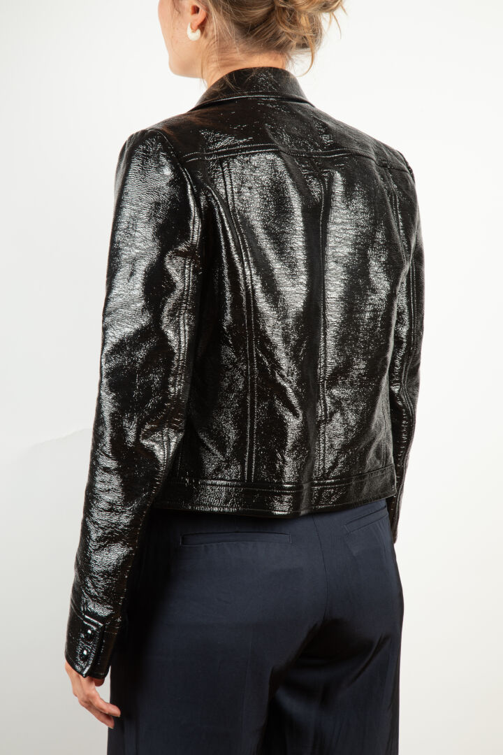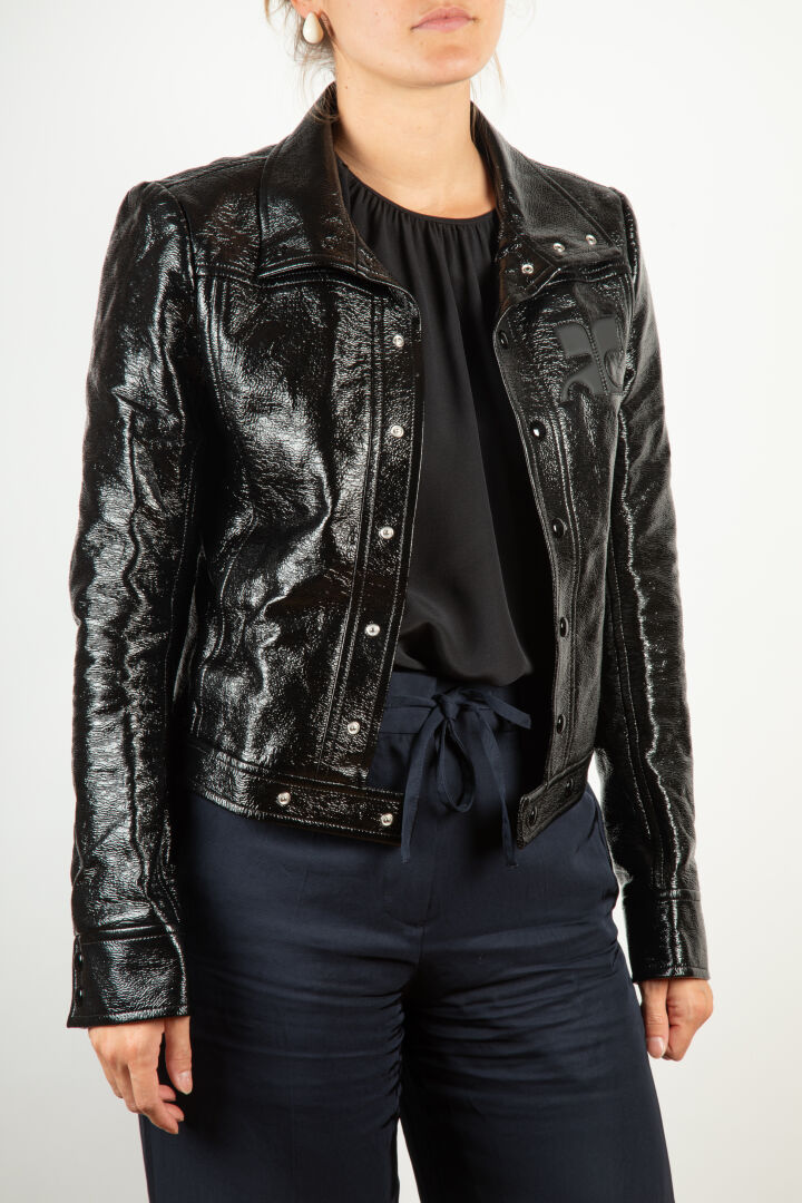 192 ESTIMATION: 150 / 200 € COURREGES Modèle Réedition – Blouson en vinyle noir, logo incrusté noir sur la poitrine, col montant Taille 40
