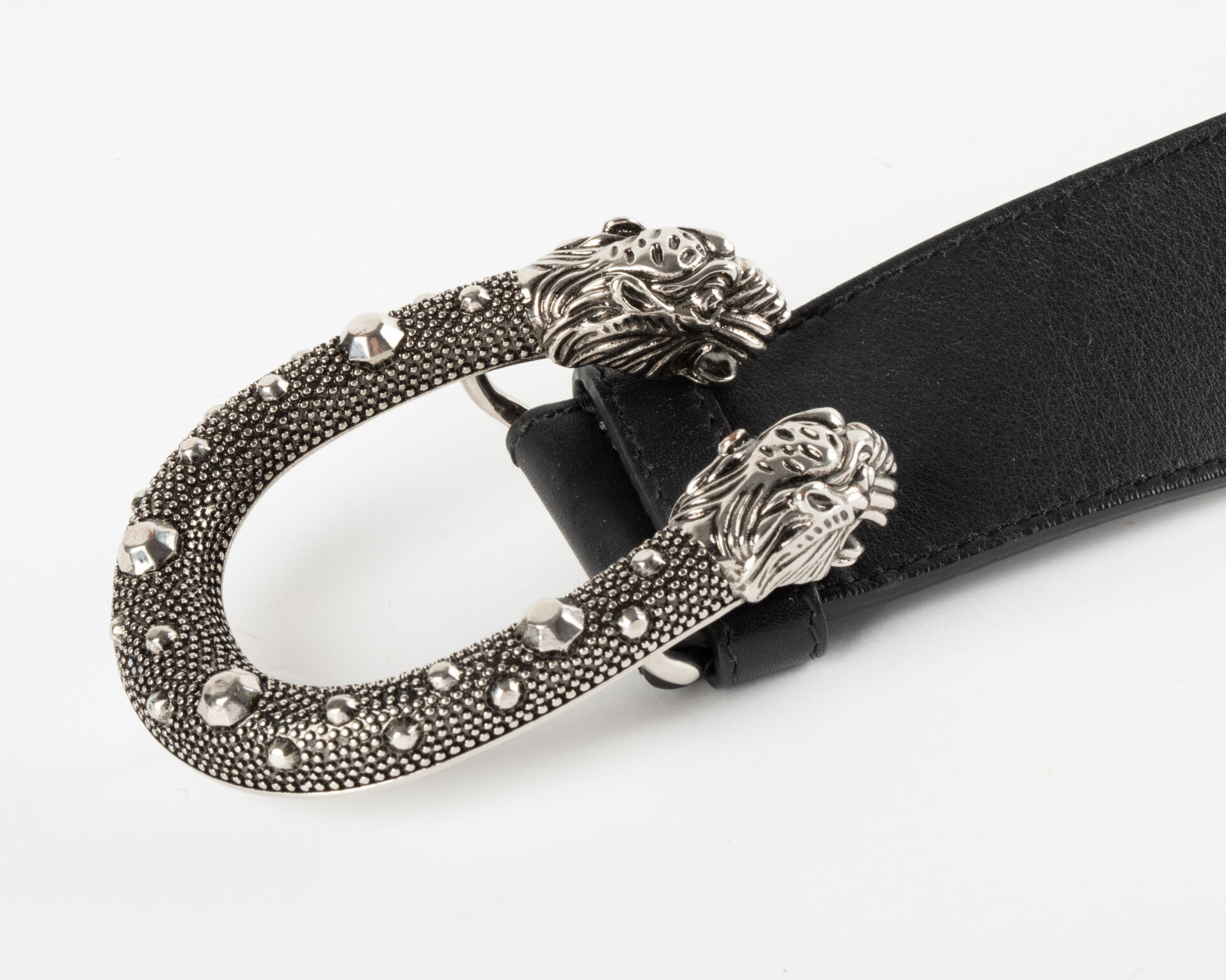 196 ESTIMATION: 60 / 80 € GUCCI Ceinture en cuir noir à boucle à décor de têtes de lion en métal argenté Taille 90/36