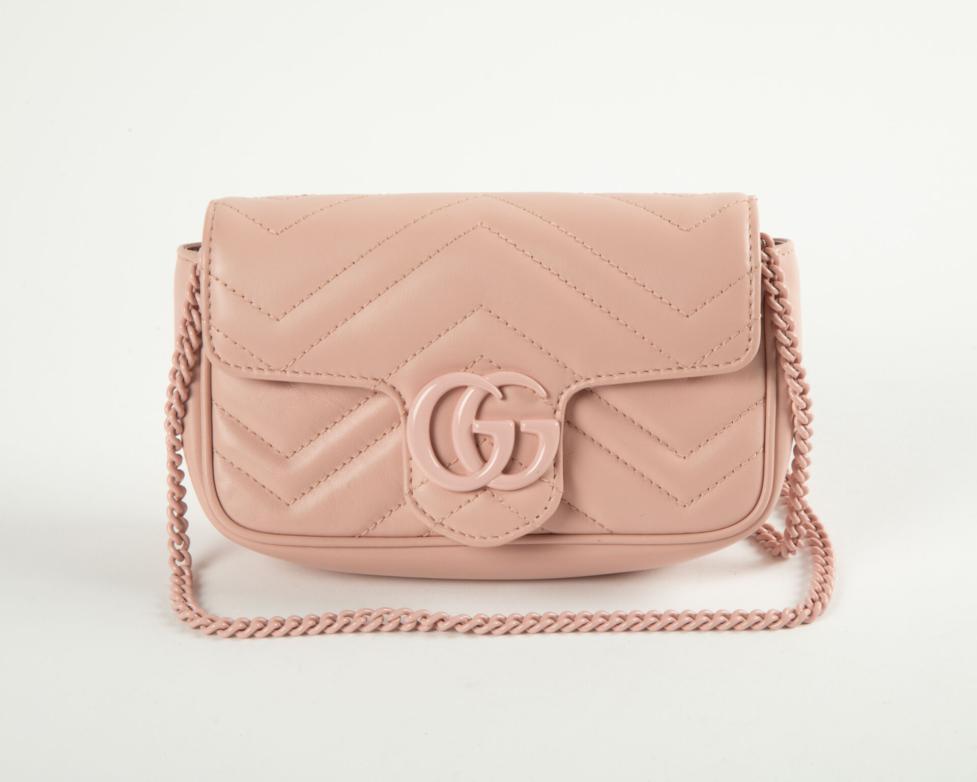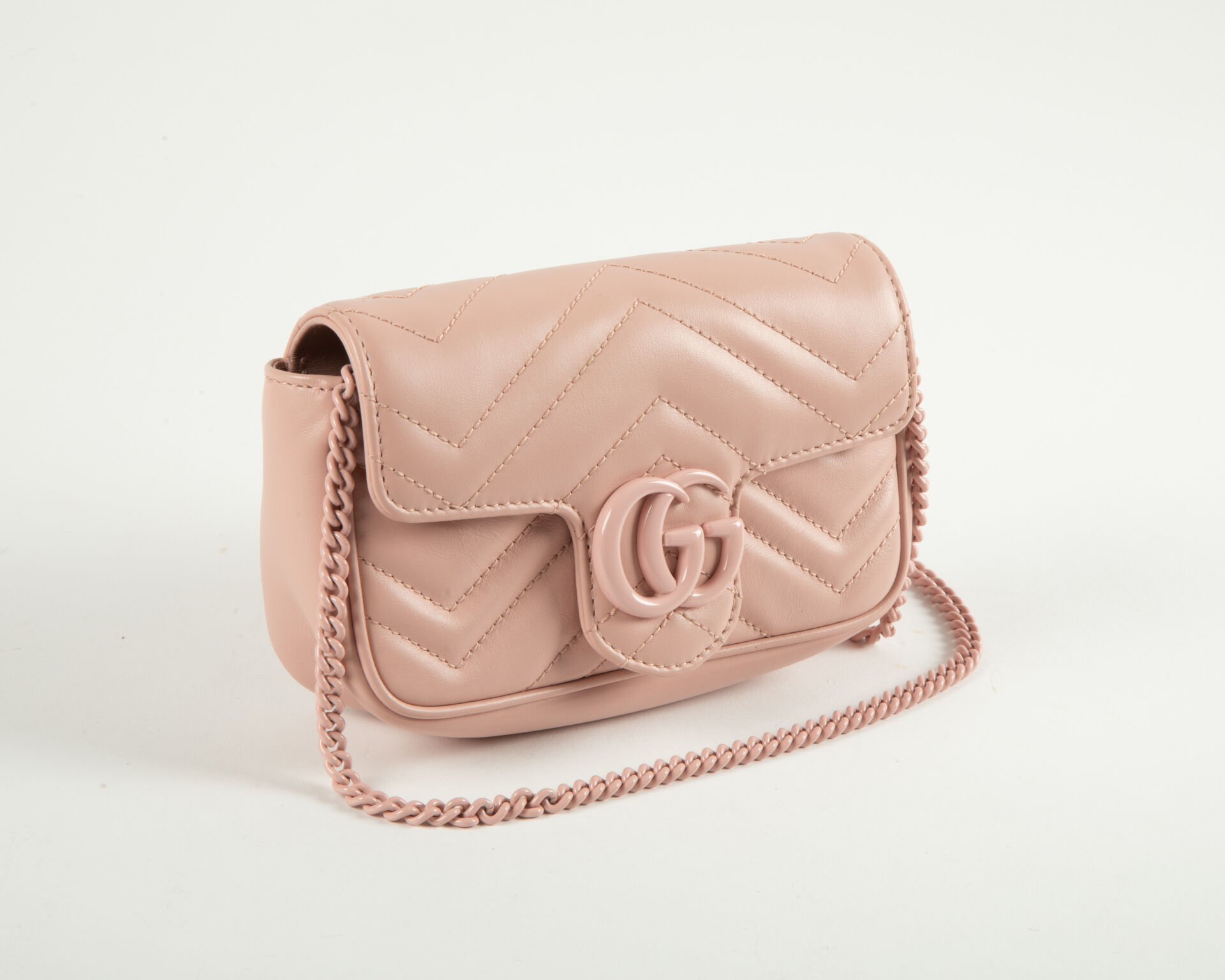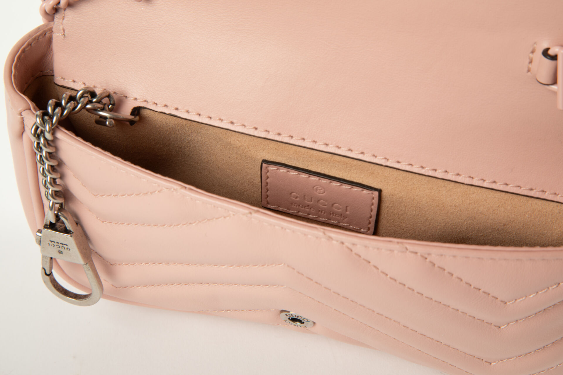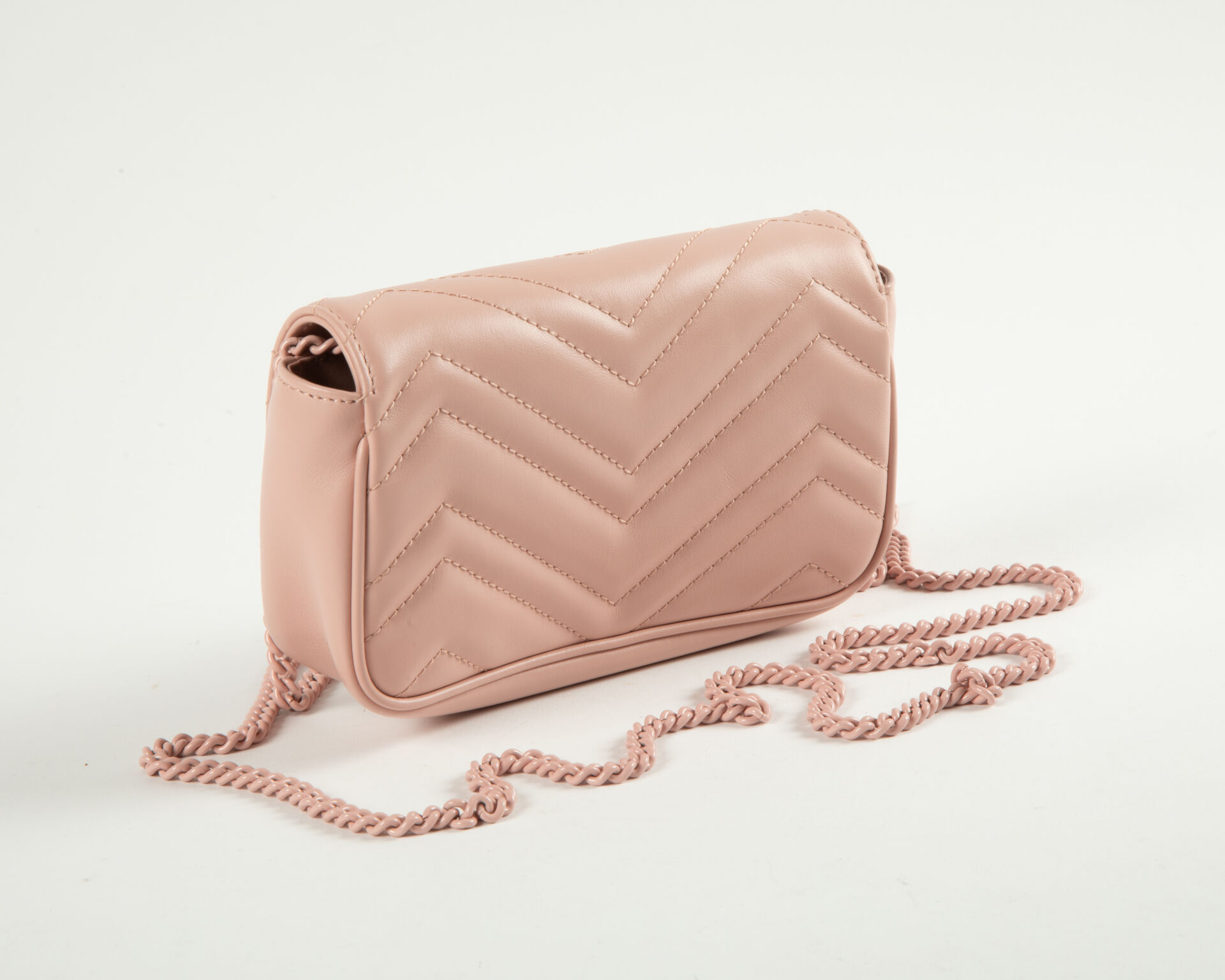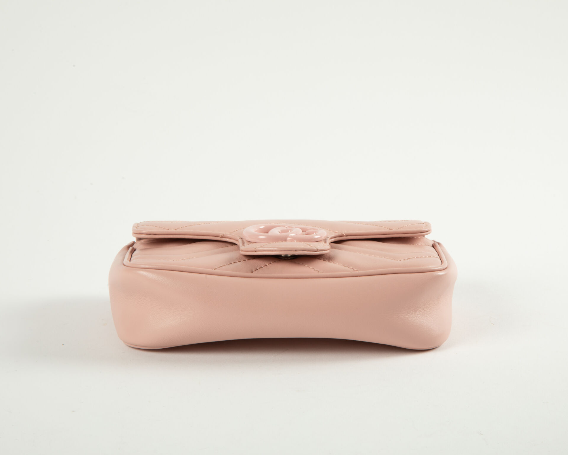 Modèle GG Marmont baguette – Sac à main en cuir de veau matelassé à chevrons rose clair, accastillage en métal laqué rose clair, chainette porter épaule amovible, fermeture à rabat par bouton pression, intérieur rose poudré avec porte clef en métal argenté amovible.