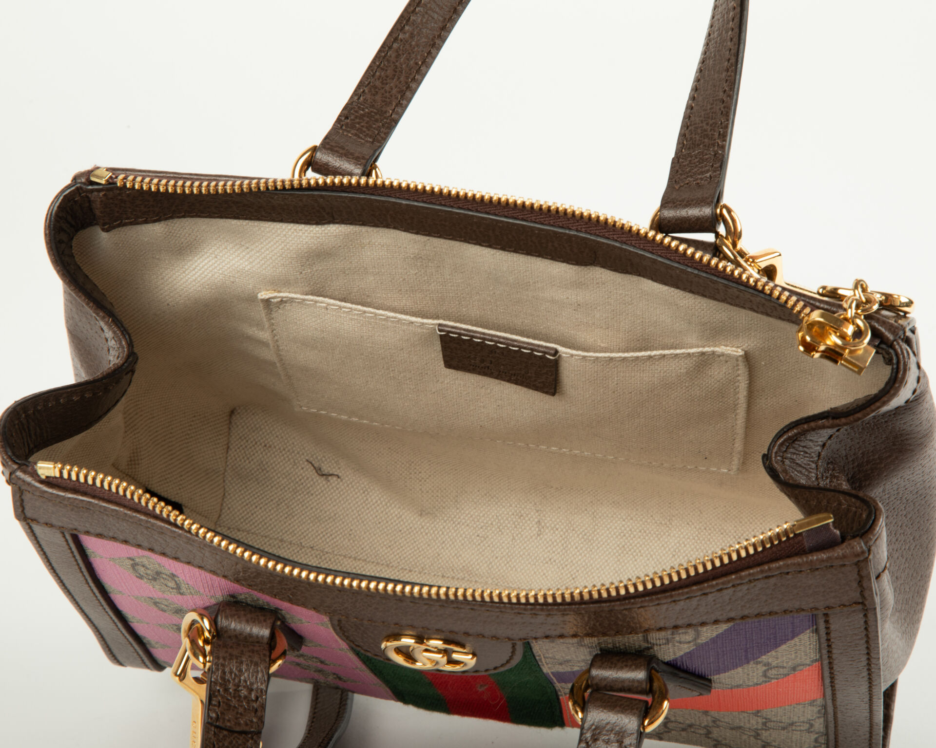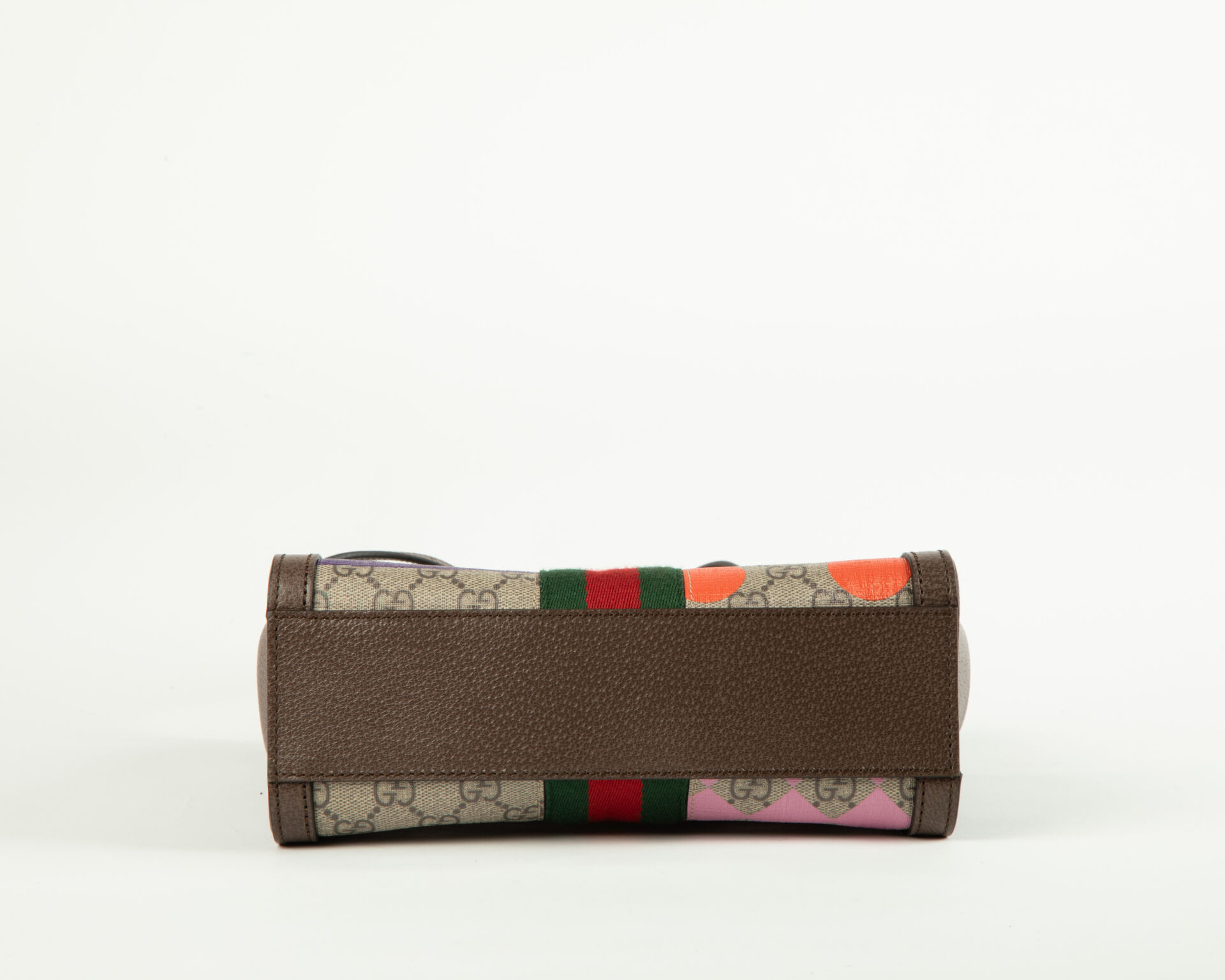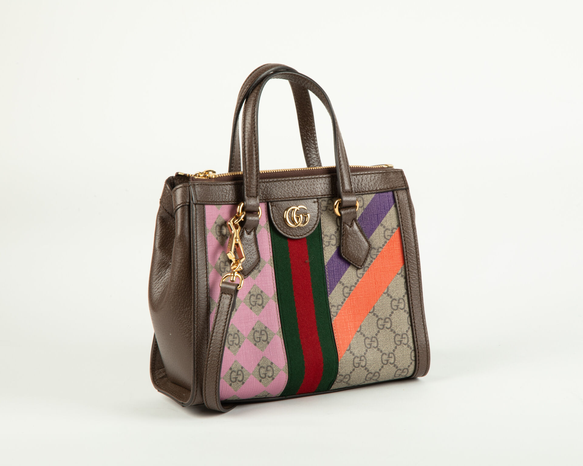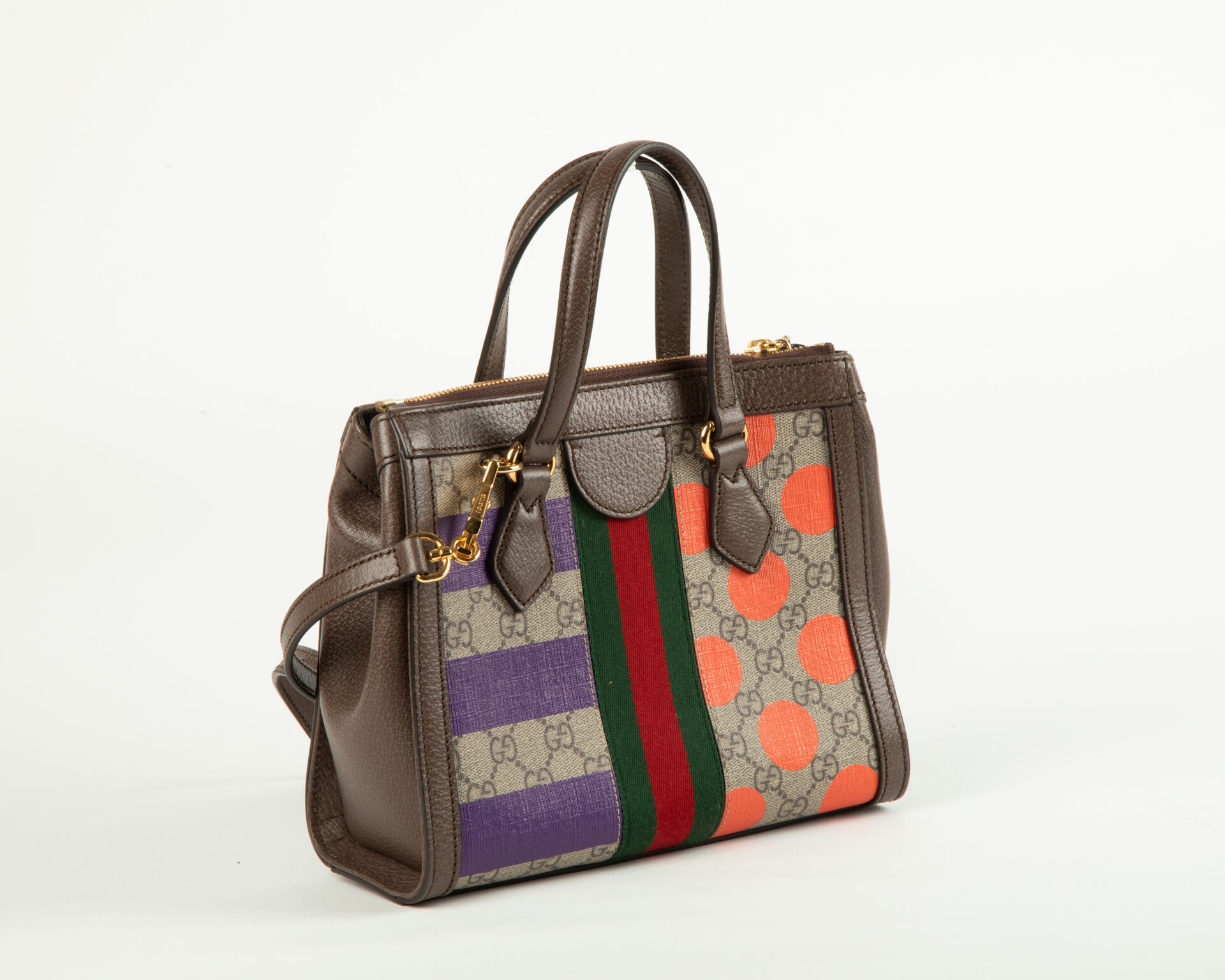 Modèle Ophidia – Sac à main en cuir et toile monogram à décor géométrique polychrome à deux anses et une bandoulière, accastillage en métal doré, ouverture par zip, intérieur en toile beige à deux pochettes appliquées