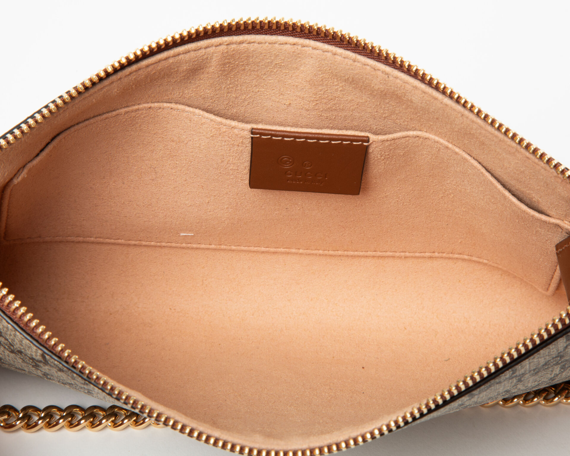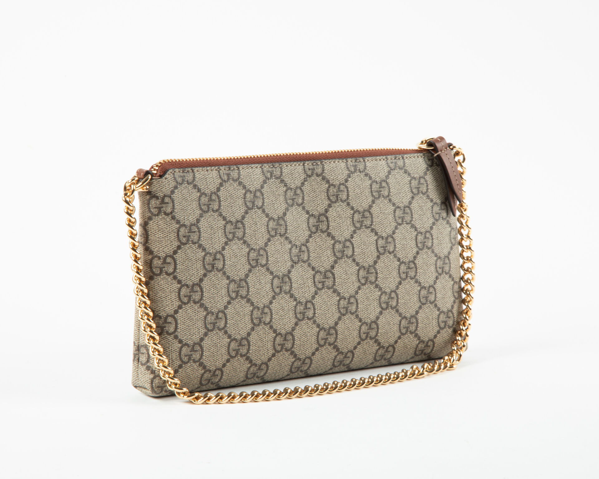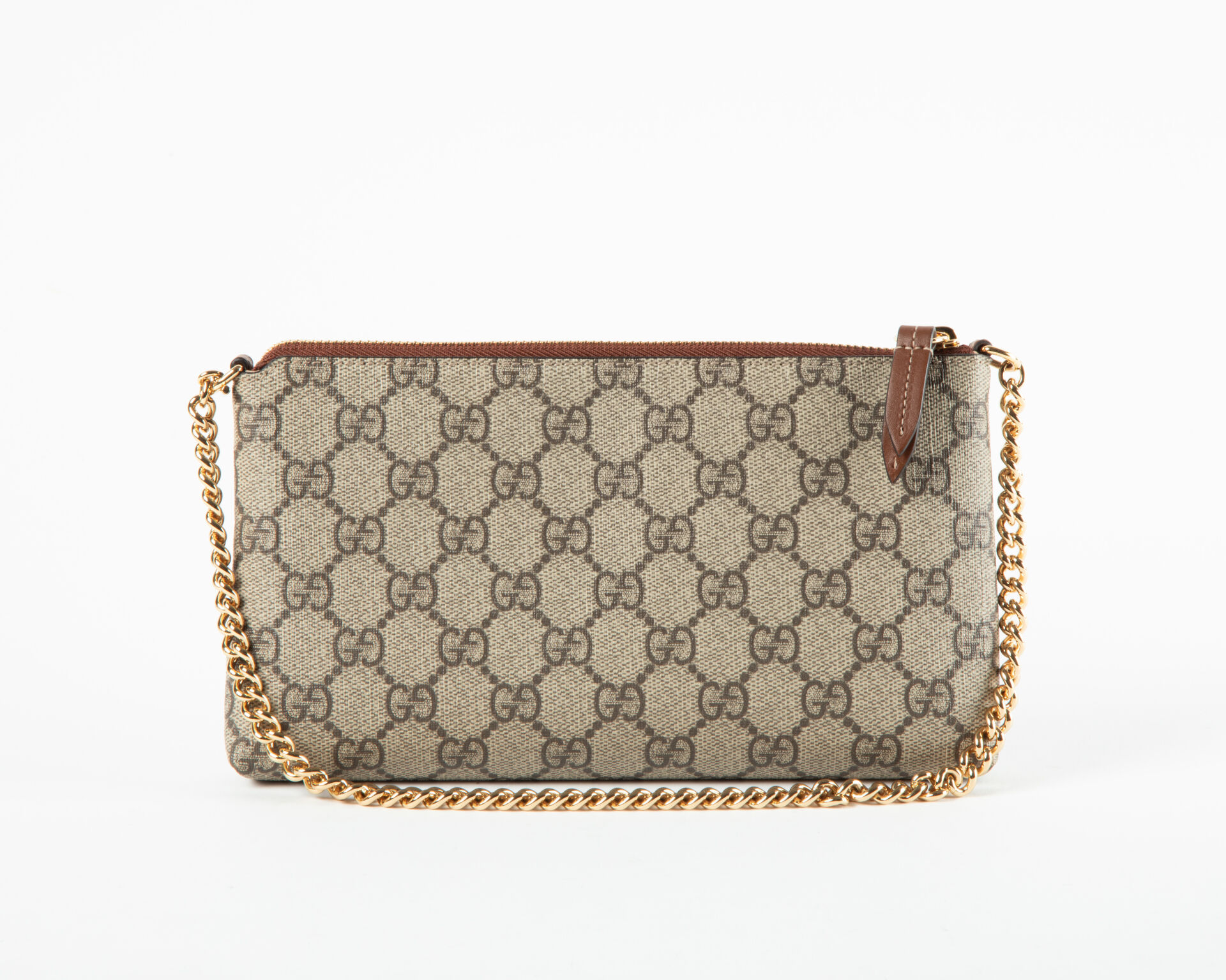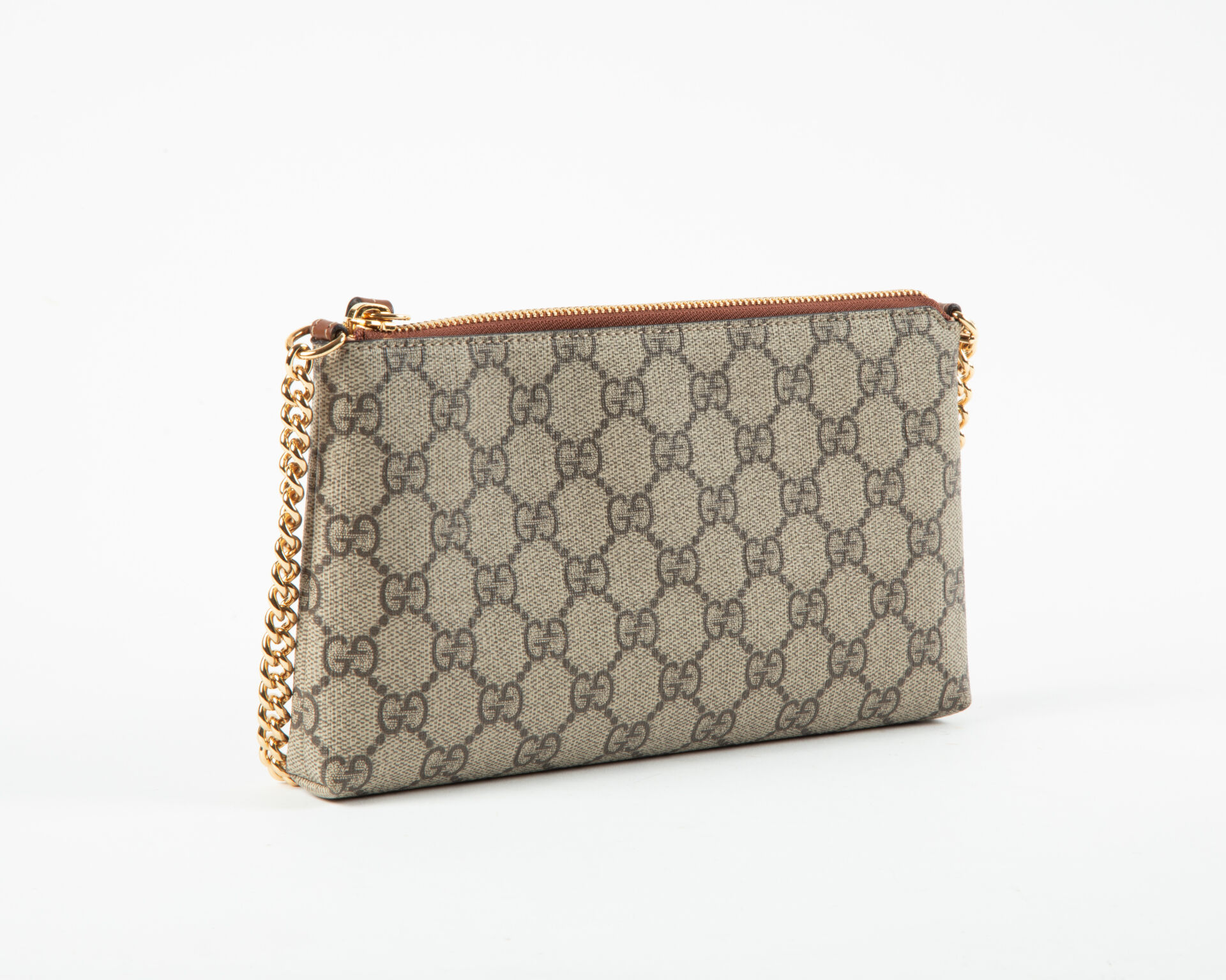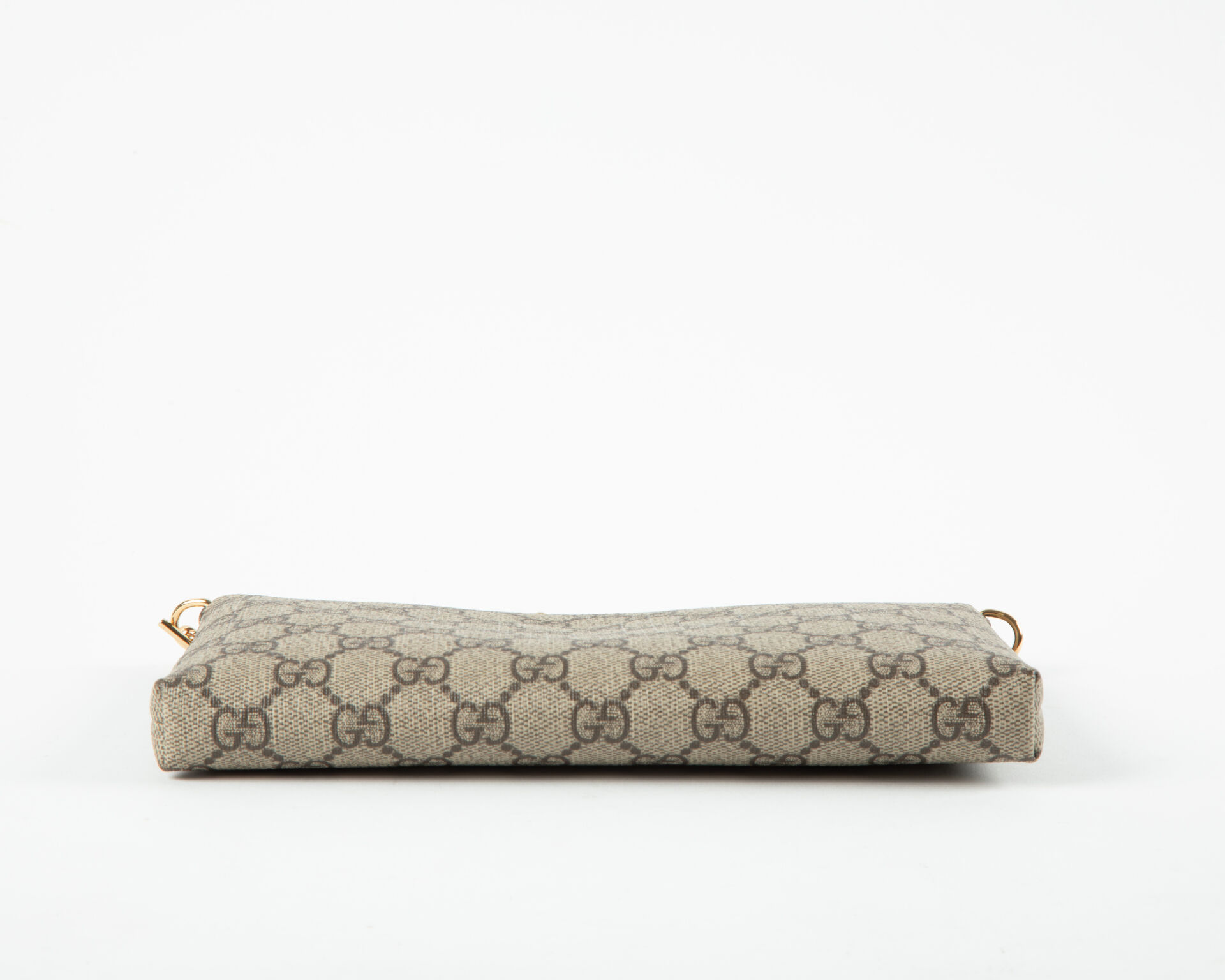 Pochette en toile GG Suprème, accastillage en métal doré, chainette porter épaule en métal doré, ouvrant à un compartiment zippé, intérieur à une pochette plaquée.