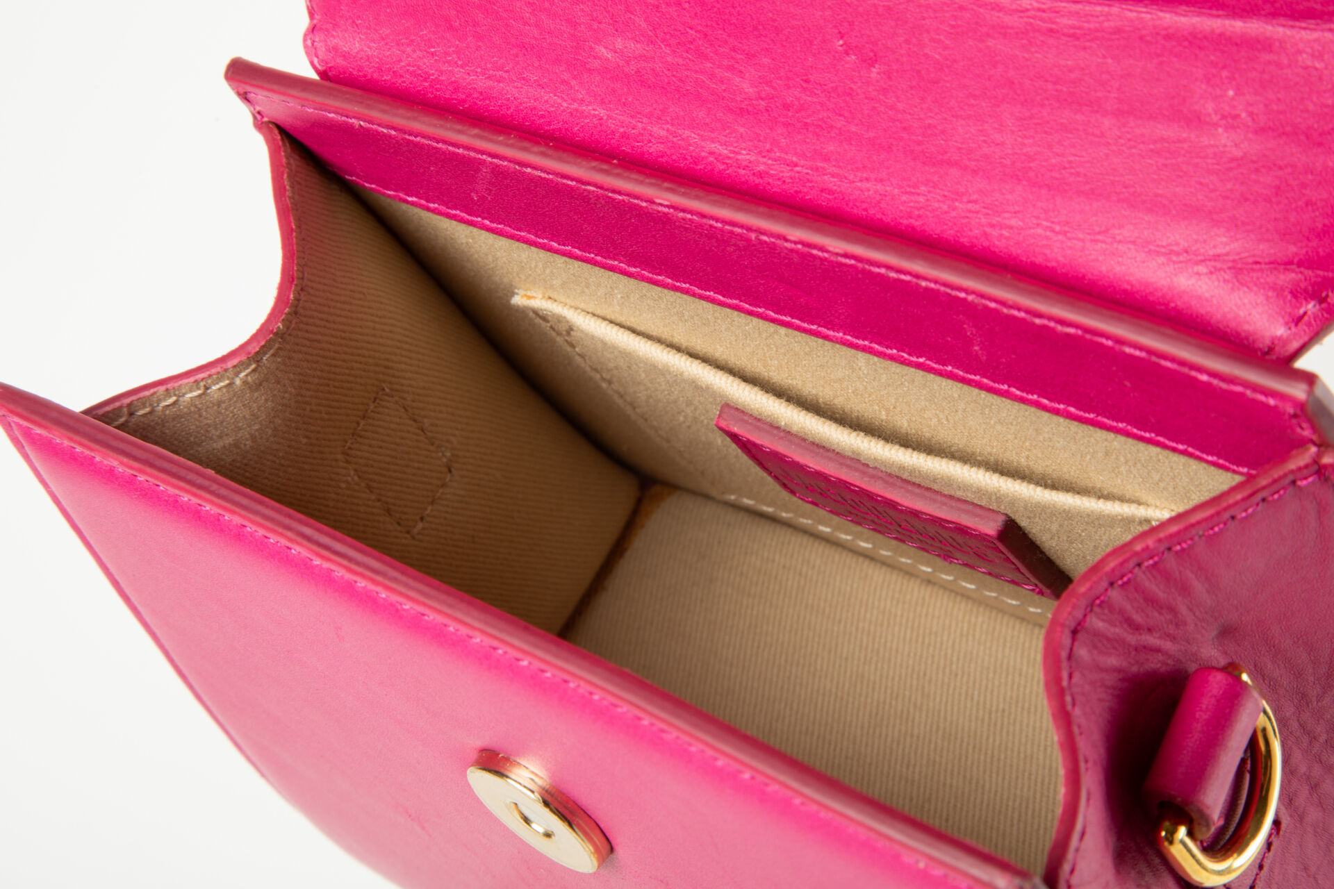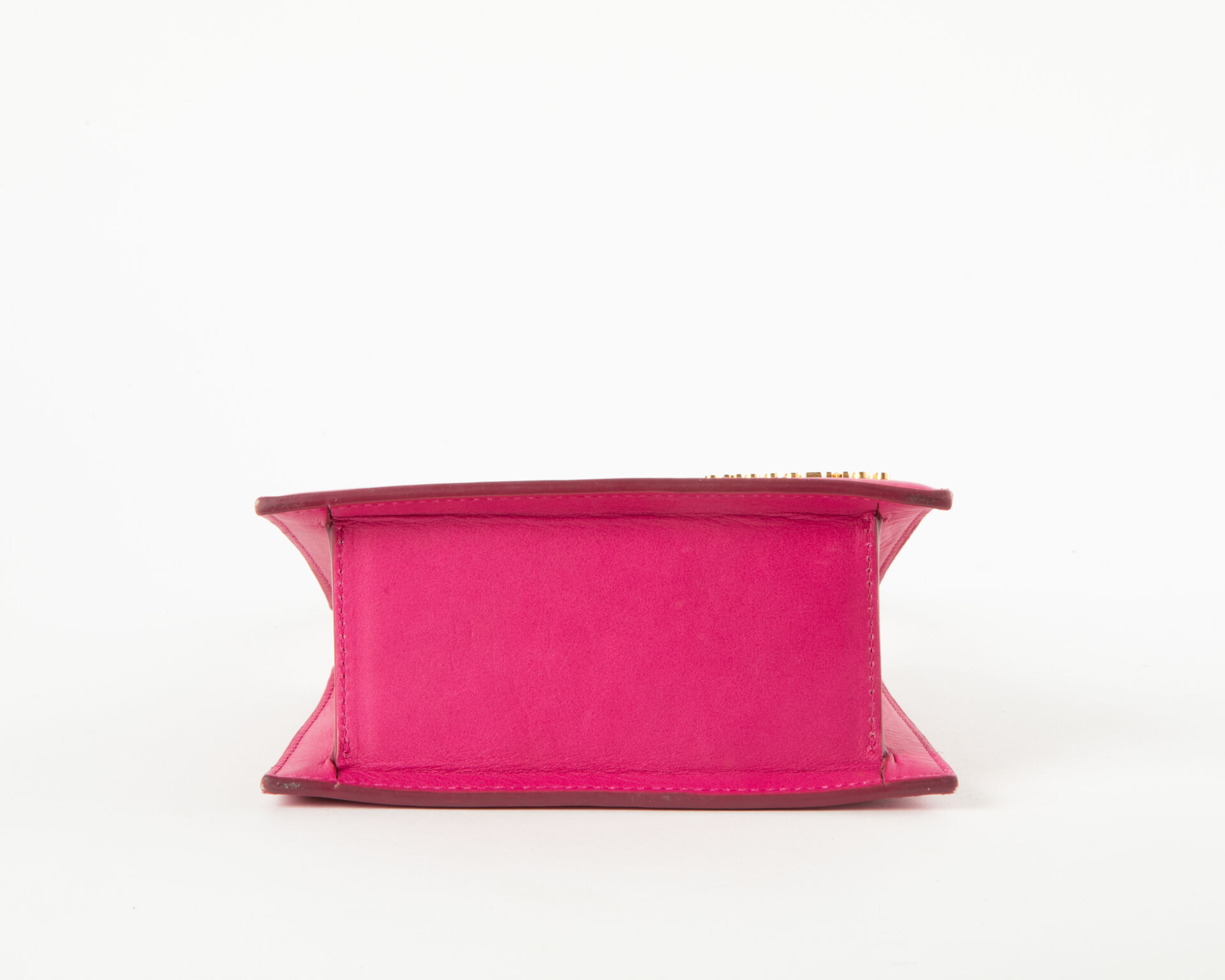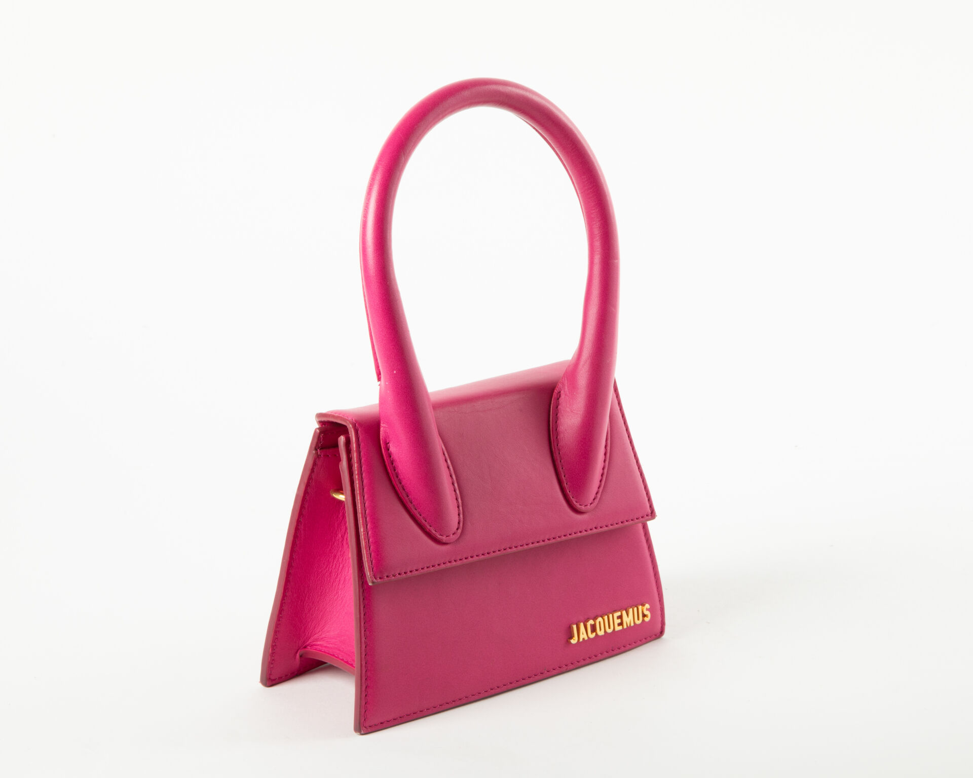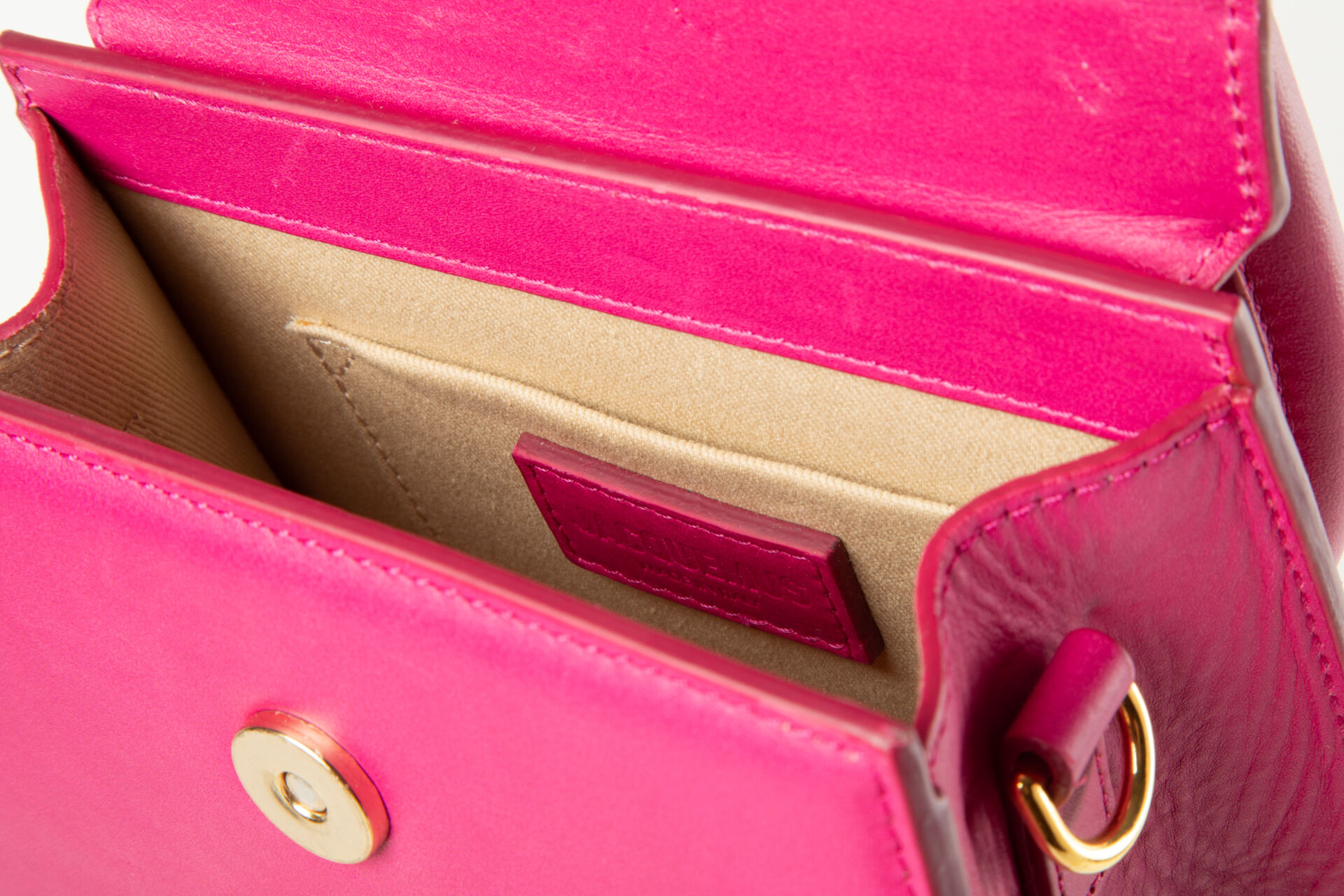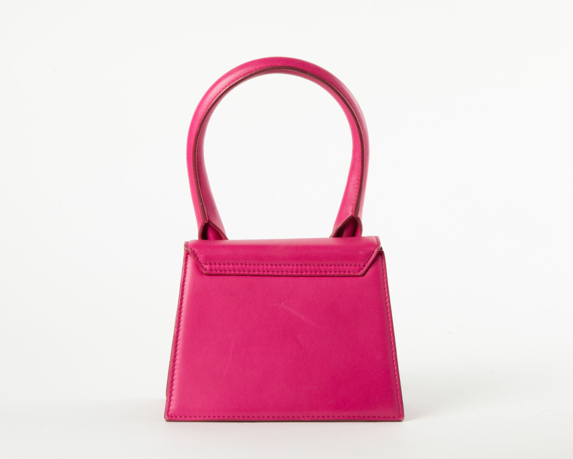 204 ESTIMATION: 80 / 120 € JACQUEMUS Modèle Chiquito – Sac à main en cuir fuchsia à une anse, accastillage en métal doré, intérieur en tissus beige à une poche plaquée Légers frottements aux angles H : 13 (hors anse) – L : 18 – P : 8.5 cm