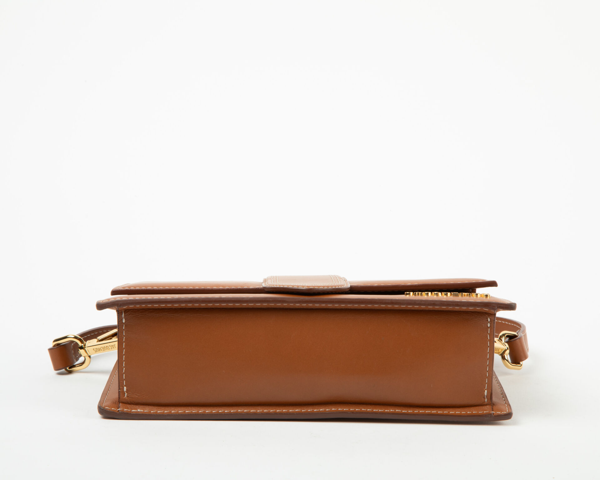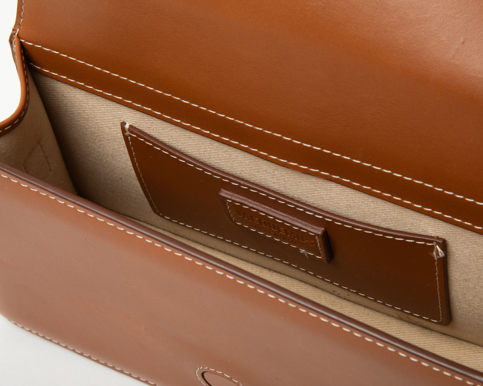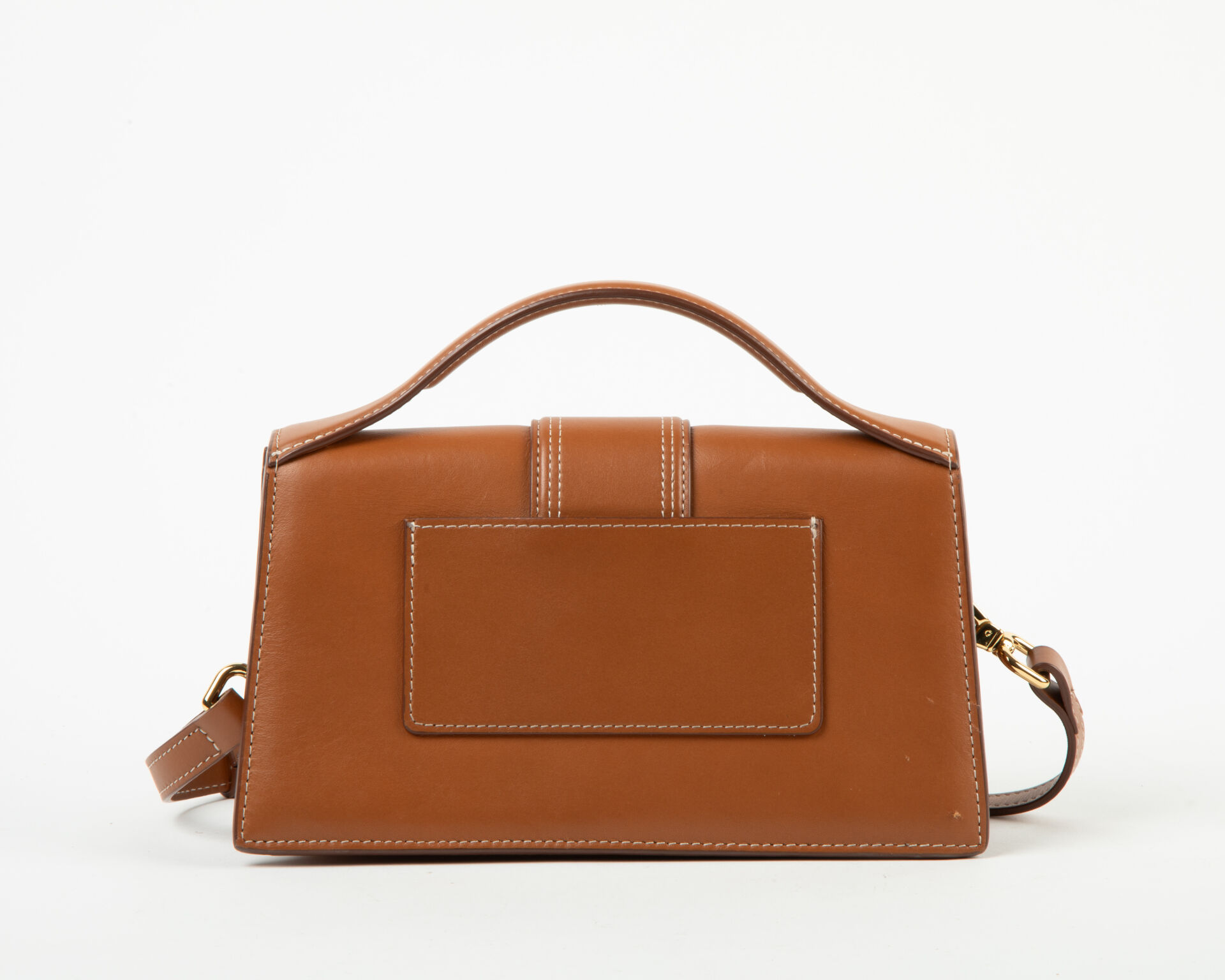 Modèle Le Grand Bambino – Sac baguette en cuir lisse marron à surpiqure beige, porter main avec bandoulière, fermeture aimantée, poche appliquée au dos, accastillage en métal doré, intérieur en tissus crème à une poche appliquée en cuir