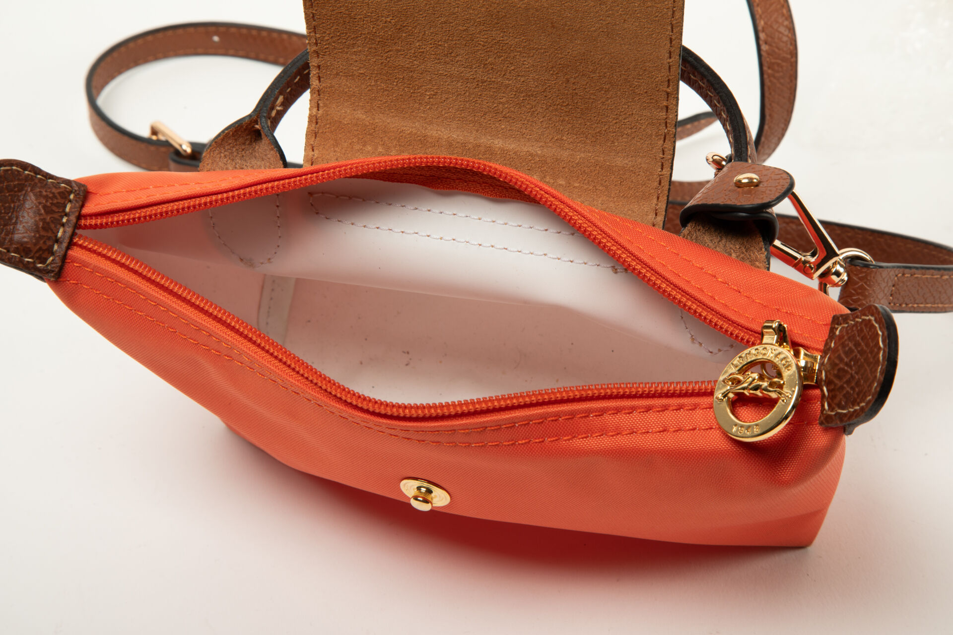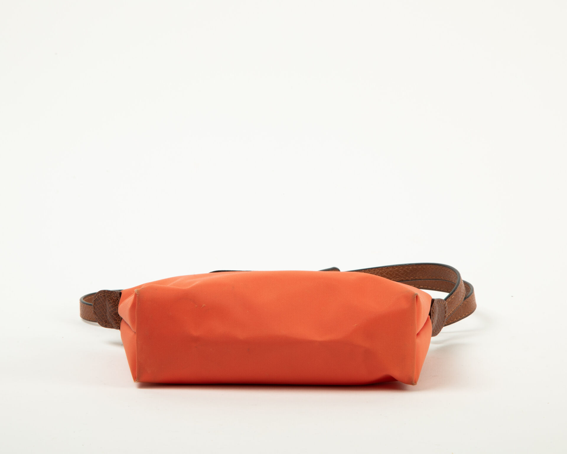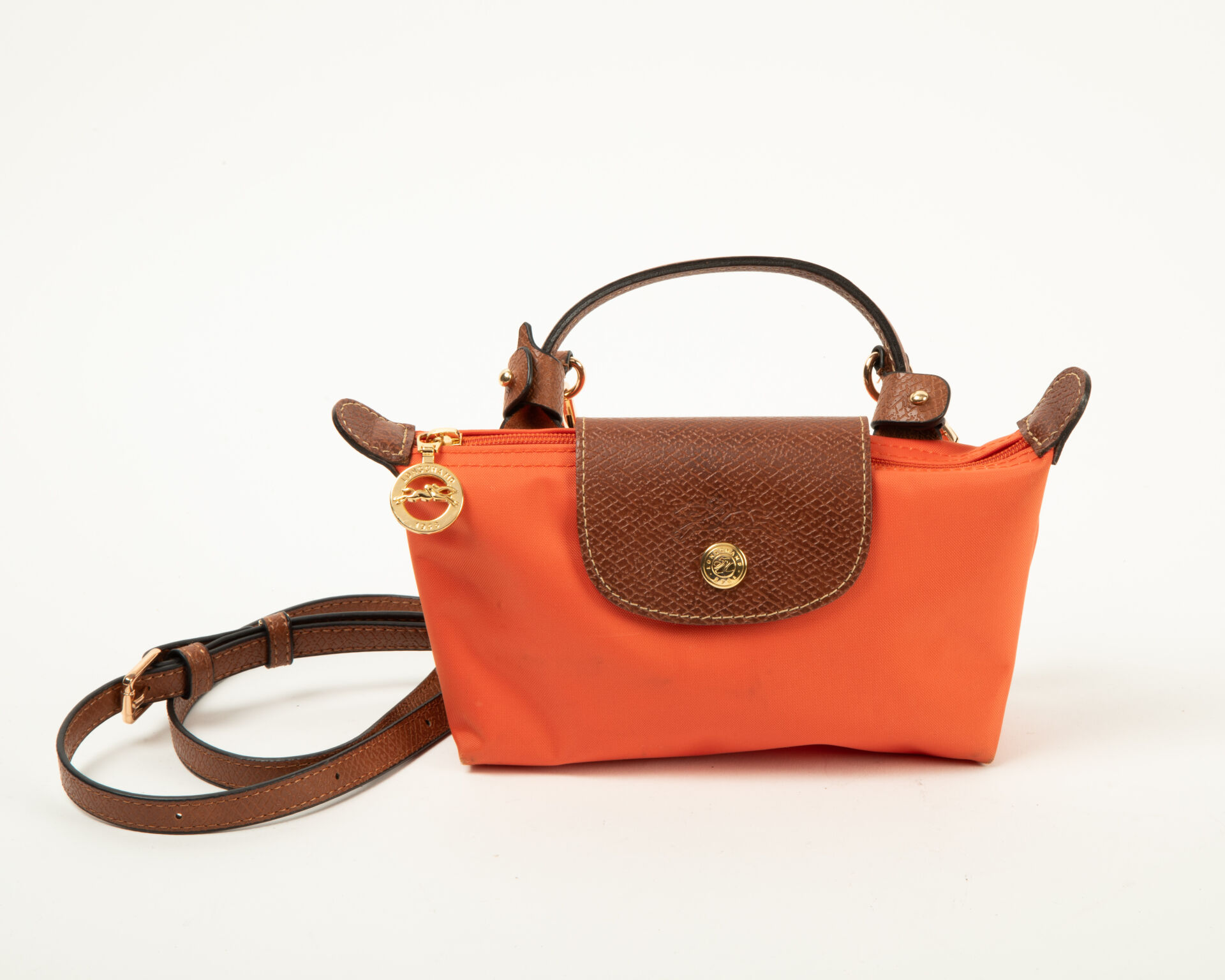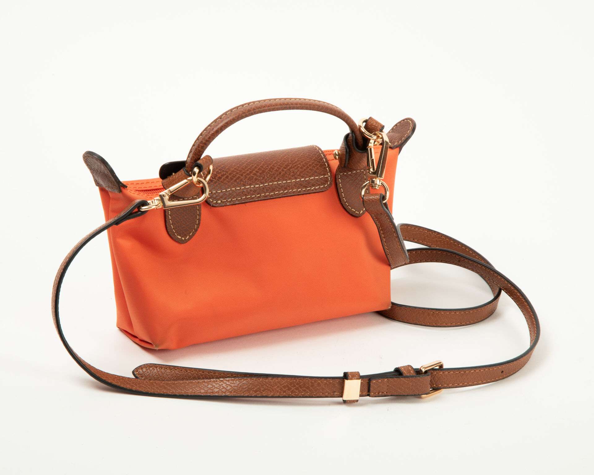 208 ESTIMATION: 30 / 50 € LONGCHAMP Le pliage mini en toile orange et cuir de vachette grainé porter bandoulière à une anse, accastillage en métal doré, intérieur blanc Tâches, angles frottés H : 11 – L : 17 – P : 5 cm