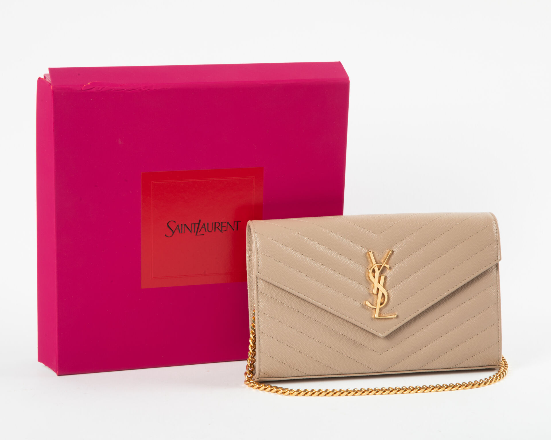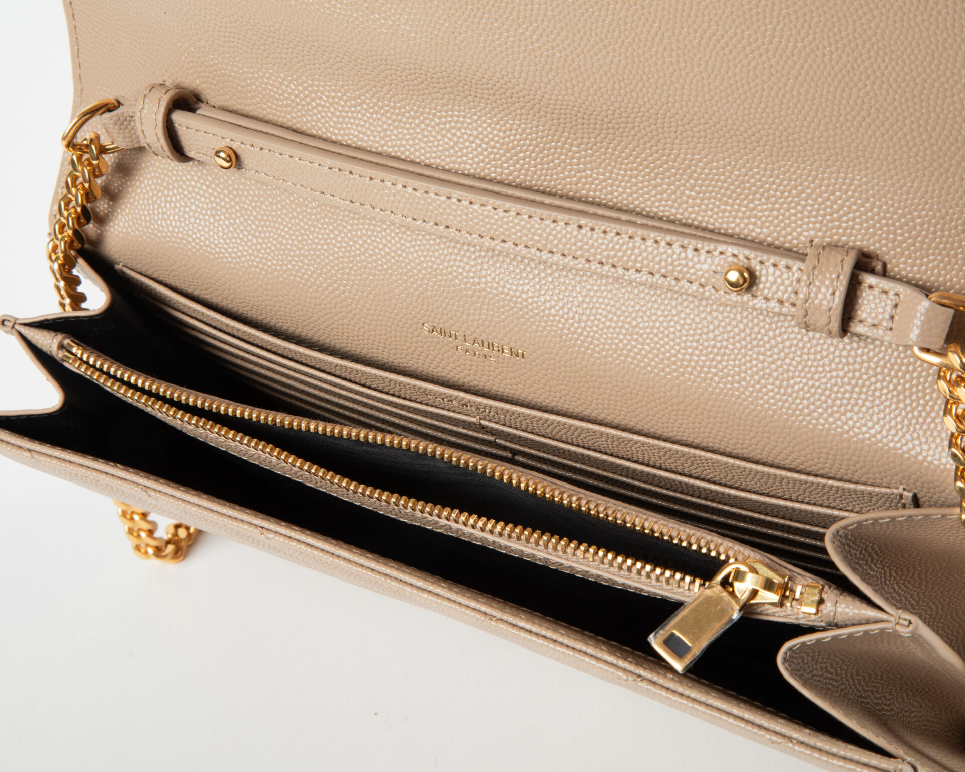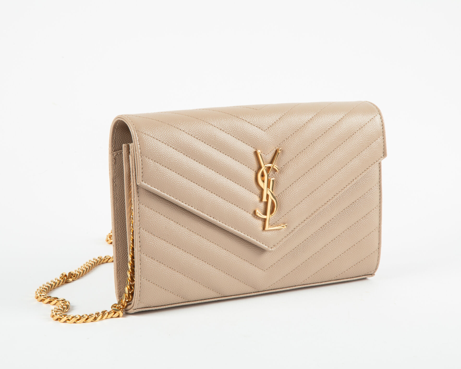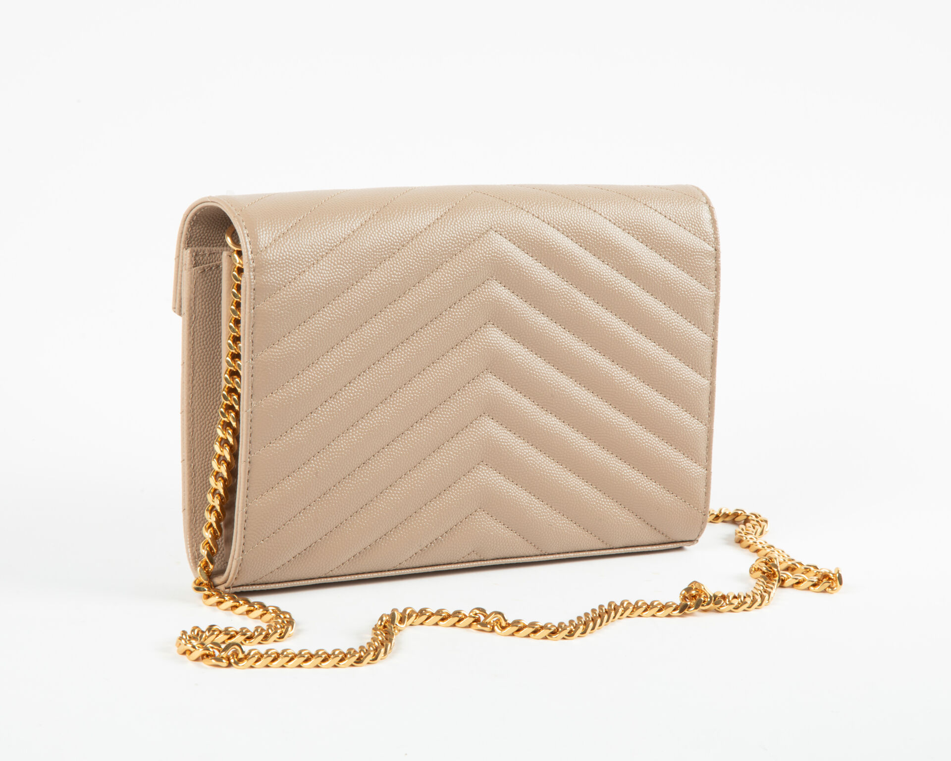 Modèle Cassandre – Pochette à chaine en cuir d’agneau crème à matelassage à chevrons, accastillage en métal doré, chainette porter épaule amovible en métal doré. Rabat à pression découvrant deux compartiments séparés par une poche zippée, pochette appliquée pour rangement des cartes au fond.