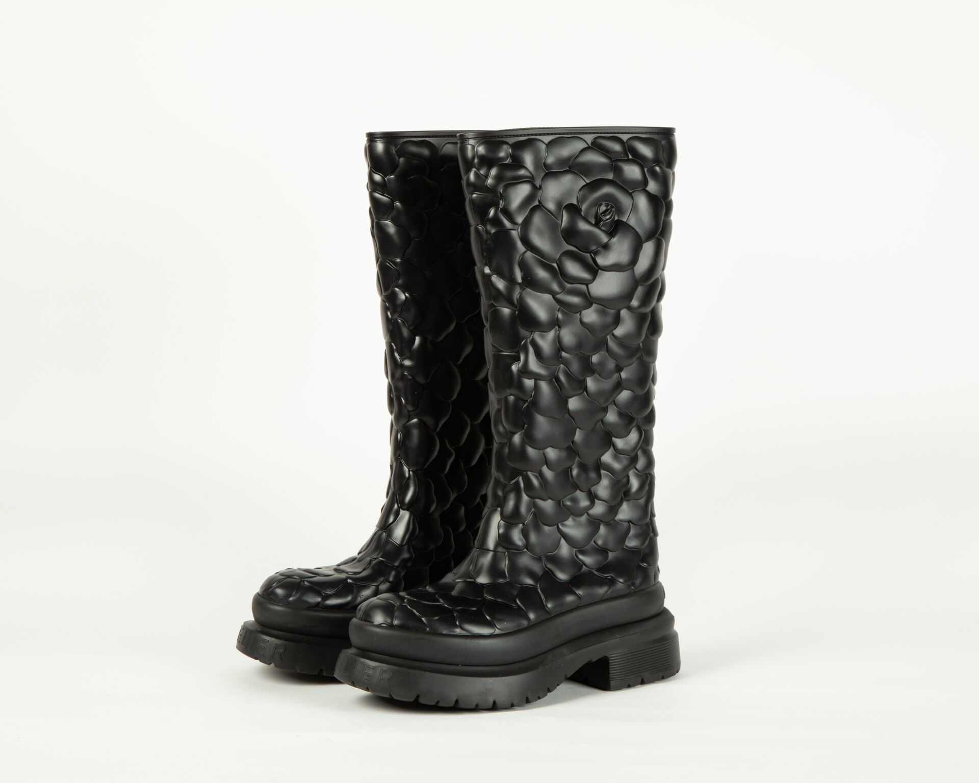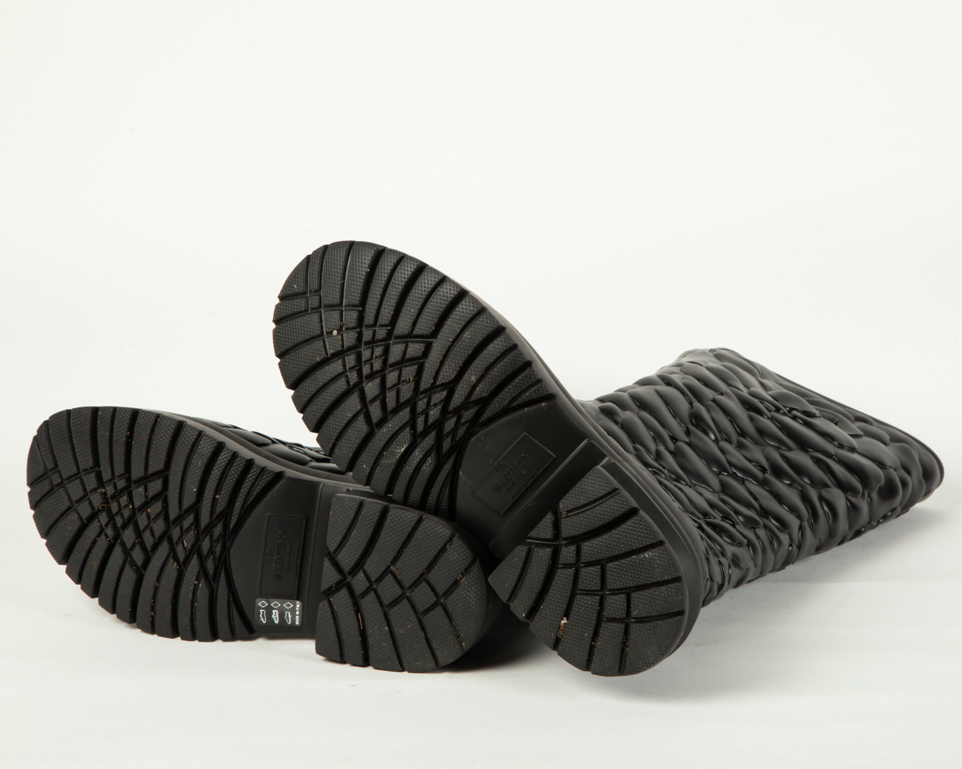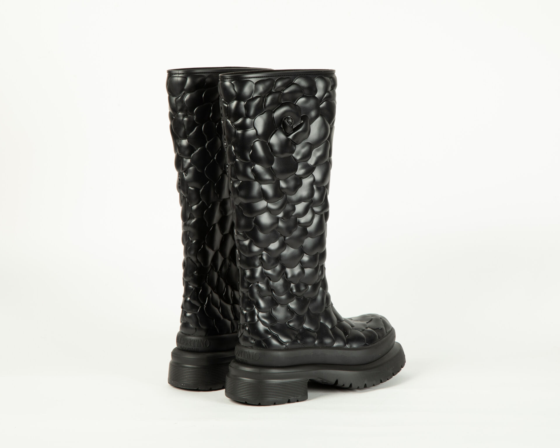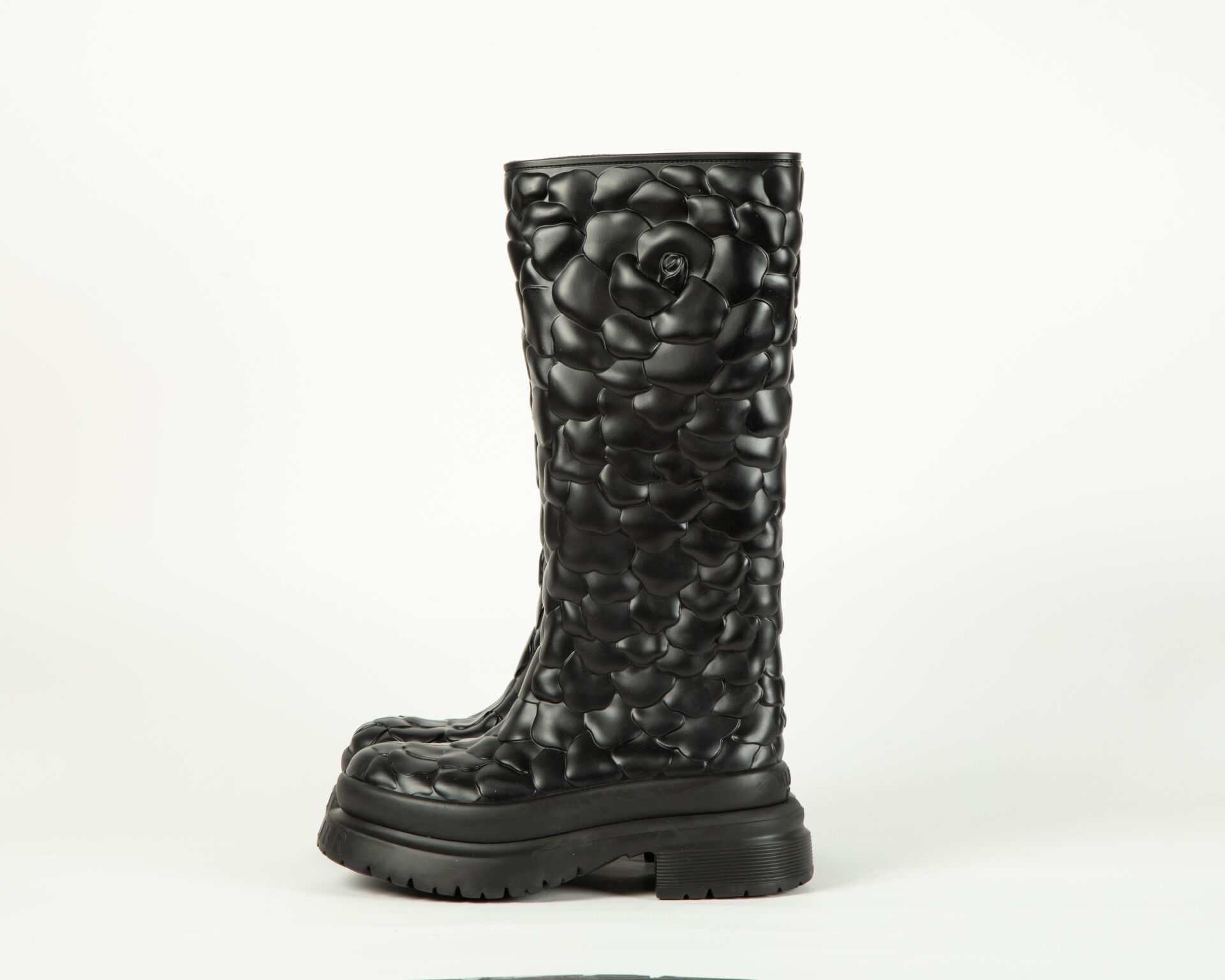214 ESTIMATION: 80 / 120 € VALENTINO Modèle Rose – Paire de bottes de pluie en caoutchouc noir à décor en relief de roses et pétales de roses Pointure : 39 Dans leur boite