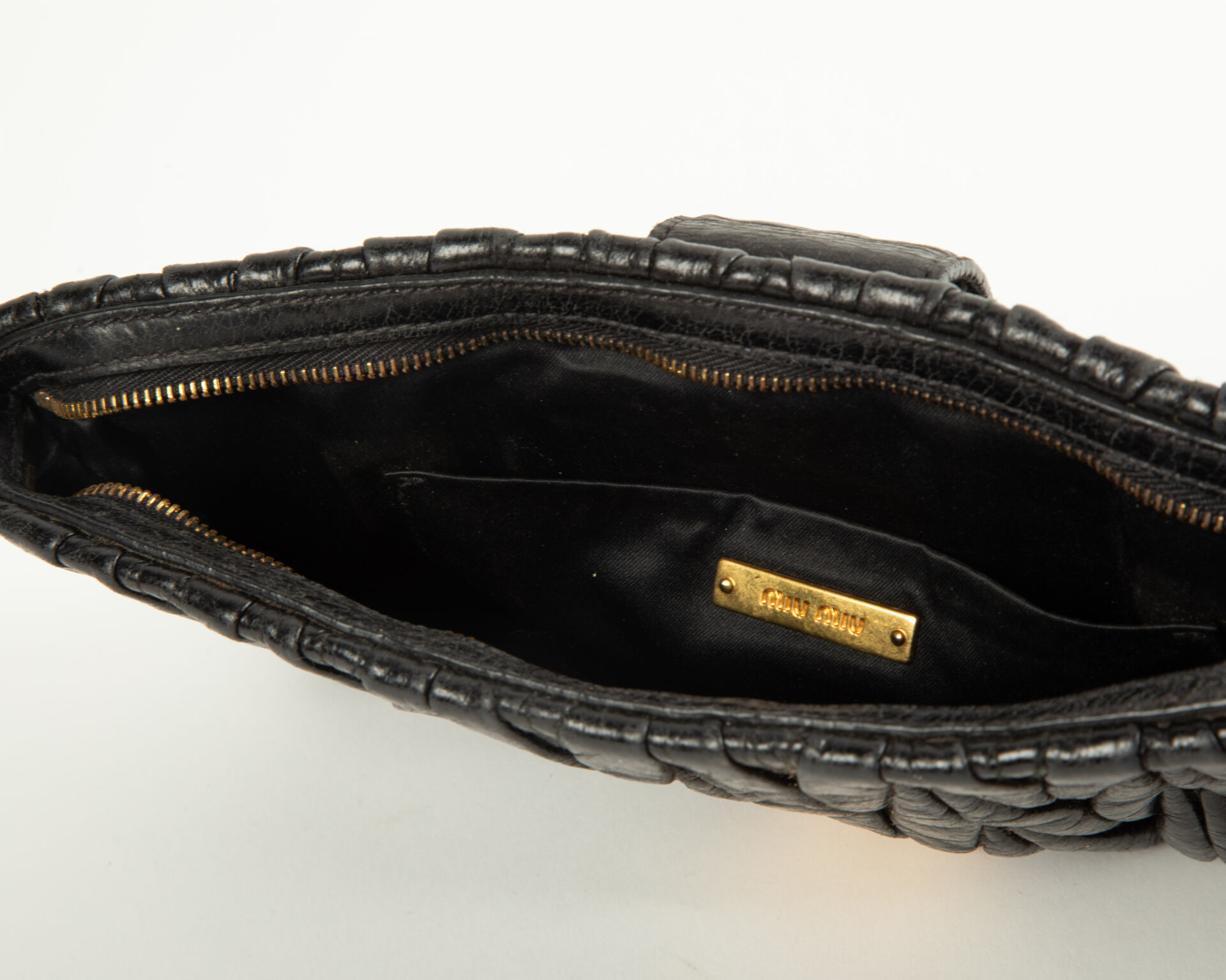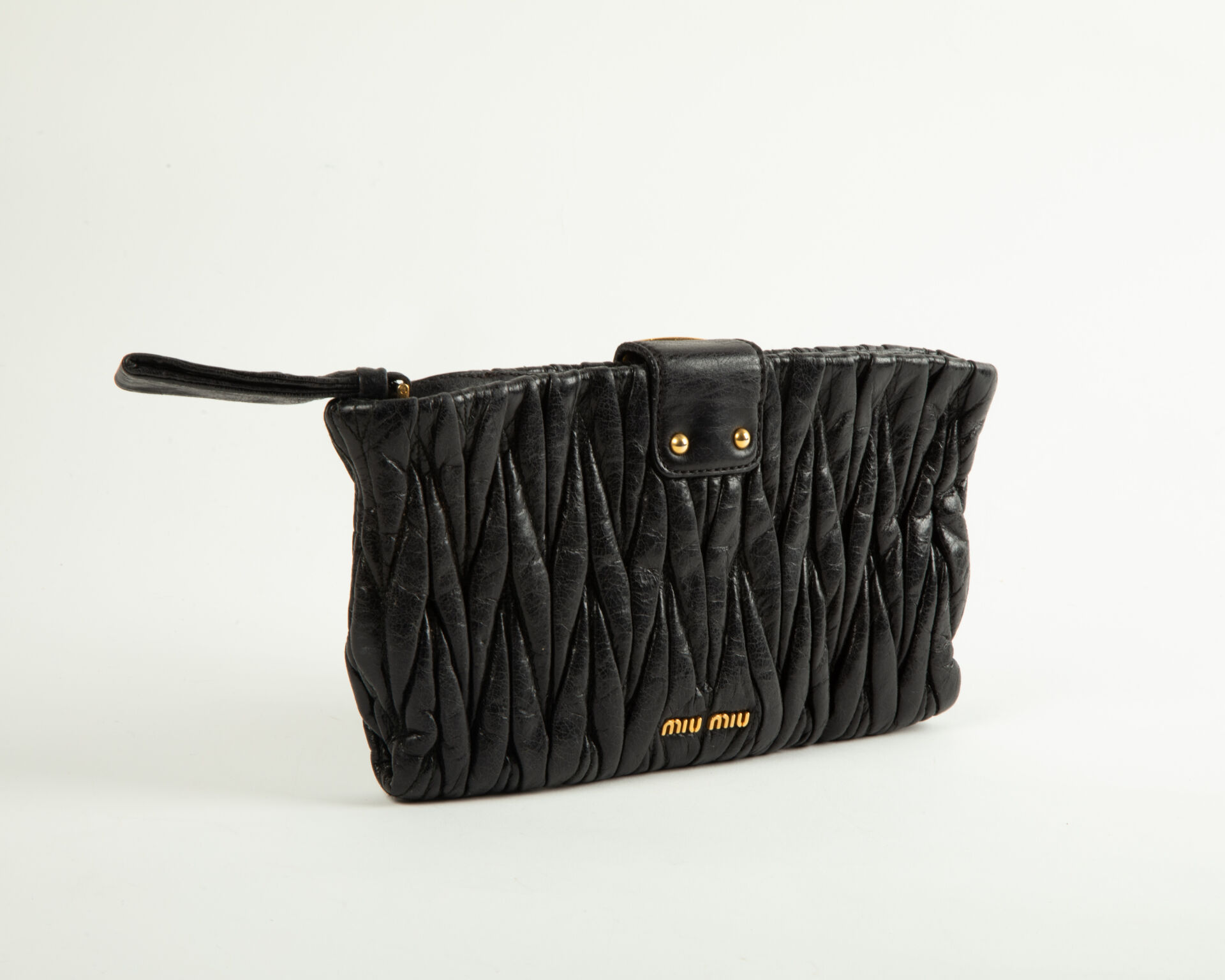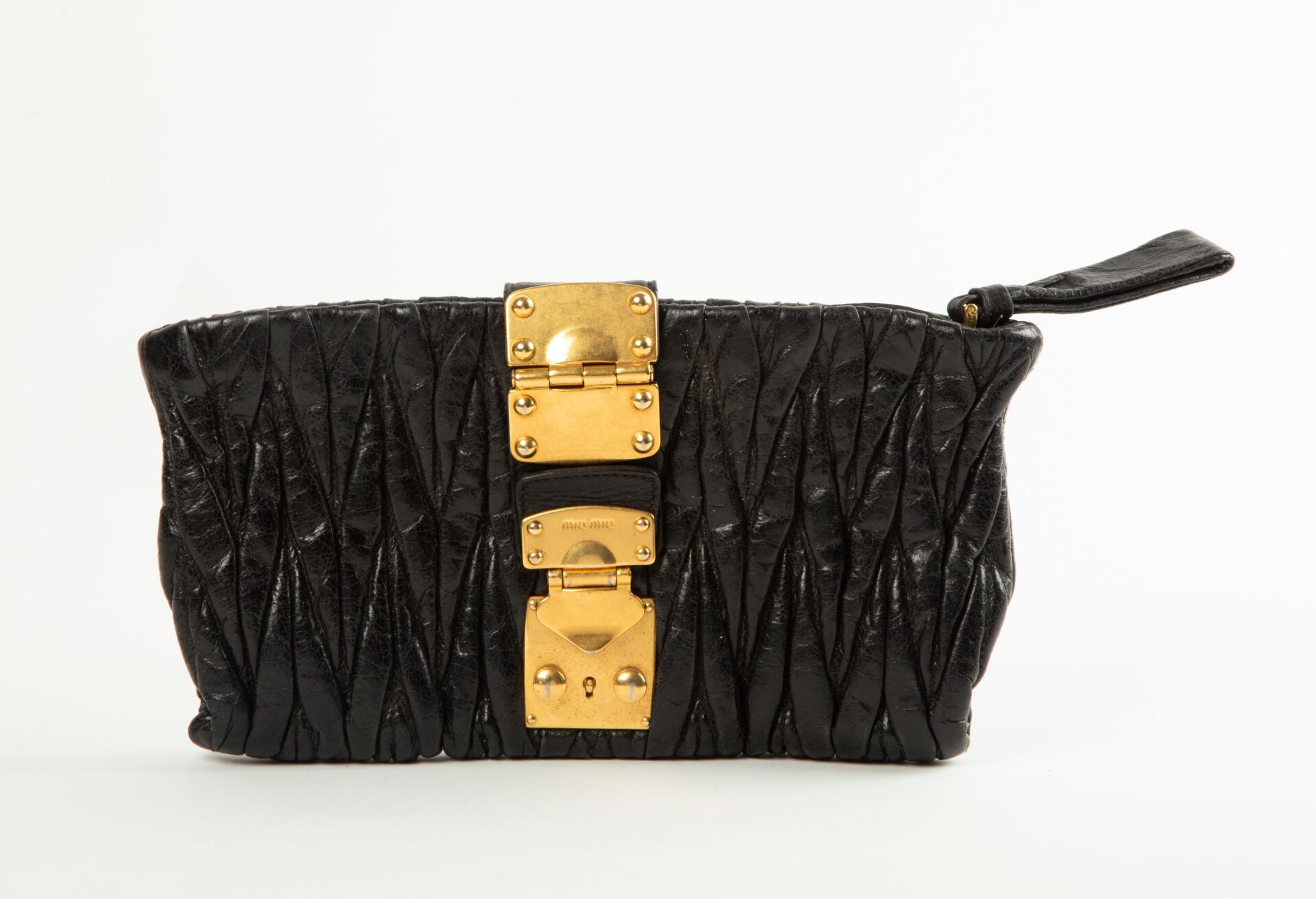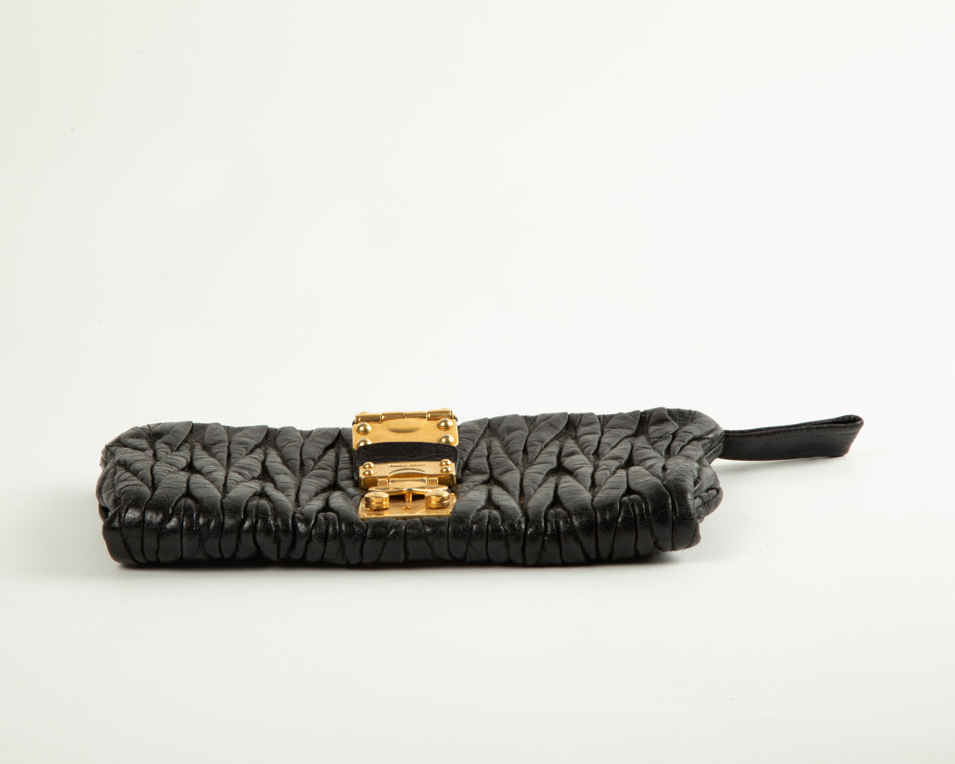 Pochette en cuir nappa noir à accastillage en métal doré, intérieur en tissus noir à une poche en applique