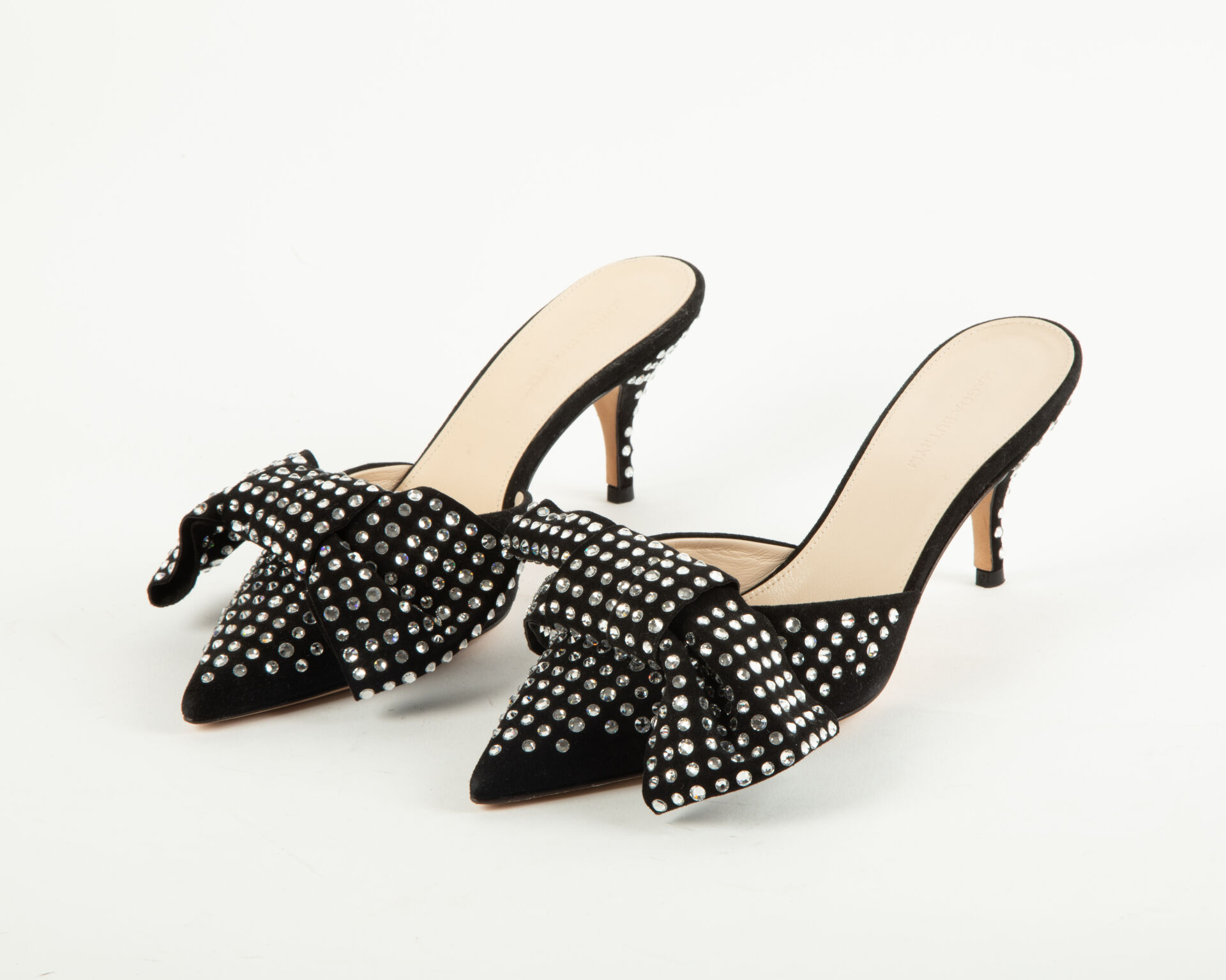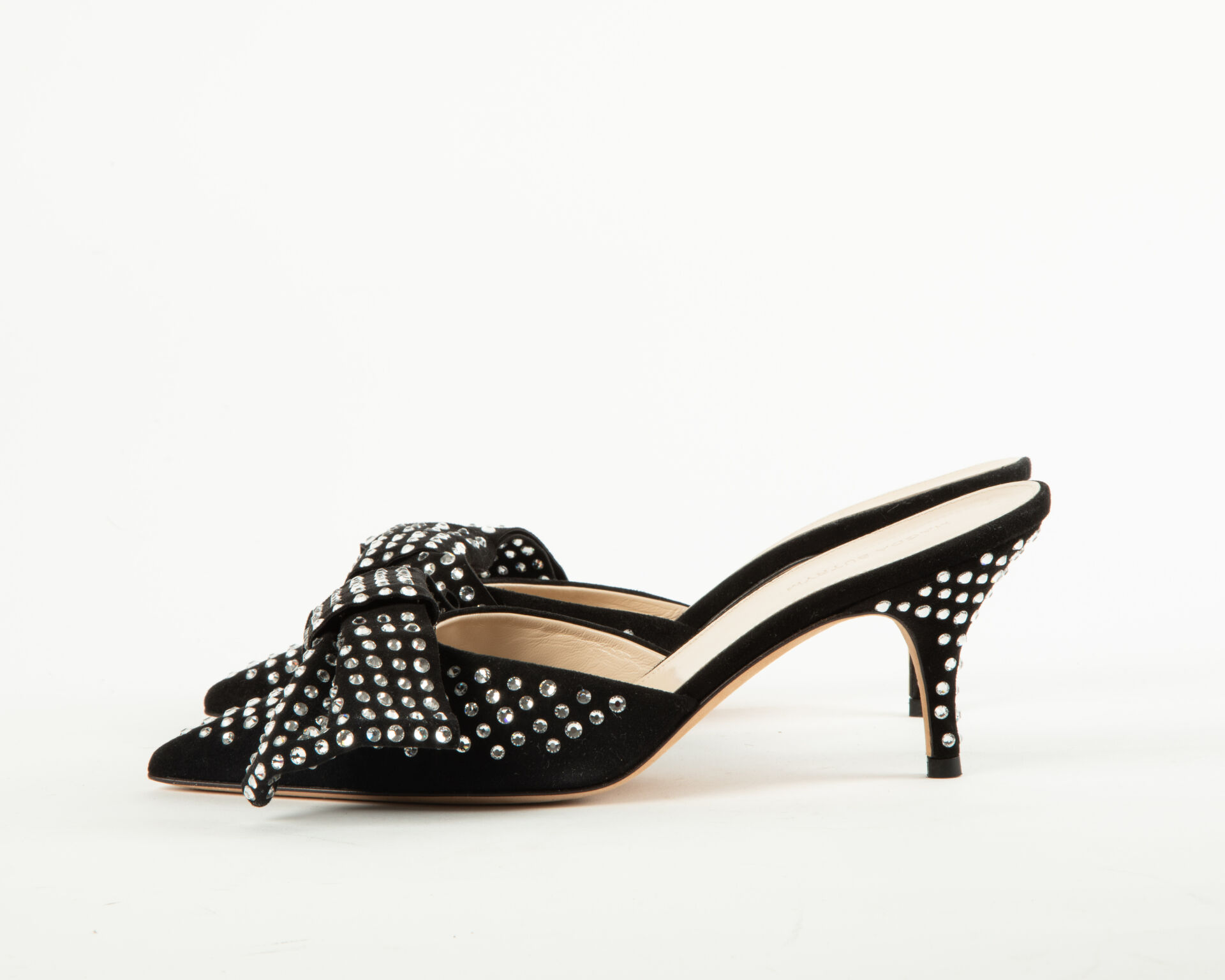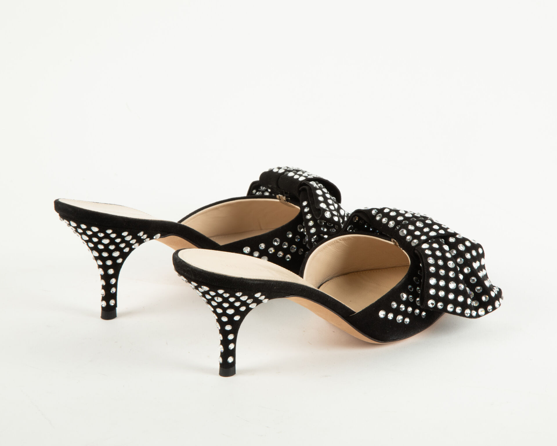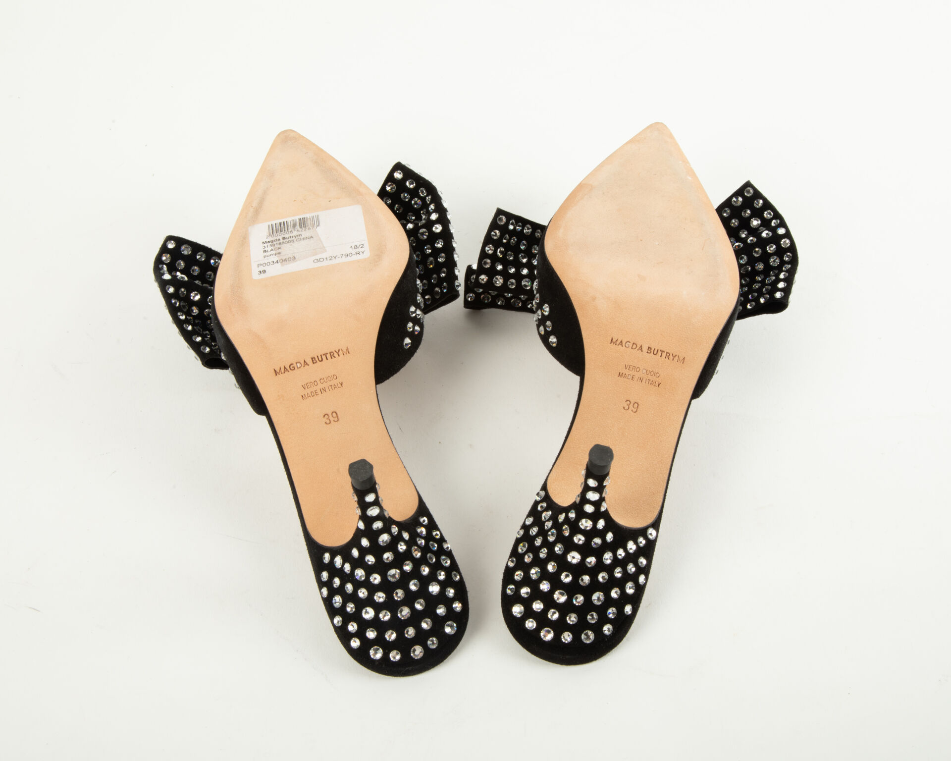 220 ESTIMATION: 80 / 120 € MAGDA BUTRYM Paire de mules à talons aiguille en daim noir pavé de strass à décor d’un important noeud amovible Dans leur boite Taille 39 – Hauteur talon : 7 cm environ