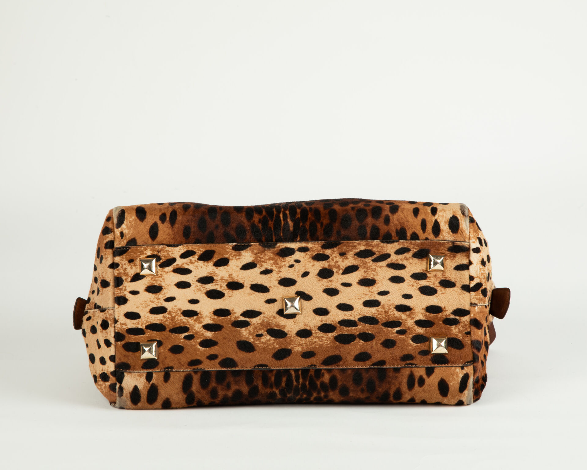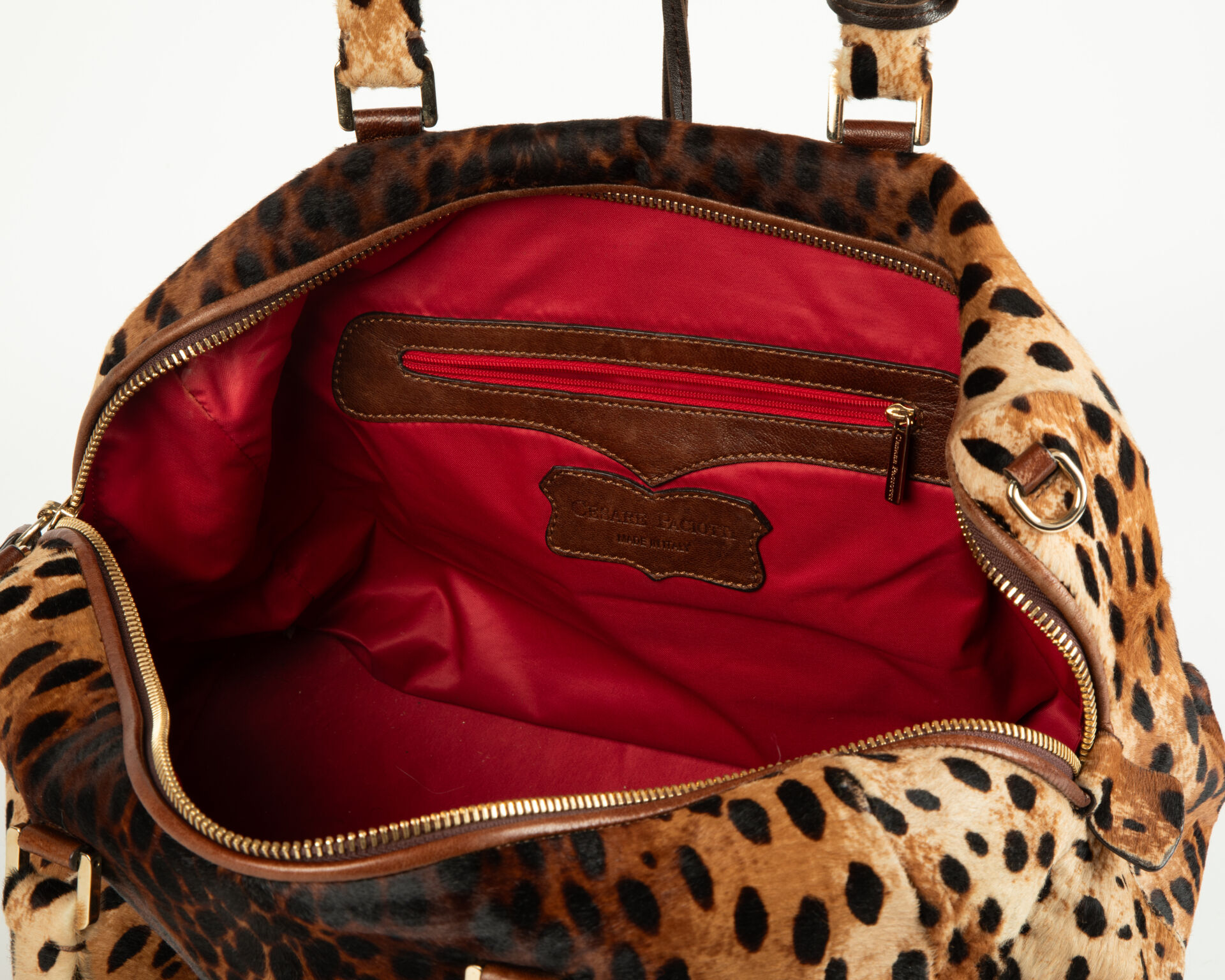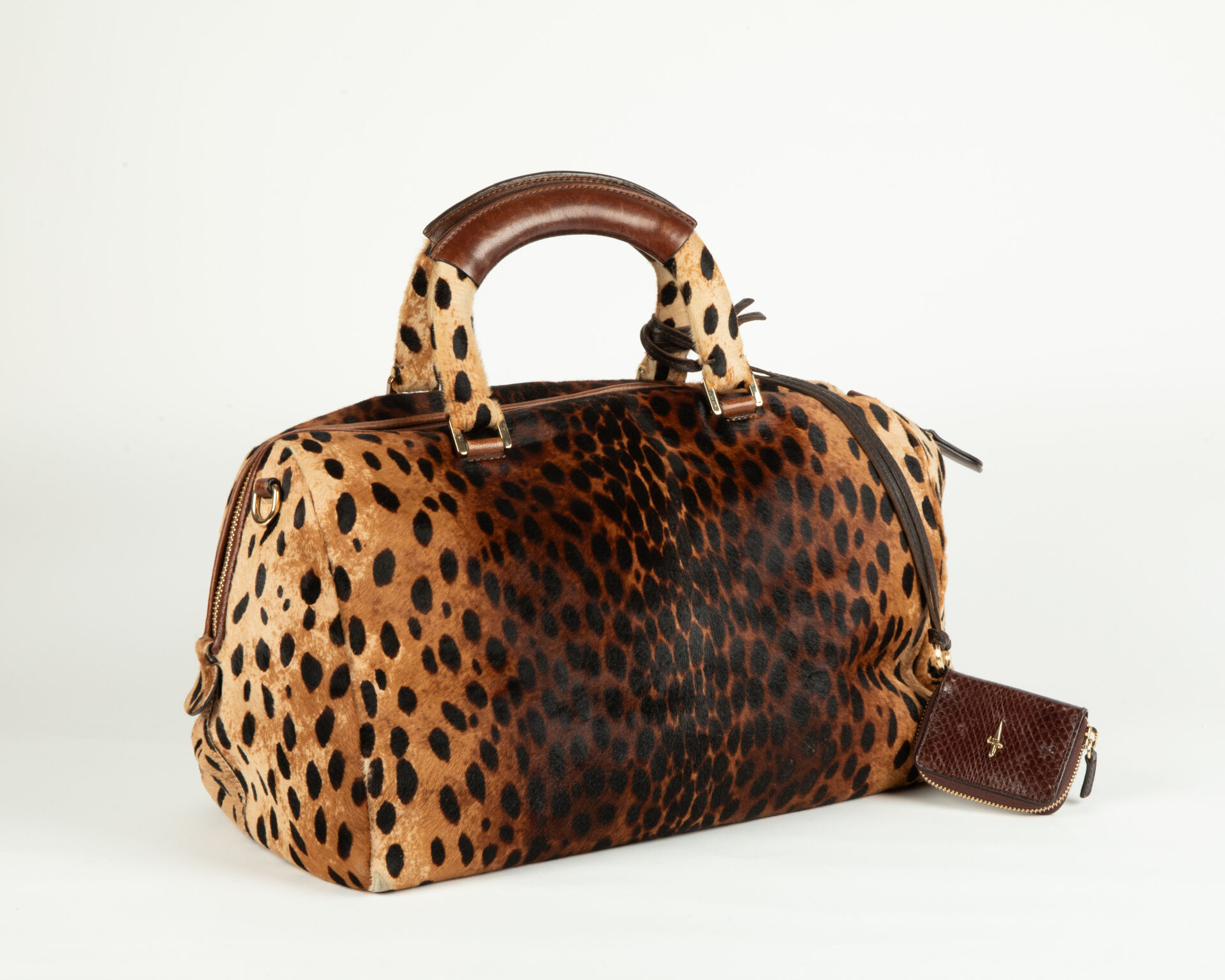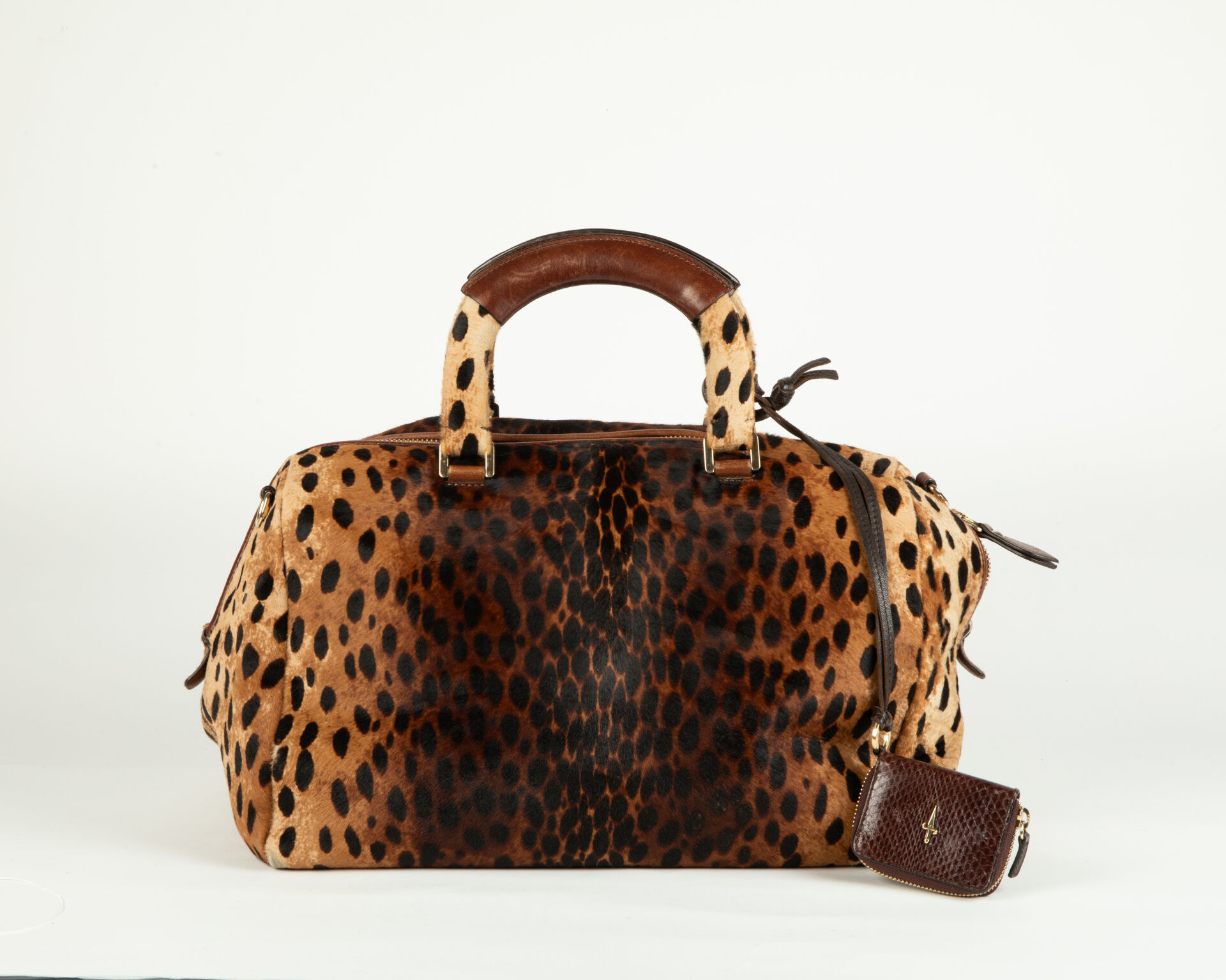 Sac à main en cuir à l’imitation de la peau de léopard et cuir brun à deux anses rigides, doublure en tissus rouge à une poche plaquée zippée, accastillage en métal doré avec son petit portemonnaie d’appoint en cuir brun à l’imitation de la peau de lézard.