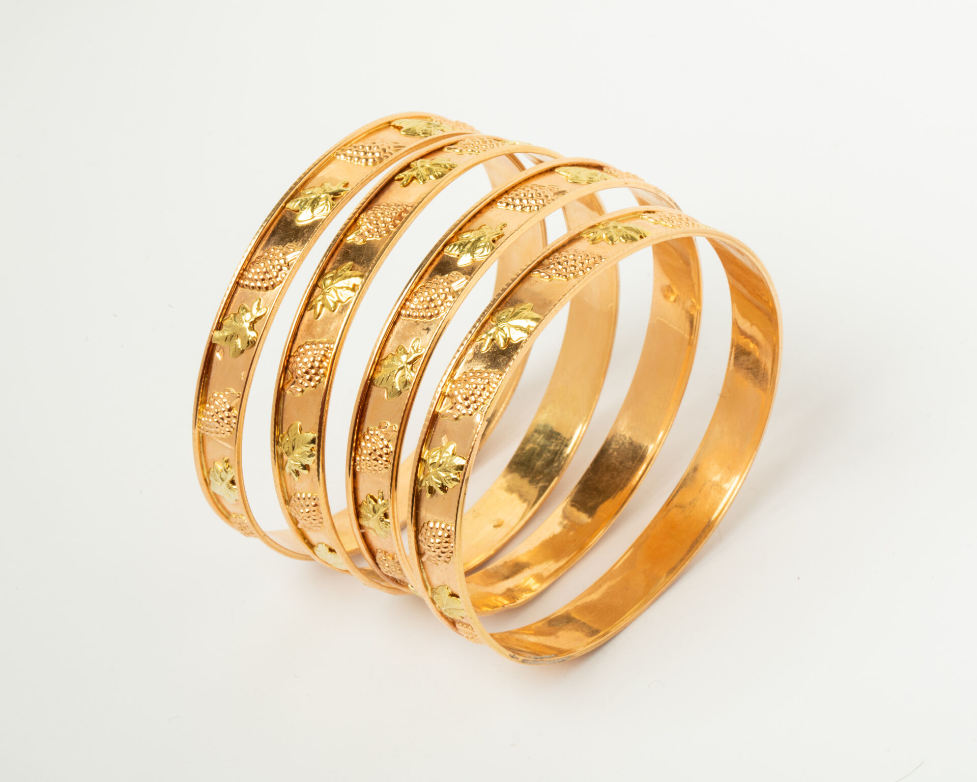 24 ESTIMATION: 2300 / 2400 € Suite de 4 bracelets en or rose (750 millièmes) à décor en or jaune et rose de grappes de raisins et feuilles de vignes D. Intérieur : 6.5 cm Poids : 46 g