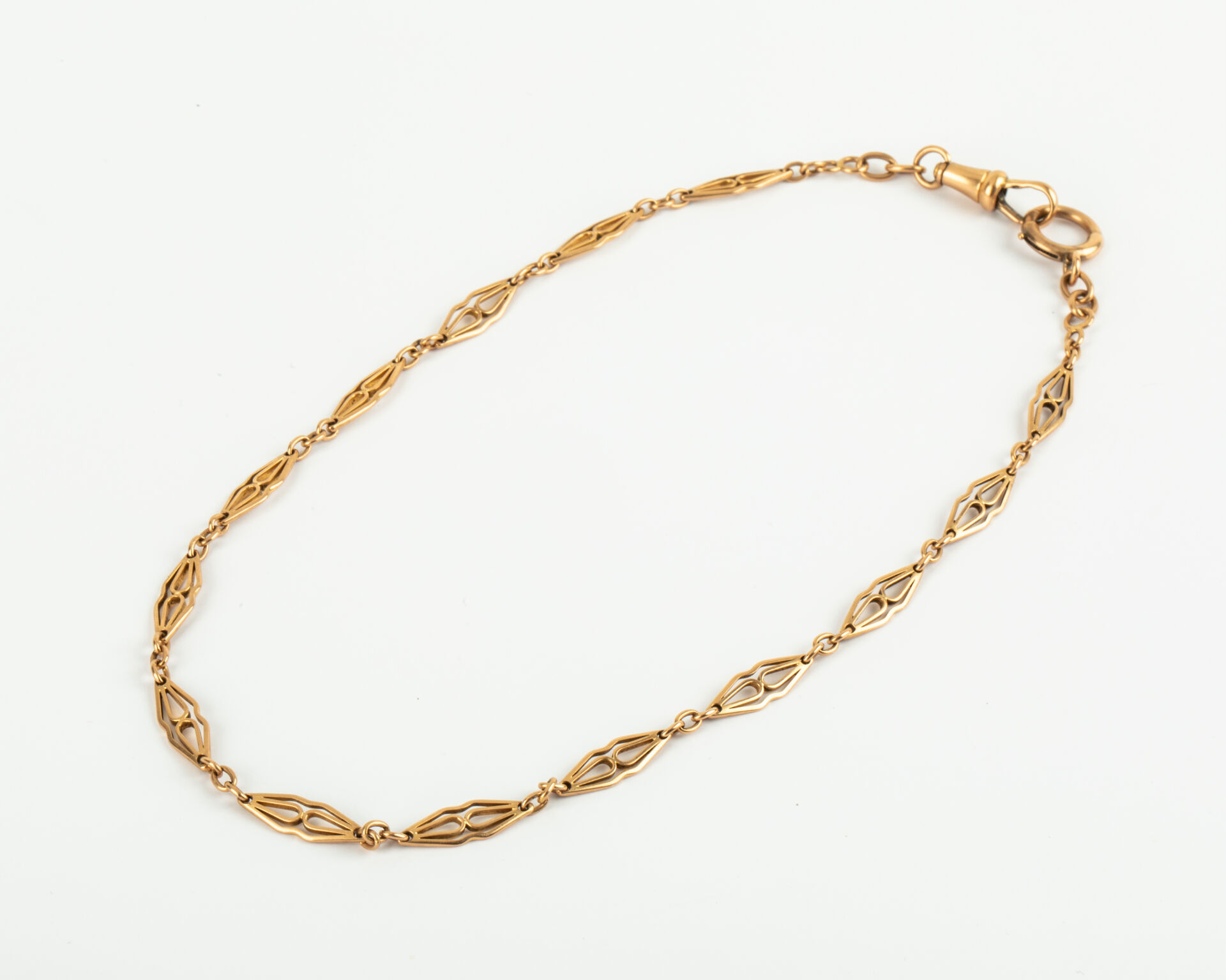 39 ESTIMATION: 800 / 900 € Chaine de châtelaine en or jaune (750 millièmes) à mailles ajourées Poids : 16 g Longueur : 39 cm