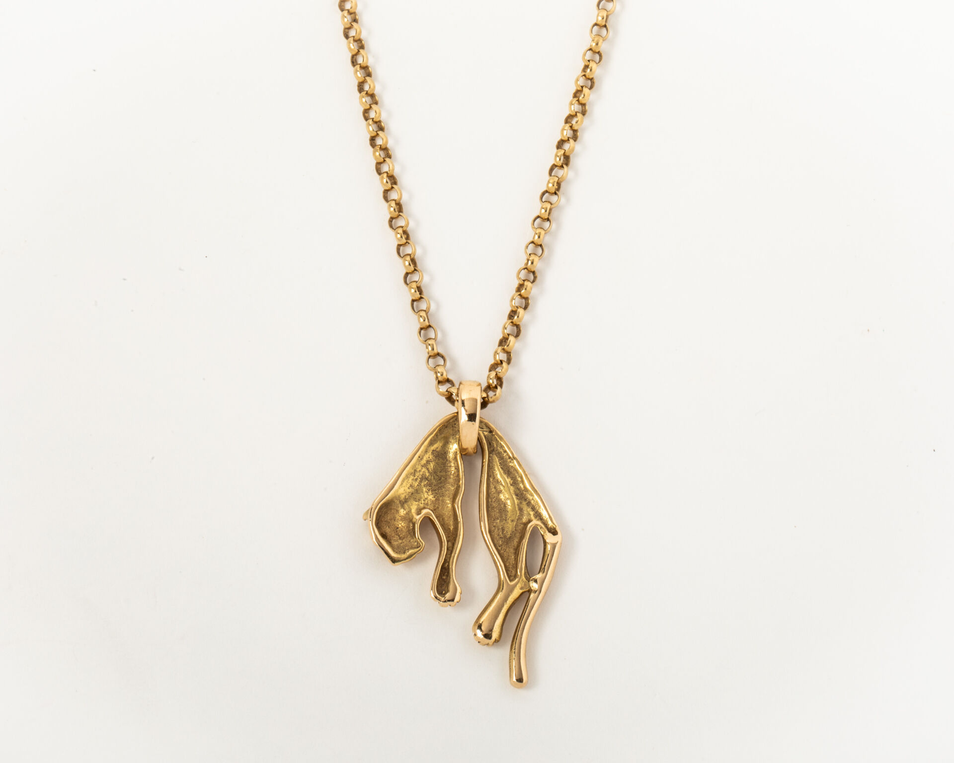 Chaine maille jaseron et son pendentif « Panthère » en or 750 millième (18k). Bélière et œil de la panthère ornés de petits diamants.