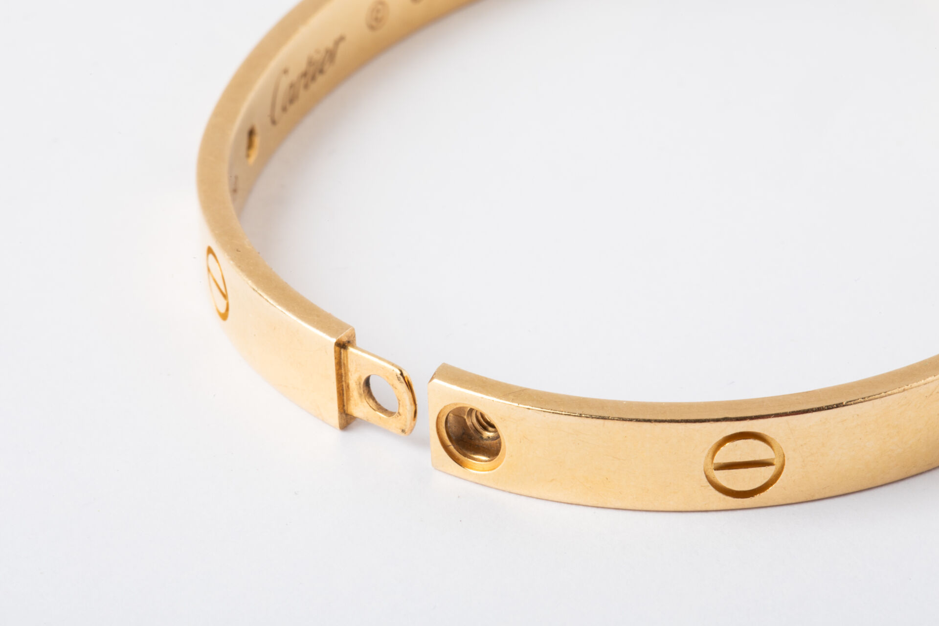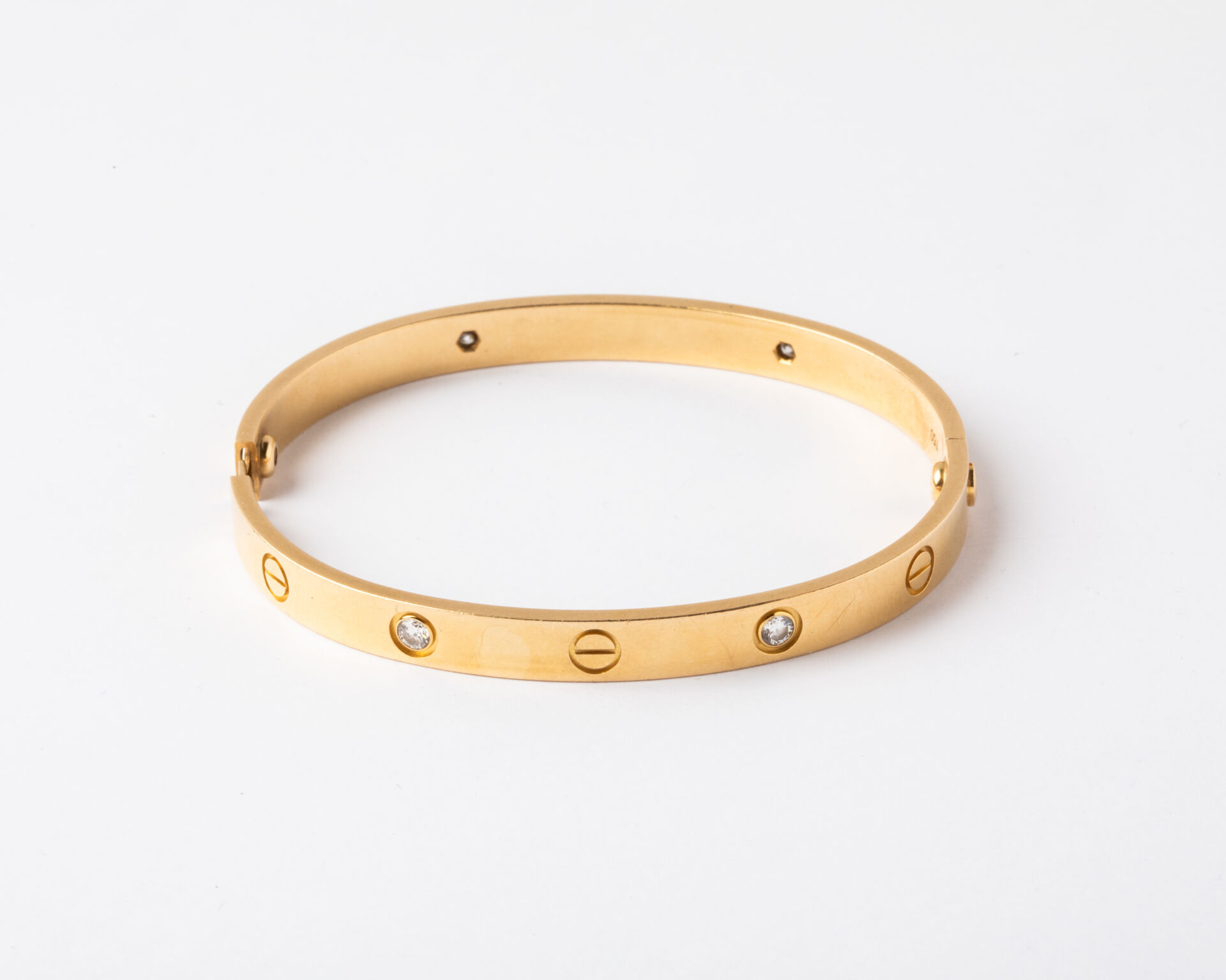 74 ESTIMATION: 1500 / 2000 € CARTIER, Paris Modèle Love – Bracelet en or jaune (750 millièmes) serti de quatre diamants de taille brillant Signé et numéroté OM340 Vis manquante, sans boîte Largeur : 60 mm Poids Brut : 32.4 g.