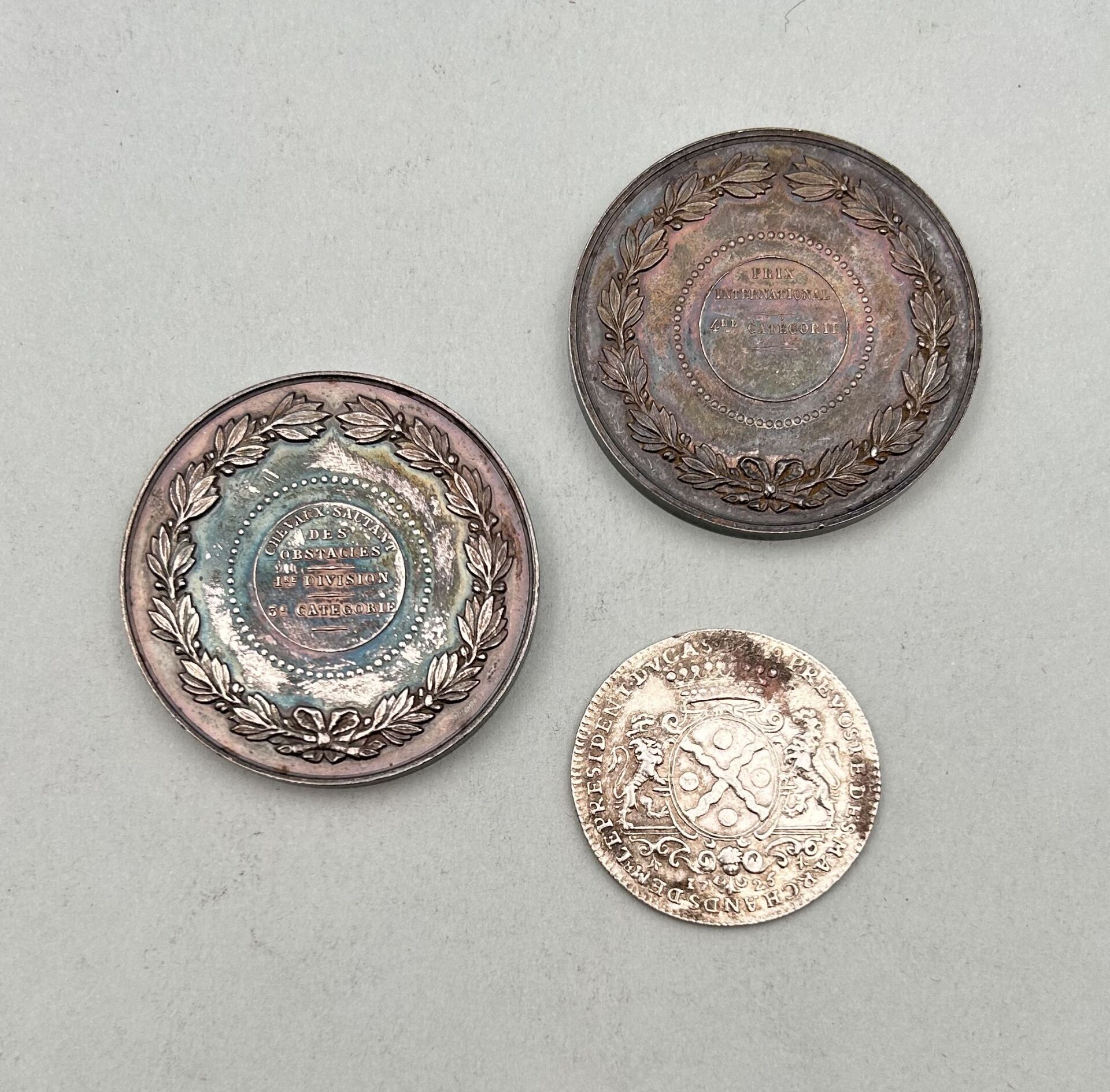 18 RÉSULTAT: 60 € ESTIMATION: 40 / 60 € Ensemble comprenant 2 médailles en argent de la Société Hippique et un jeton en bronze argenté pour Lyon Poids argent : 73 g