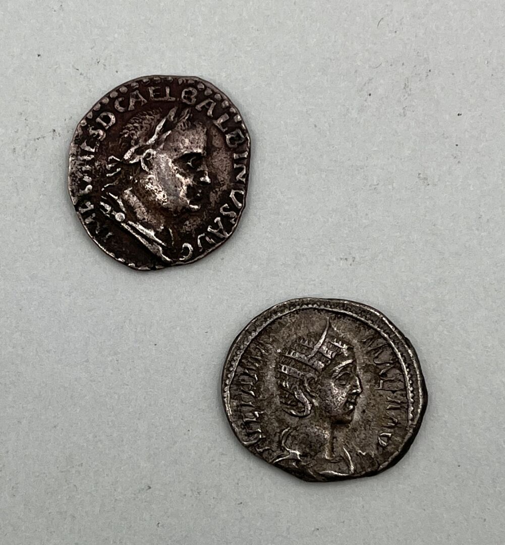85 ESTIMATION: 25 / 40 € EMPIRE ROMAIN Denier d’argent JULIA MAMAE et denier faux de BALBIN A étudier Poids : 7.3 g