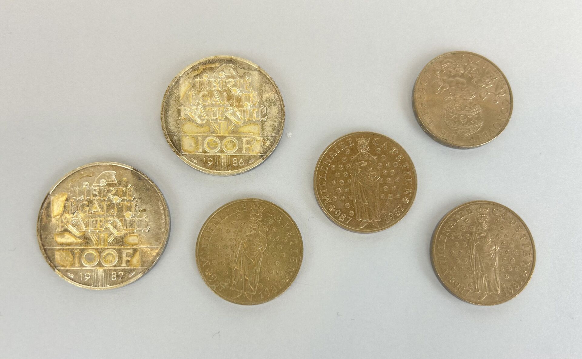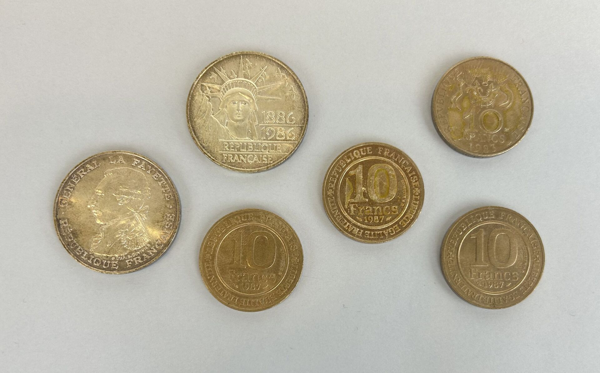 113 ESTIMATION: 20 / 30 € MONNAIES FRANCAISES – Deux pièces commémoratives de 100 F argent centenaire de la République Française et Général La Fayette On y joint 4 pièces de 10 francs commémoratives