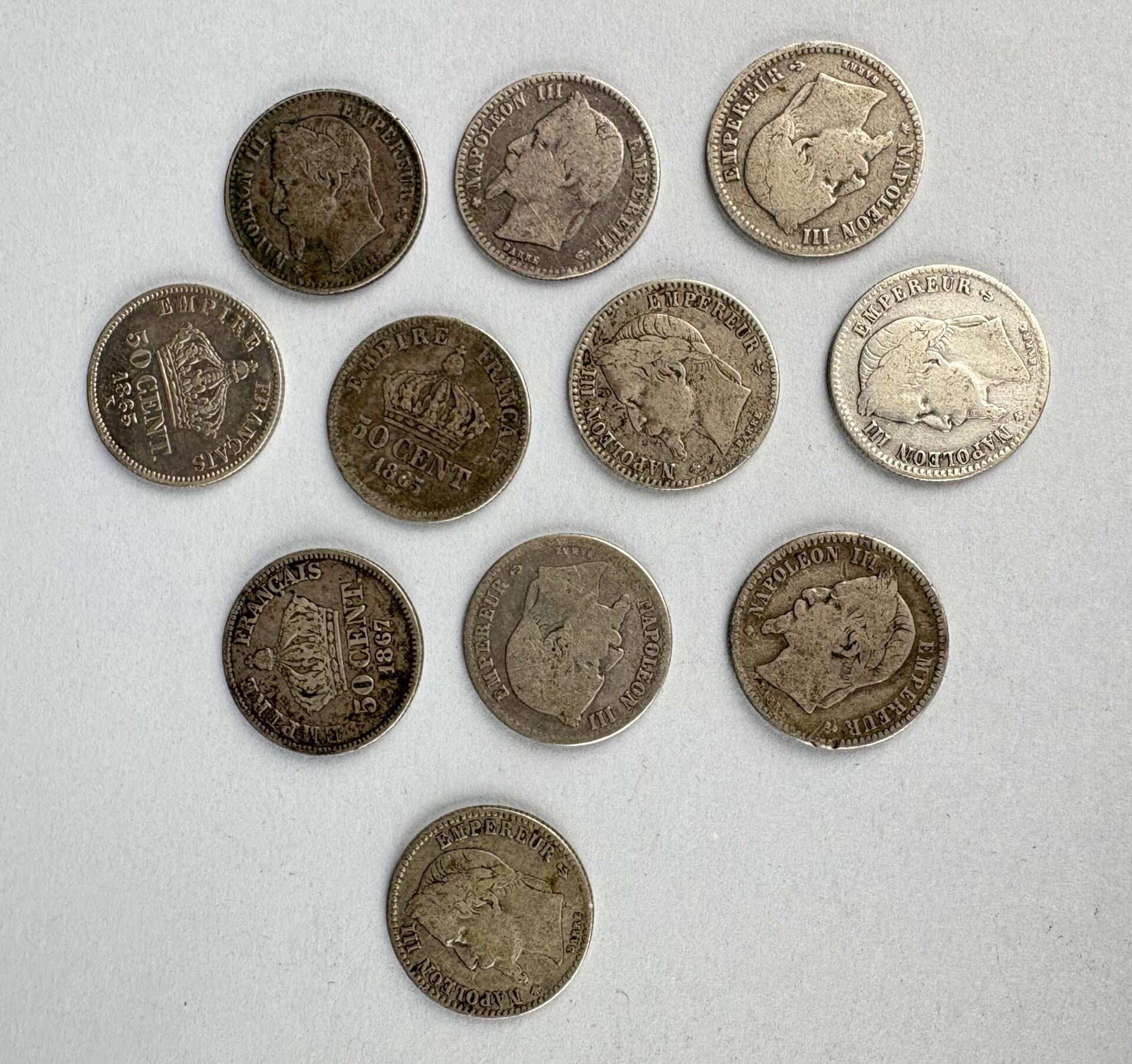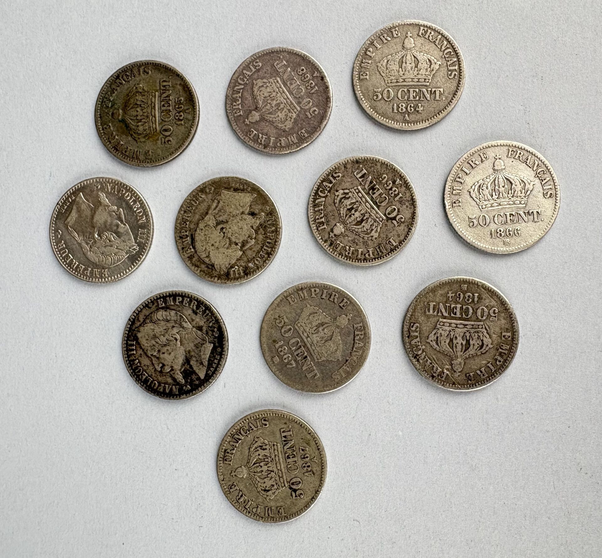 45 ESTIMATION: 50 / 90 € MONNAIES FRANCAISES MODERNES – 50 centimes argent Napoléon III, 11 exemplaires différents A étudier