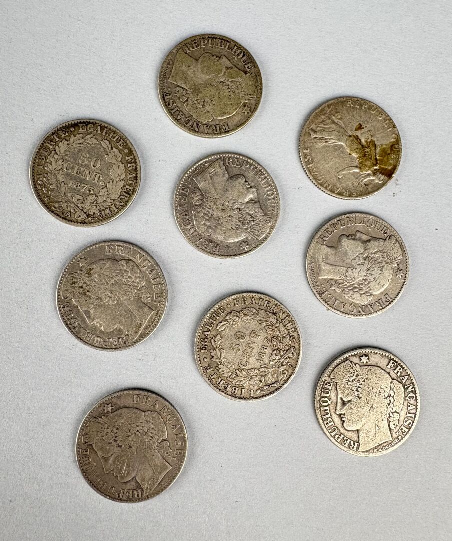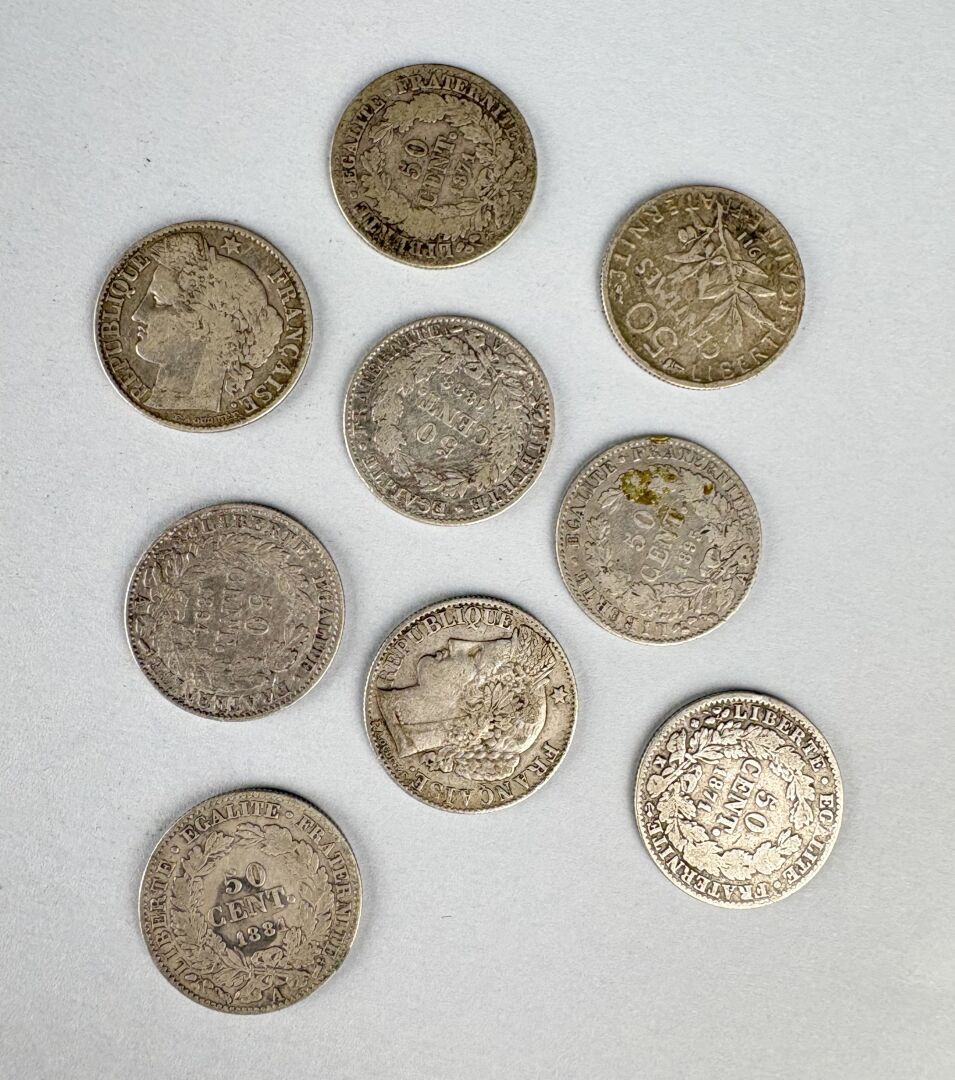 MONNAIES FRANCAISES MODERNES – 50 centimes argent Cérès Semeuse, lot de 9 exemplaires différents