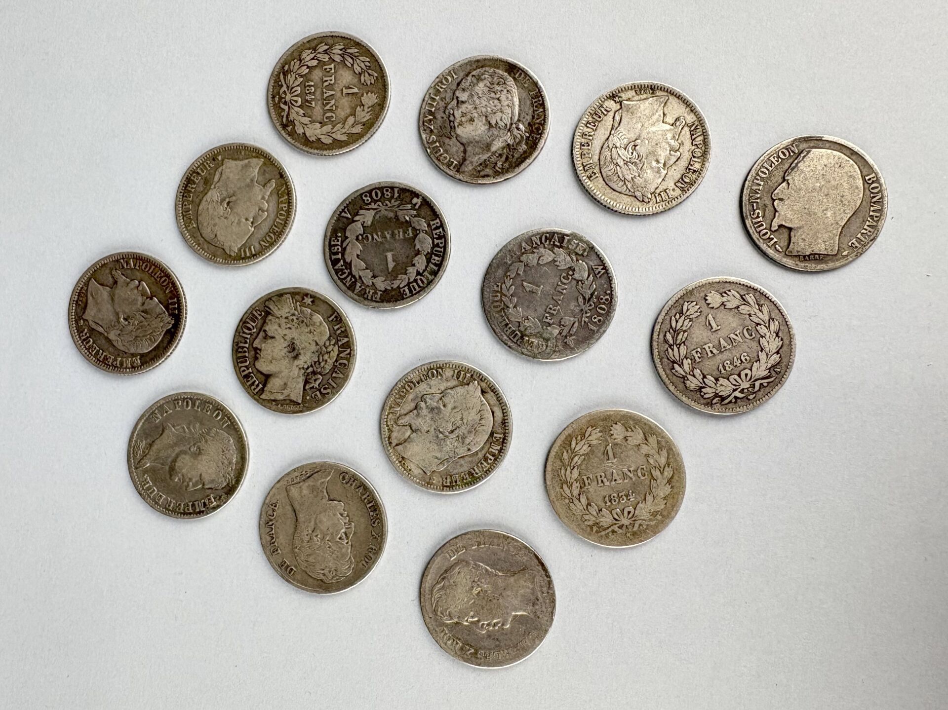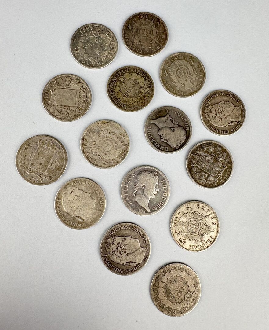 MONNAIES FRANCAISES MODERNES – 1 franc argent Napoléon Ier Louis XVIII etc, lot de 15 exemplaires différents