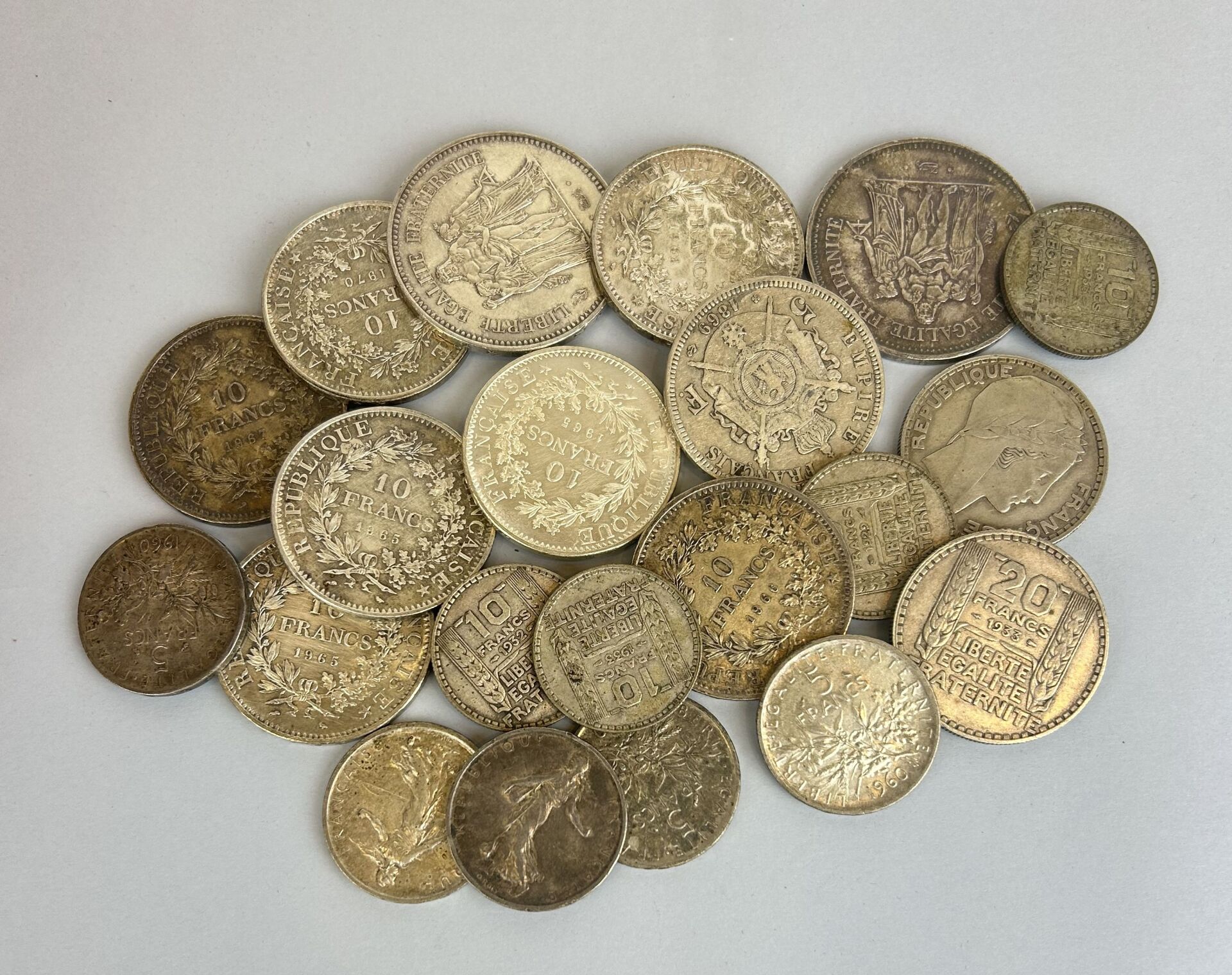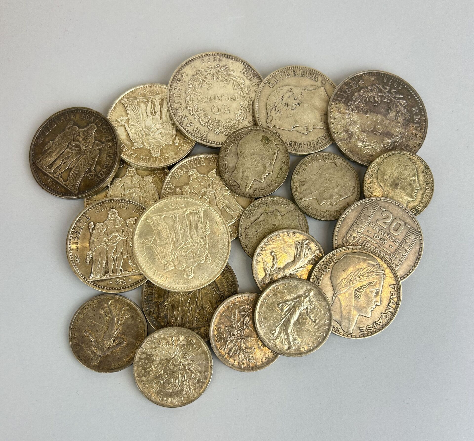 57 ESTIMATION: 200 / 300 € MONNAIES FRANCAISES MODERNES – Ensemble de pièces en argent dont 50F et 10F Hercule, francs Turin, 5F semeuse, 5F Napoléon III Poids : 398 g.