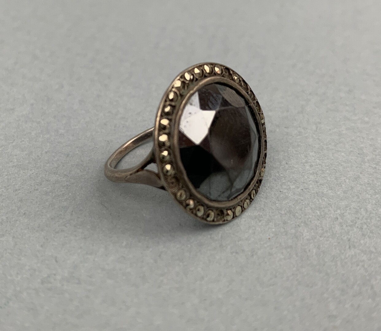 121 ESTIMATION: 10 / 15 € Bague en argent sertie d’une hématite taillée à facettes dans un entourage de petites hématites (manques) Poids : 5.5 g.