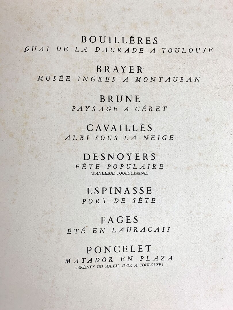 CAVAILLES « Albi sous la neige », DESNOYERS « Fête populaire », Raymond ESPINASSE « Port de Sete », Arthur FAGES « Ete en Lauraguais », PONCELET « Matador en Plaza », Yves BRAYER « Musée Ingres à Montauban »