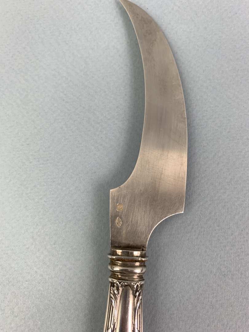 75 RÉSULTAT: 40 € ESTIMATION: 30 / 50 € Couteau de service, de style Art Nouveau, poinçon minerve, poinçon de maître AD Poids brut 57.6 g