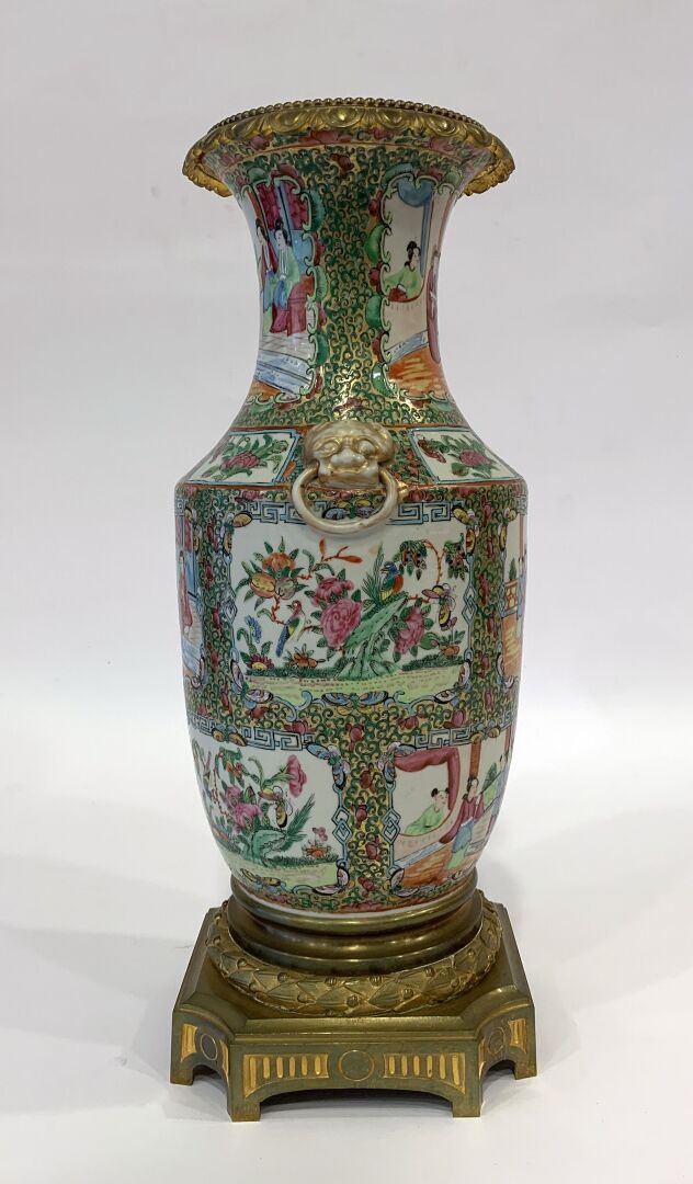 Vases de forme balustre en porcelaine de Canton à décor d’émaux dans le goût de la famille rose de scènes de personnages sur fond de végétaux verts et or, des têtes de lions ornent la base du col, monture en bronze doré,